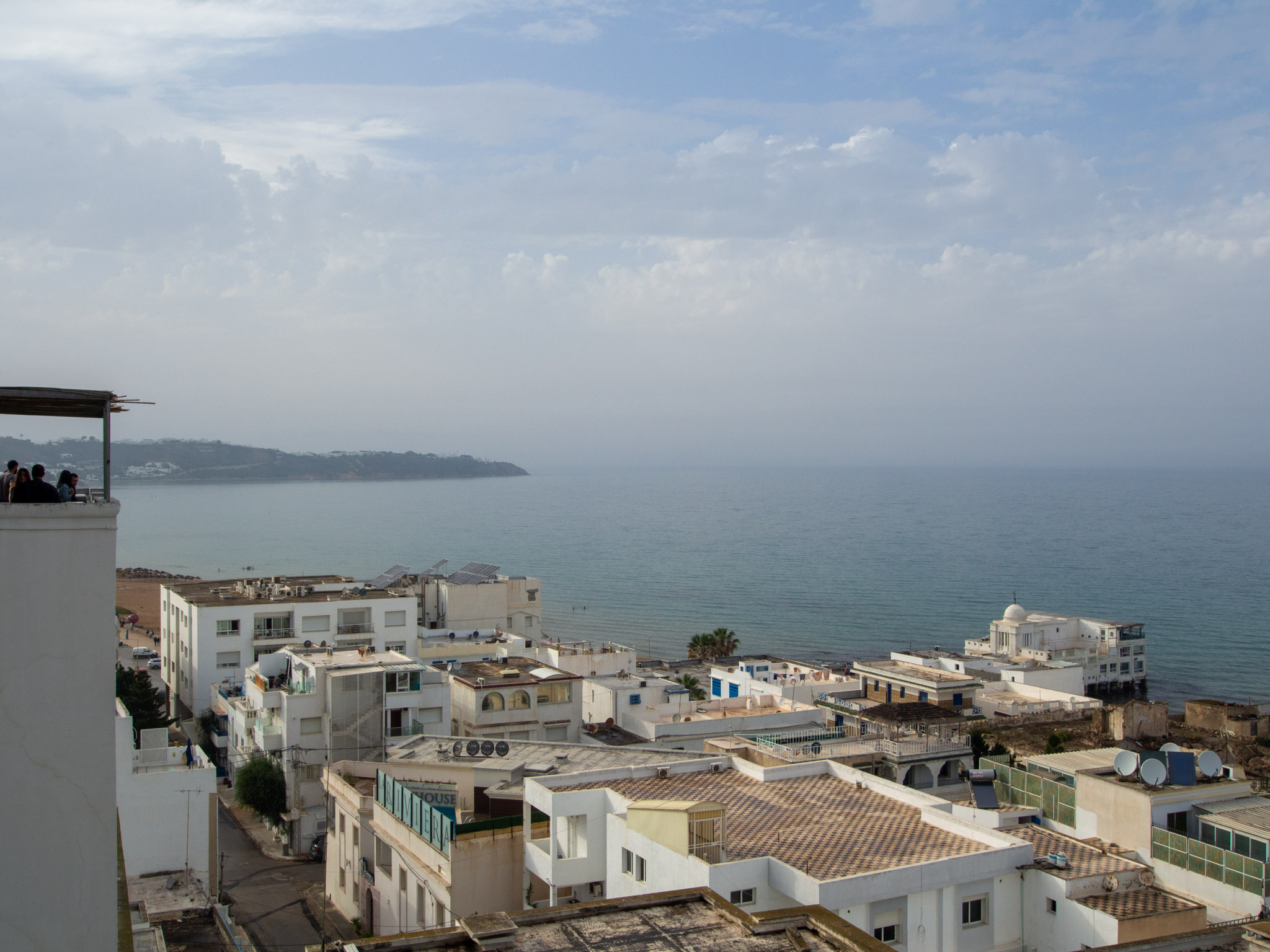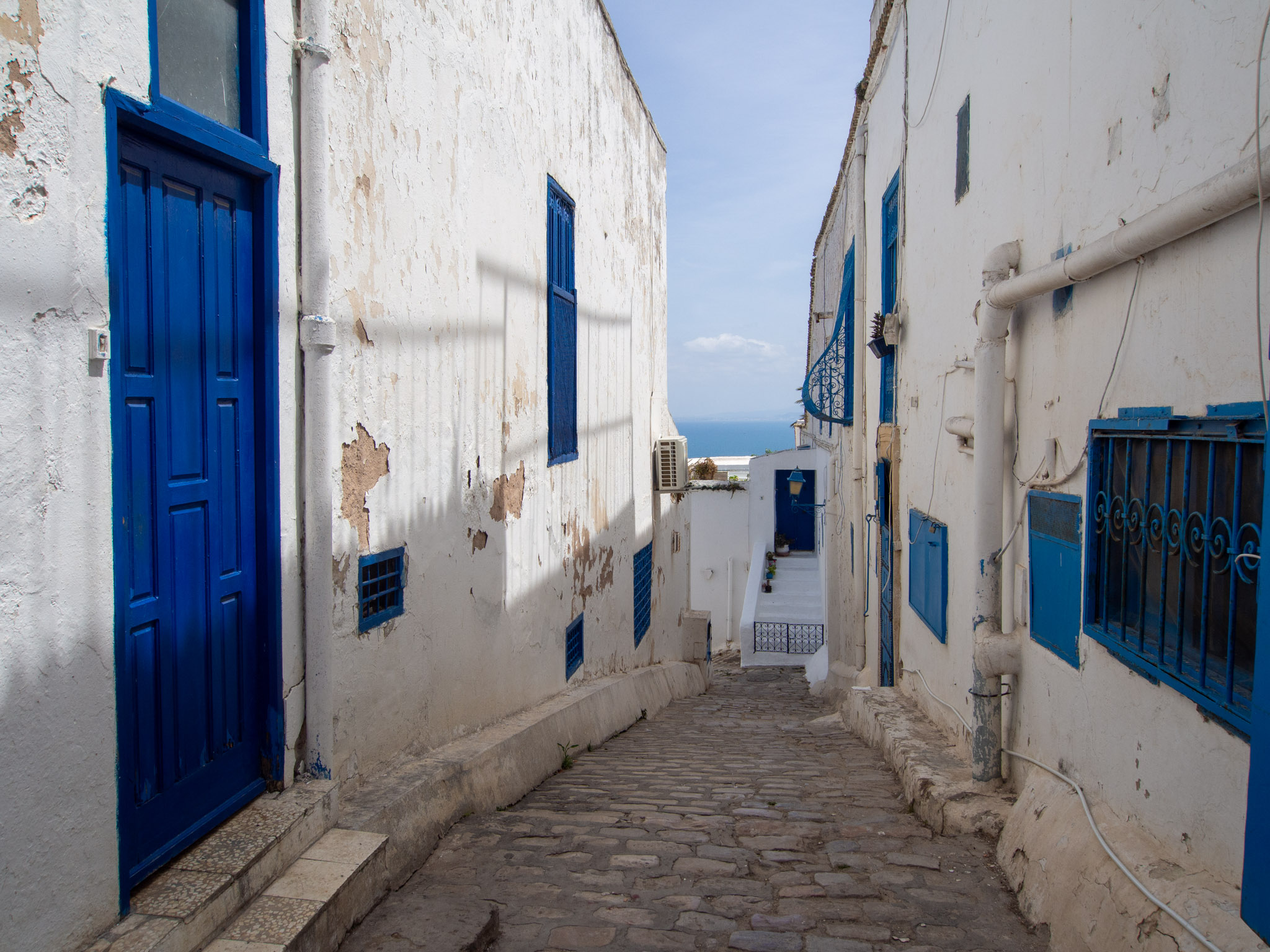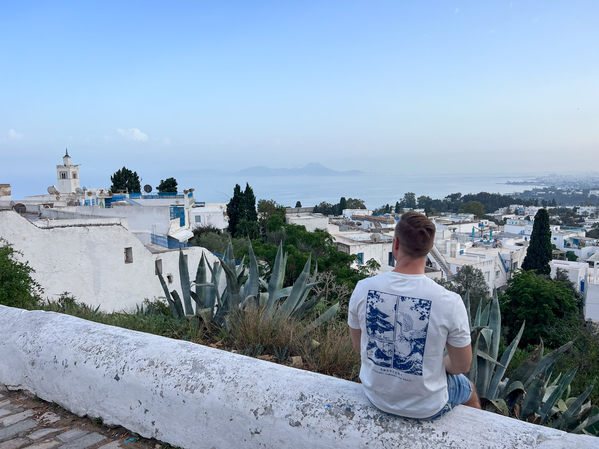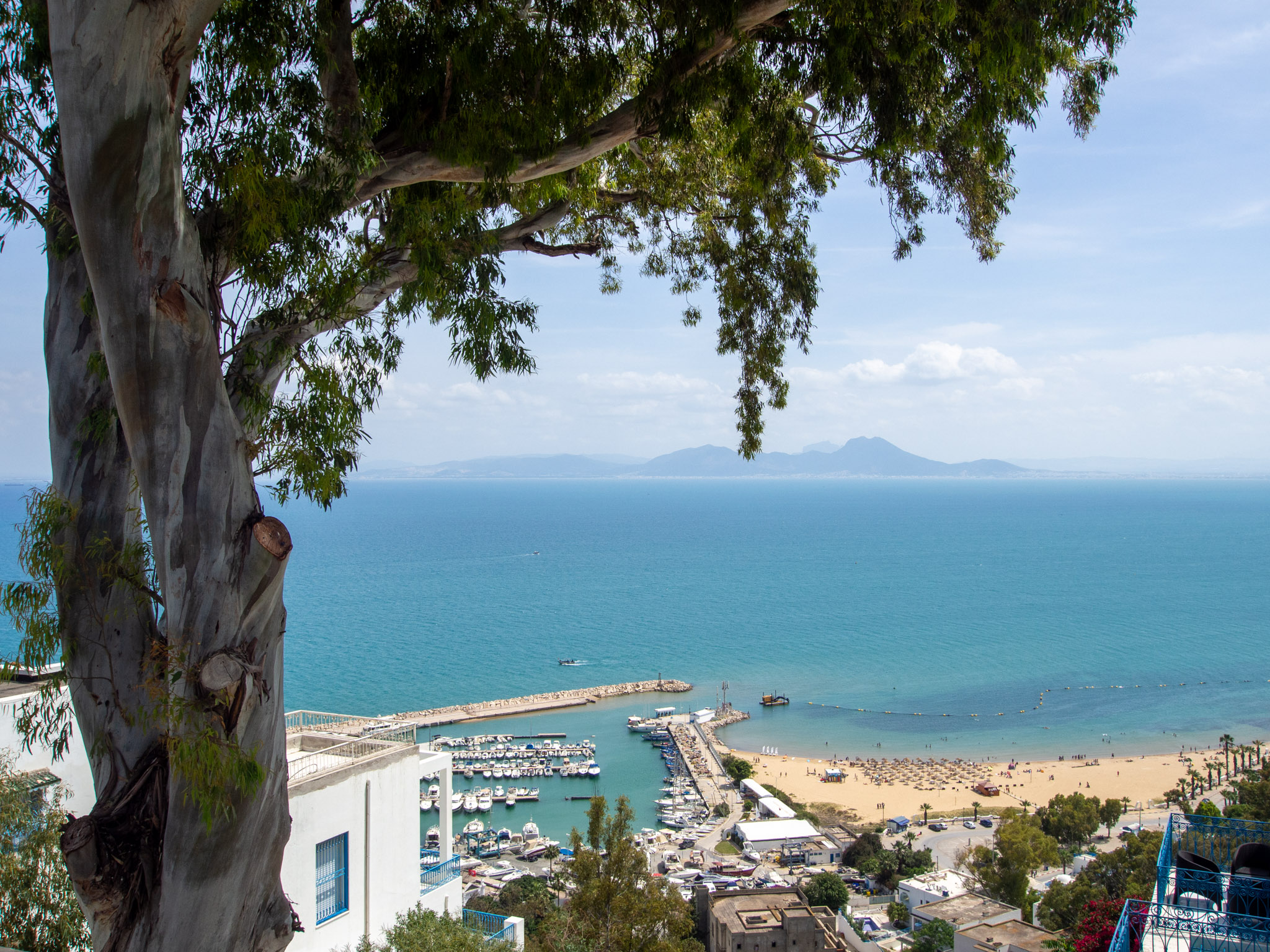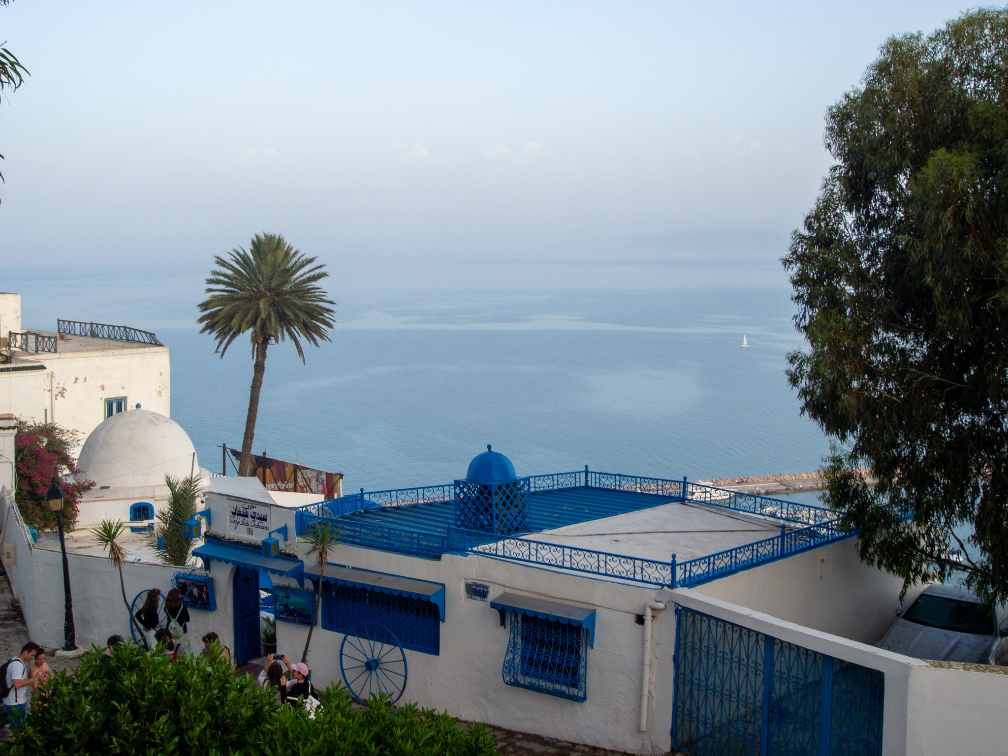 Depuis le haut du village, on domine les toits blancs et la mer, on peut même apercevoir les immeubles de Tunis au loin.