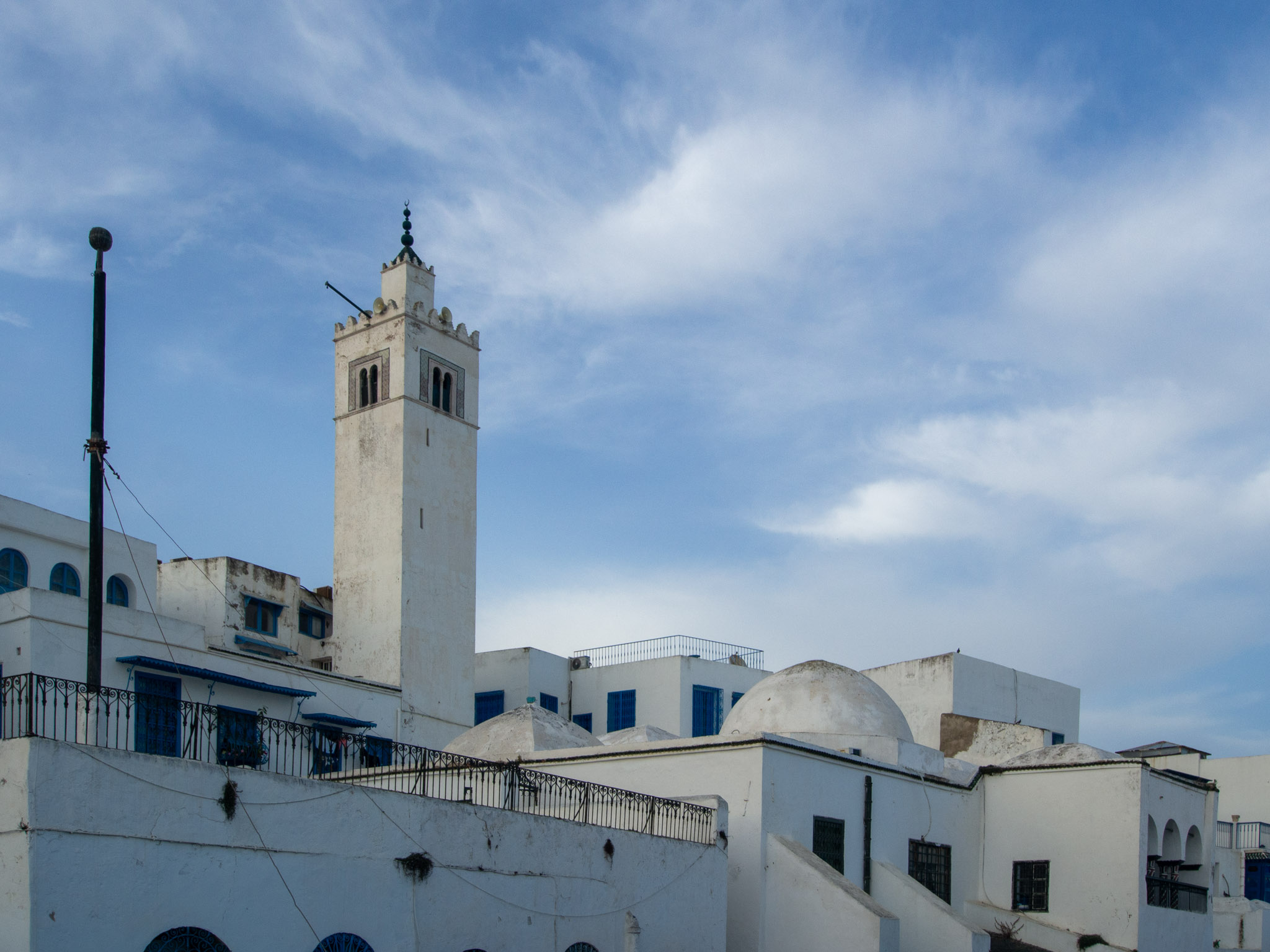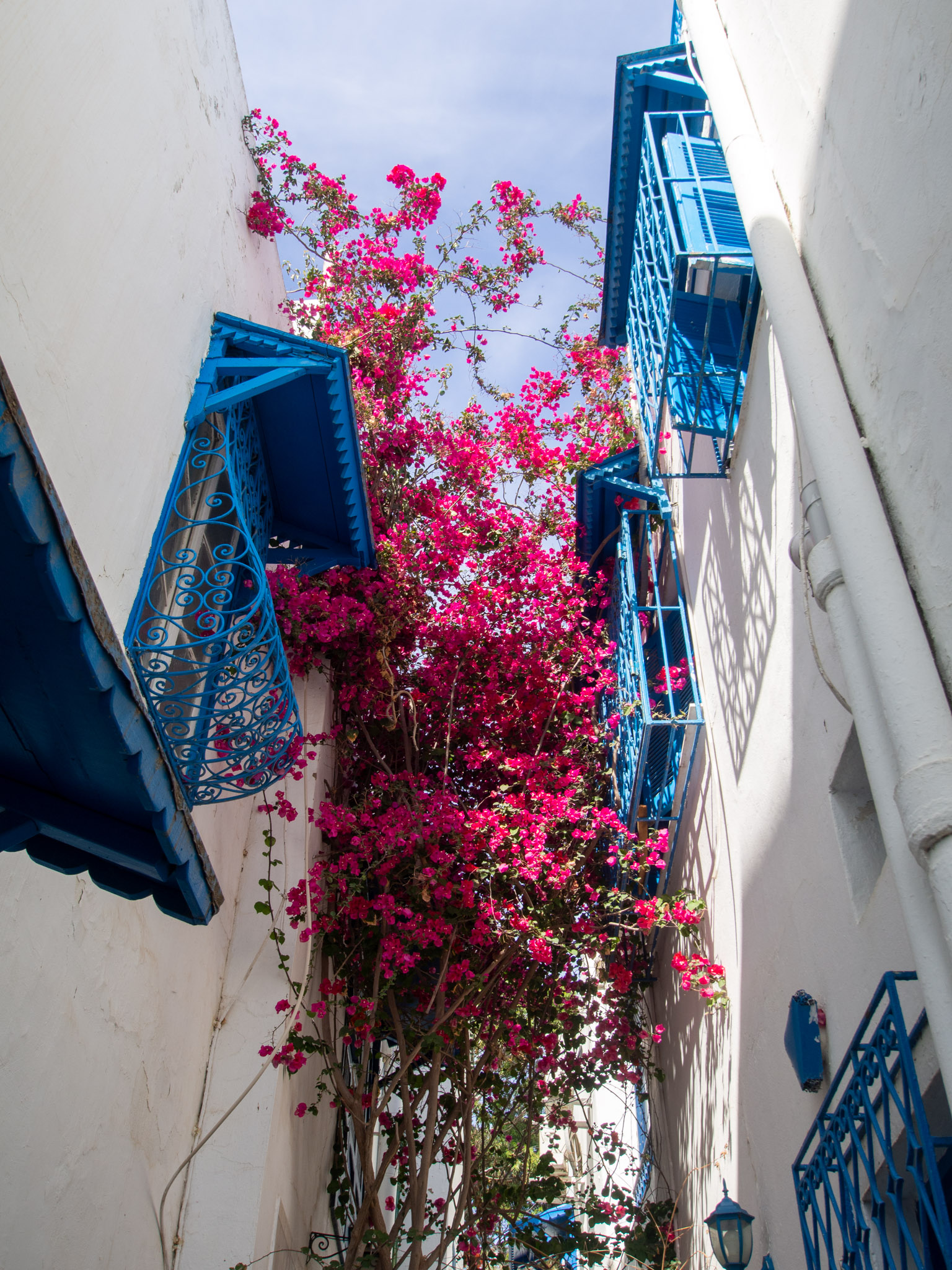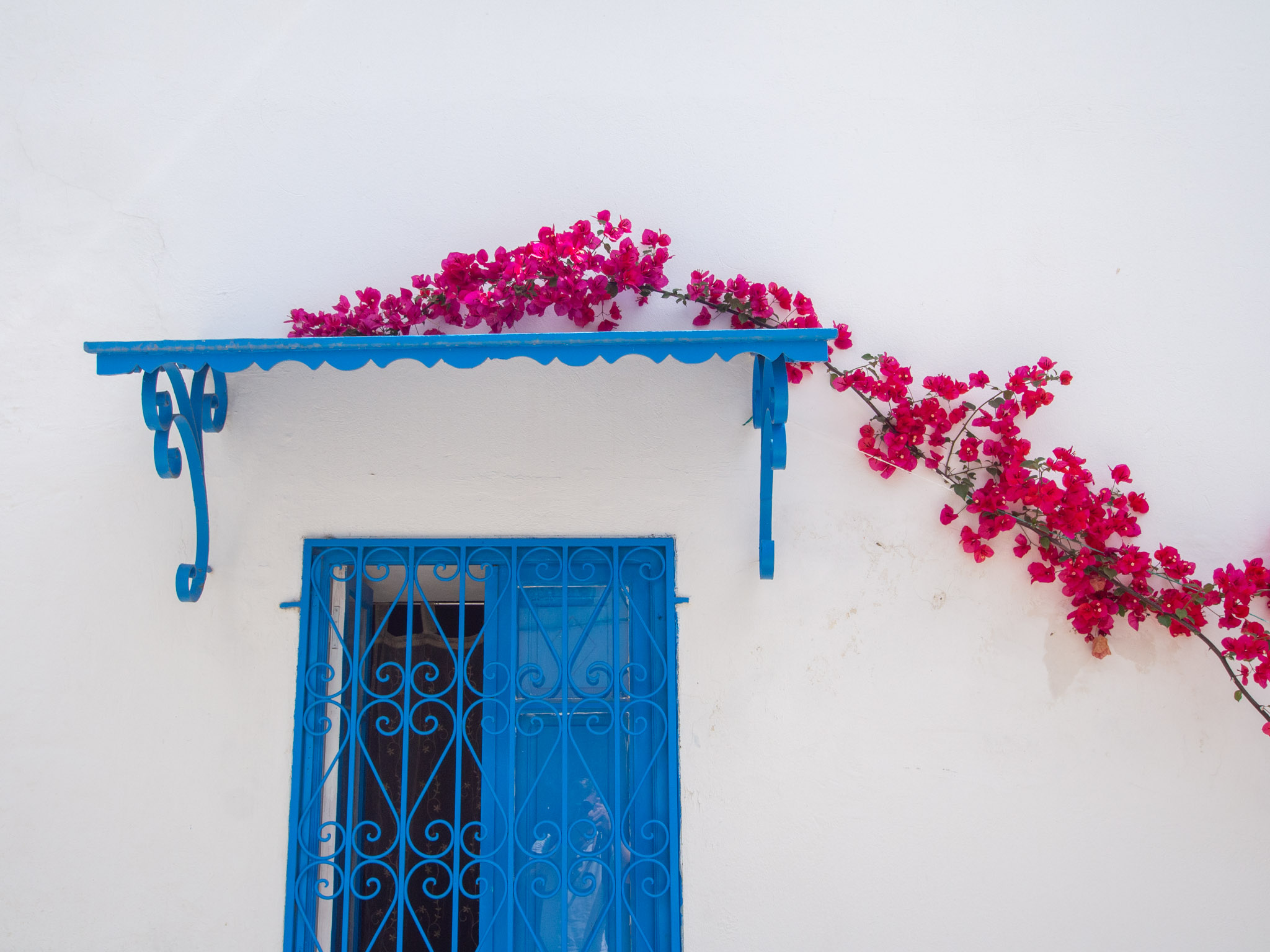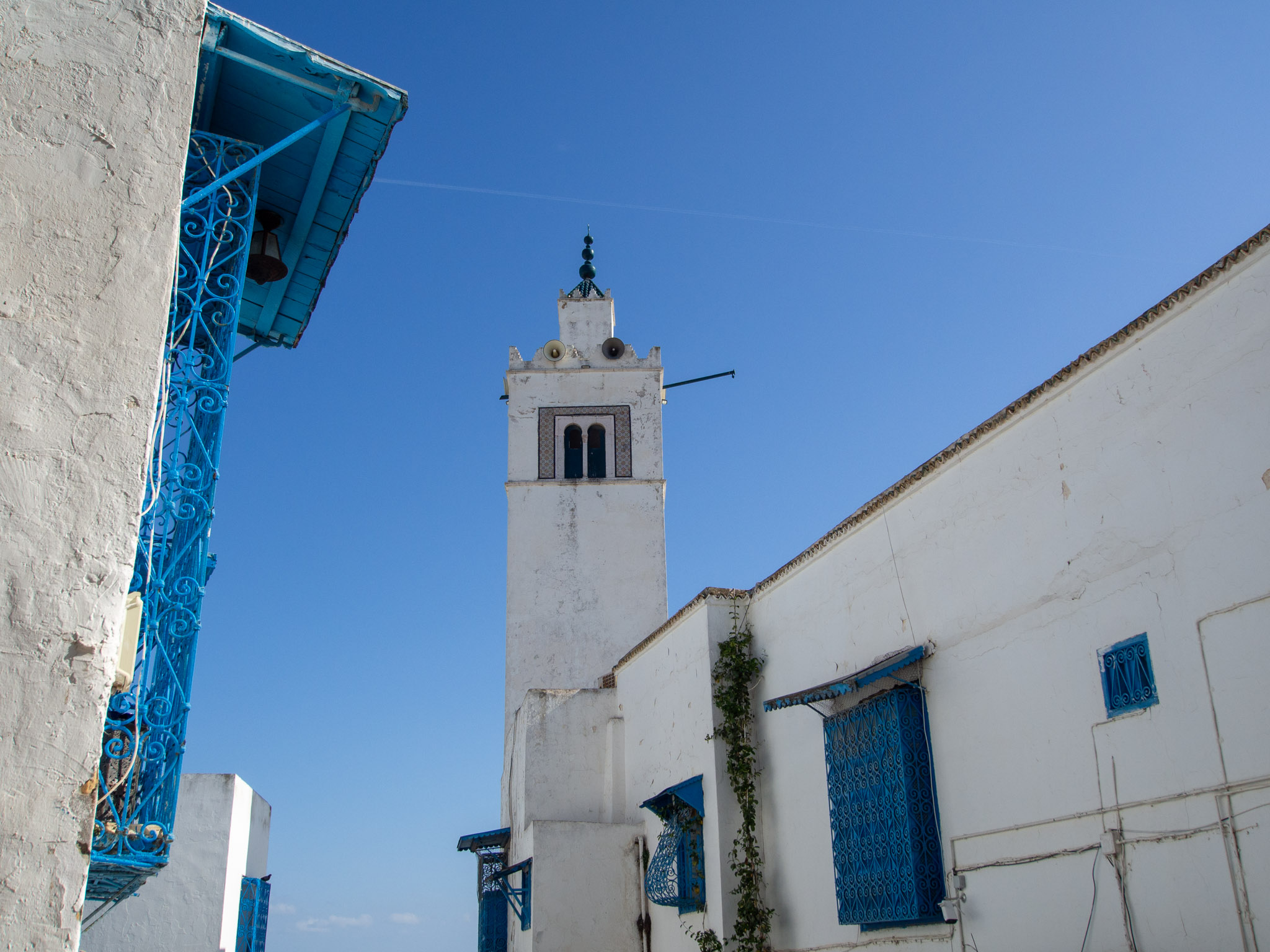 Sidi Bou Said a des airs de Santorin, avec ces maisons peintes en blanc et volets bleus. Ici les bulbes des églises orthodoxes sont remplacées par le minaret de la mosquée.