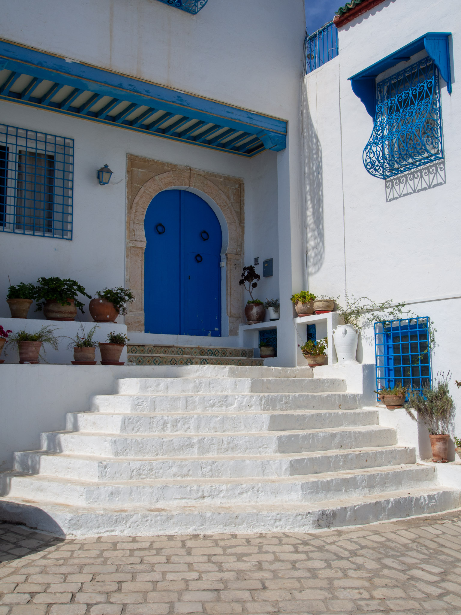 Depuis le centre ville de Tunis, on prend le TGM pour rejoindre les faubourgs Est de la ville. Ce train qui a le poids des âges sur les épaules, c’est une sorte de train de banlieue qui relie les quartiers de Carthage, Sidi Bou Said et La Marsa en à peu près une heure. Le prix du ticket est imbattable et pour quelques dinars on embarque sur un trajet qui suit le long du littoral. Le village de Sidi Bou Said est peint tout en blanc, cela commence dès la gare. Les ruelles du village sont immaculées avec de belles portes en bleues, une belle atmosphère méditerranéenne.