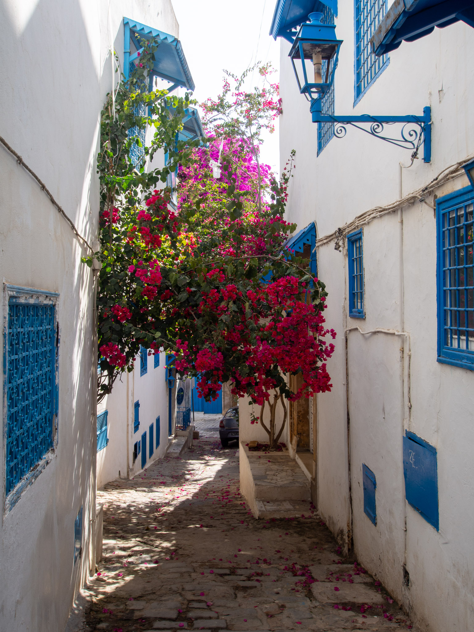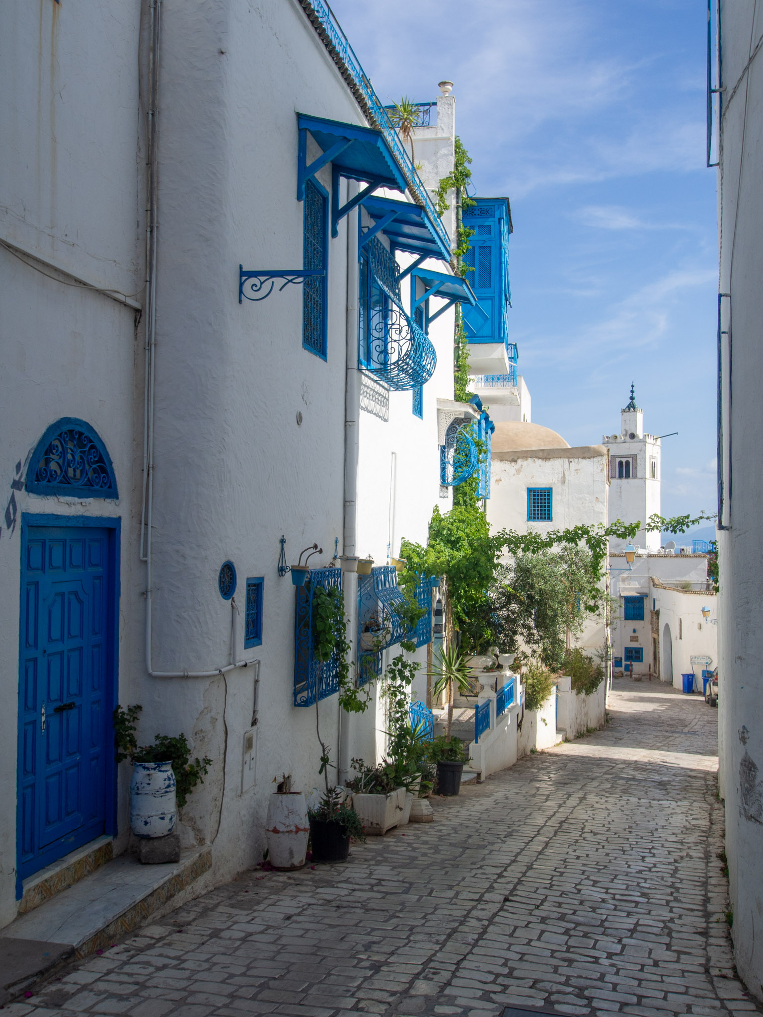 On est tombé sur le charme de ce village tellement mignon. Cette ruelle donne une très belle perspective sur le minaret de Sidi Bou Said.