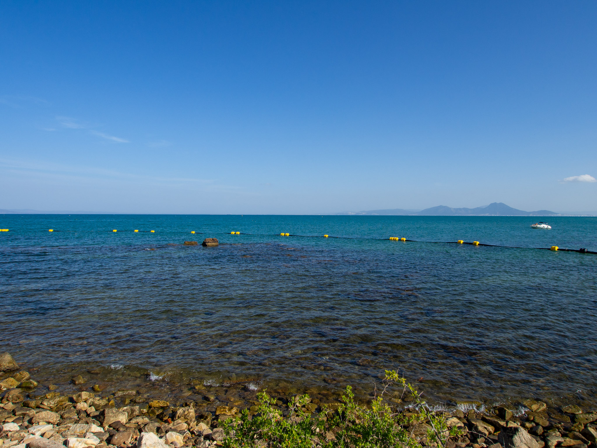 On descend le chemin qui rejoint le bord de mer, avec une plage de sable très agréable et des zones de rochers à l’eau très claire.