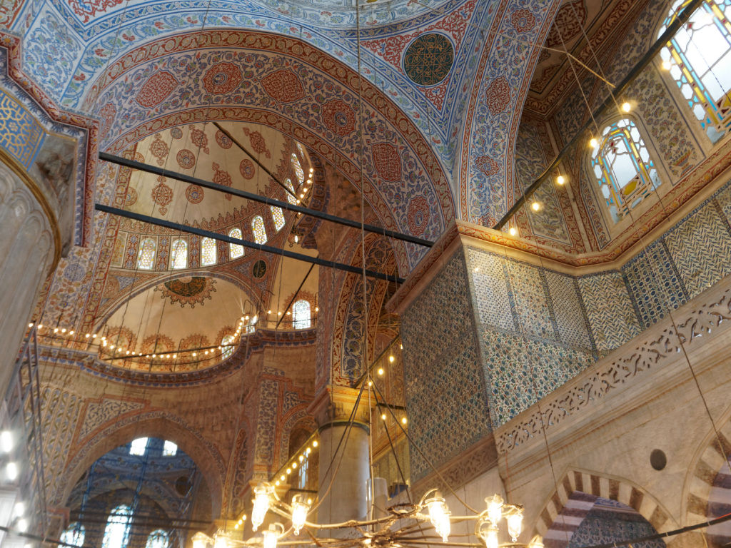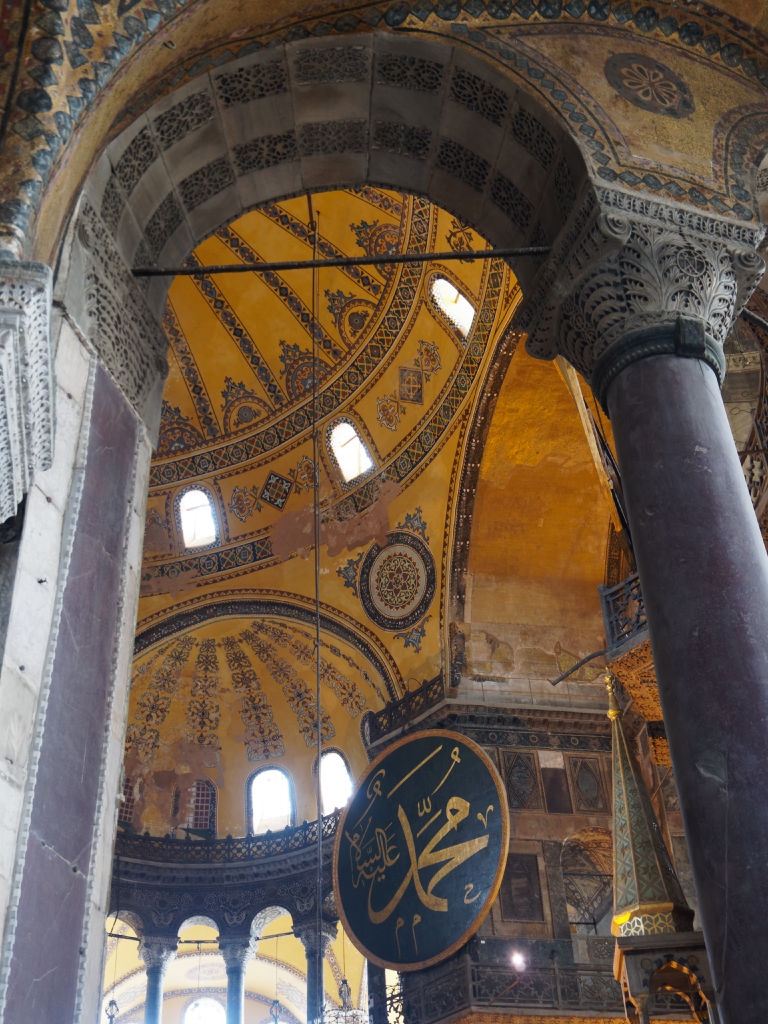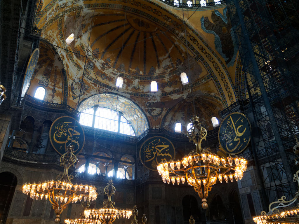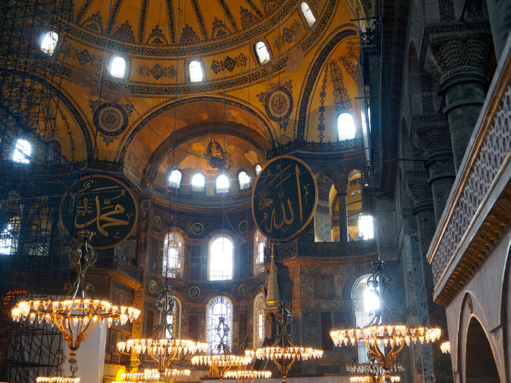 L’intérieur de Sainte Sophie est encore en travaux lors de notre passage, mais on peut quand même admirer cette double décoration d’abord chrétienne puis musulmane. On est ici à Istanbul à un carrefour des grandes civilisations, des continents et des religions monothéistes, et rien ne résume cette position que la majesté de Sainte Sophie.
