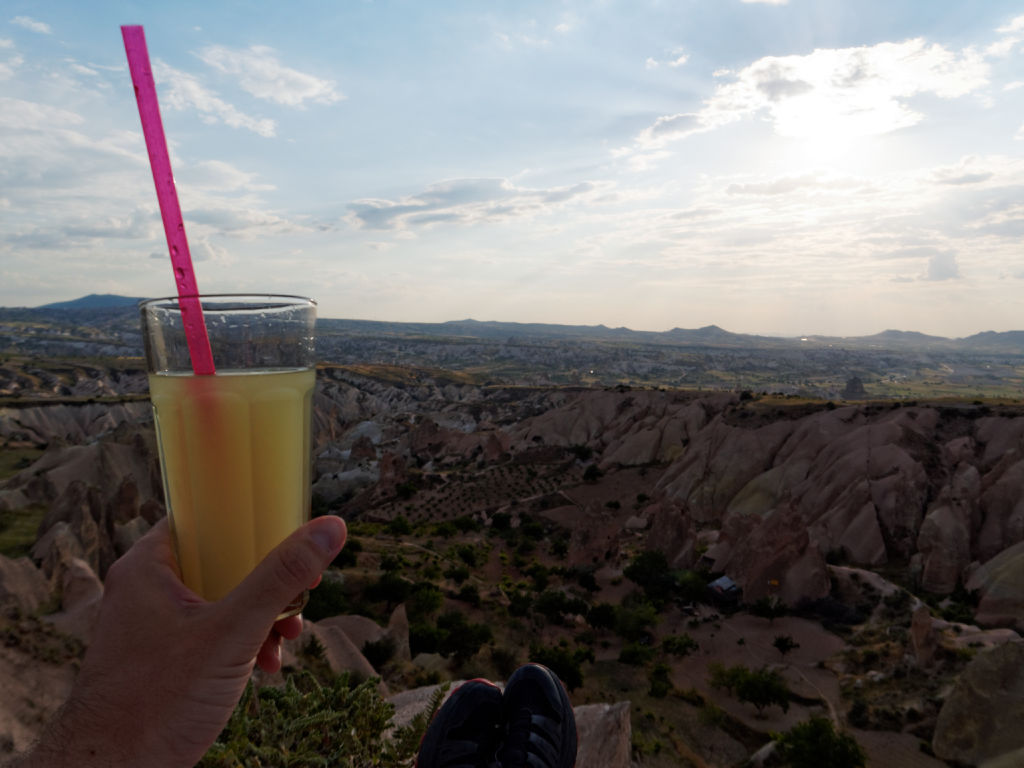 Ce soir, on cherche un endroit pour diner à proximité de notre. Le patron nous conseille un restaurant d’Uchisar pas très loin. En fait, il faut savoir qu’il n’y a quasiment pas de vie dans ce village, il semblerait que toute l’animation se concentre à Goreme plutôt. En cherchant le restaurant qui se trouve être fermé, on continue quand même de marcher sur cette route mais on est obligé de rebrousser chemin car deux chiens très énervés n’ont pas envie de nous laisser passer. On tombe sur un joli point de vue sur le fort. Ici un vendeur de glace est installé là, le pauvre il ne doit pas voir passer beaucoup de monde ici. On lui demande si il connait un endroit ouvert pour manger ce soir. Il nous conseille de continuer notre chemin jusqu’au bout du village, son cousin a un petit restaurant, on était donc dans la bonne direction vers le diner, le problème ce sont les deux chiens… On prend notre courage à deux mains et on contourne le plus possible les deux chiens qui ne cessent pas de nous aboyer dessus ; on fait semblant de ne pas avoir peur puis finalement ils ne nous ont pas attaqué, et on a pu passer. Ouf, on trouve le restaurant de chez Eddy qui est désert. Eddy est très heureux de voir des clients, nous serons les seuls et il nous sert un repas gargantuesque. Son accueil vraiment original – il met le son à fond pour nous et il va chercher des fruits pas encore murs sur son arbre fruiter pour nous les faire gouter – nous donne envie de nous poser et de ne plus bouger, de rester ici à profiter de la vue sur le fort et des histoires un peu folles que nous racontera Eddy.