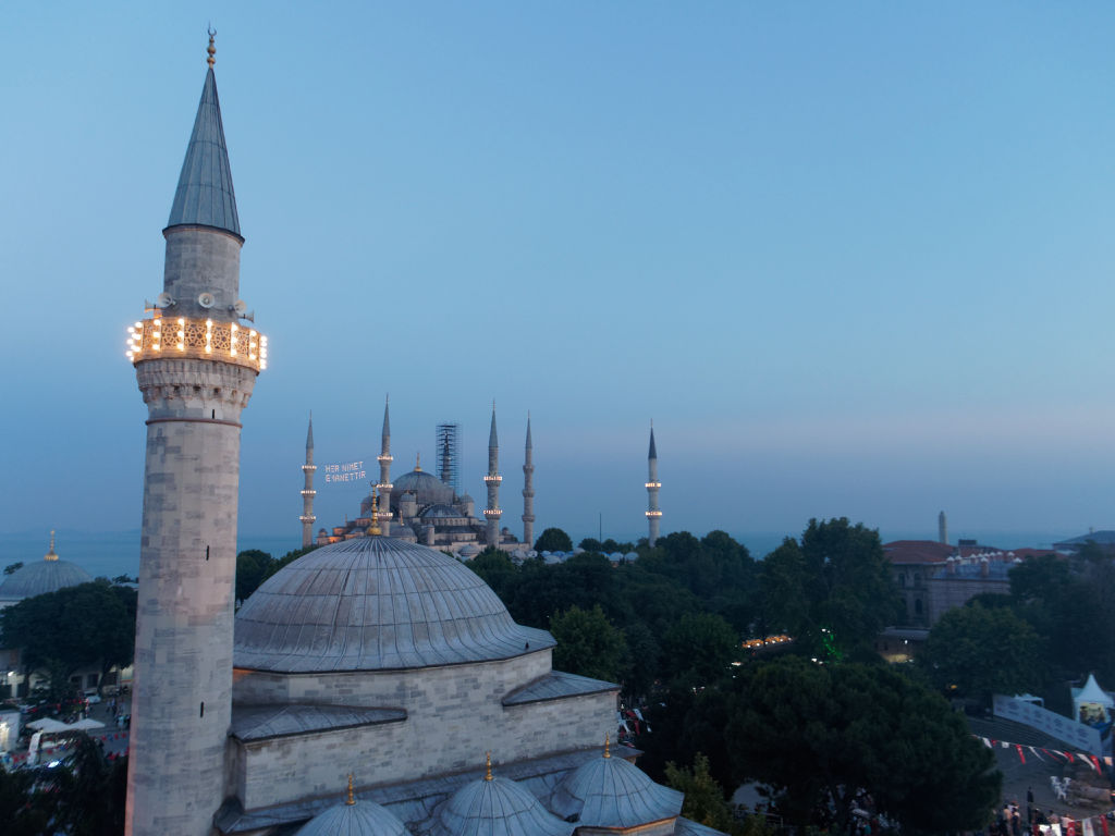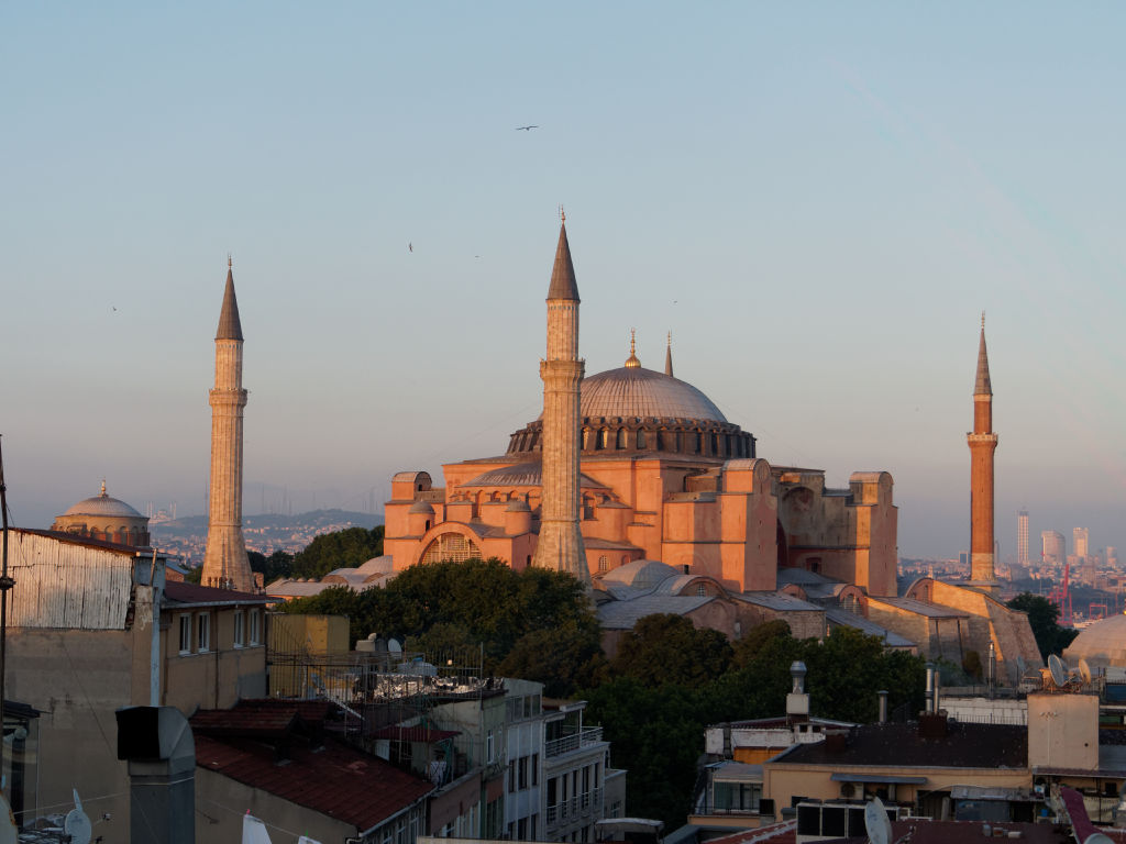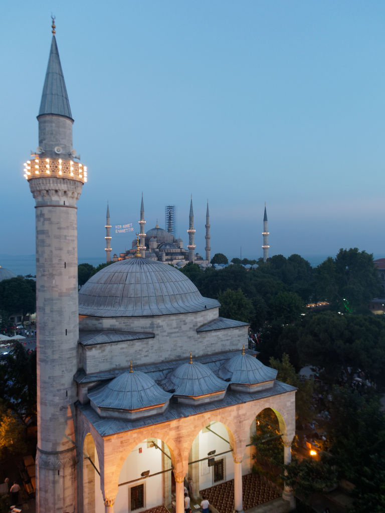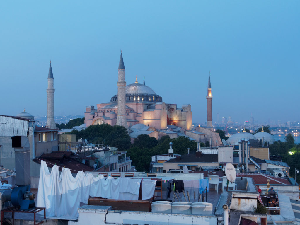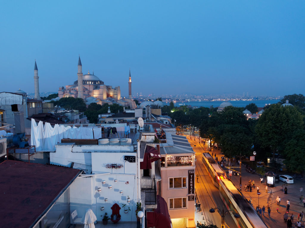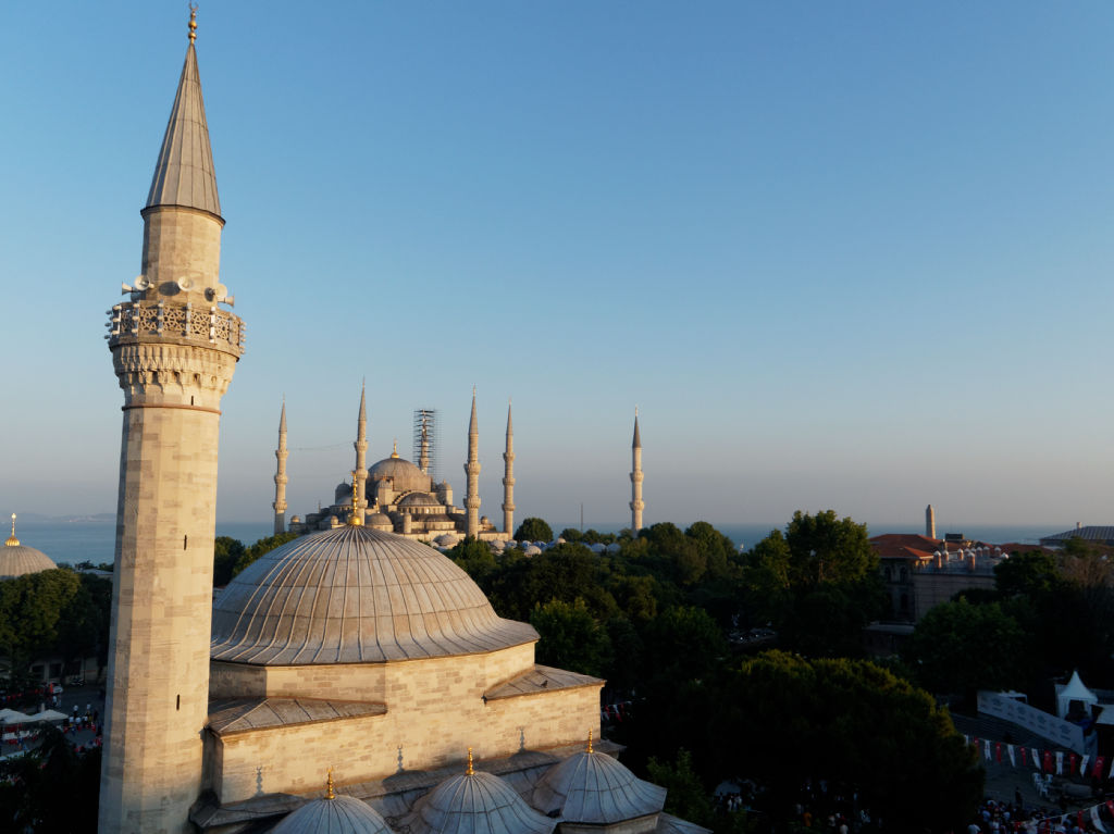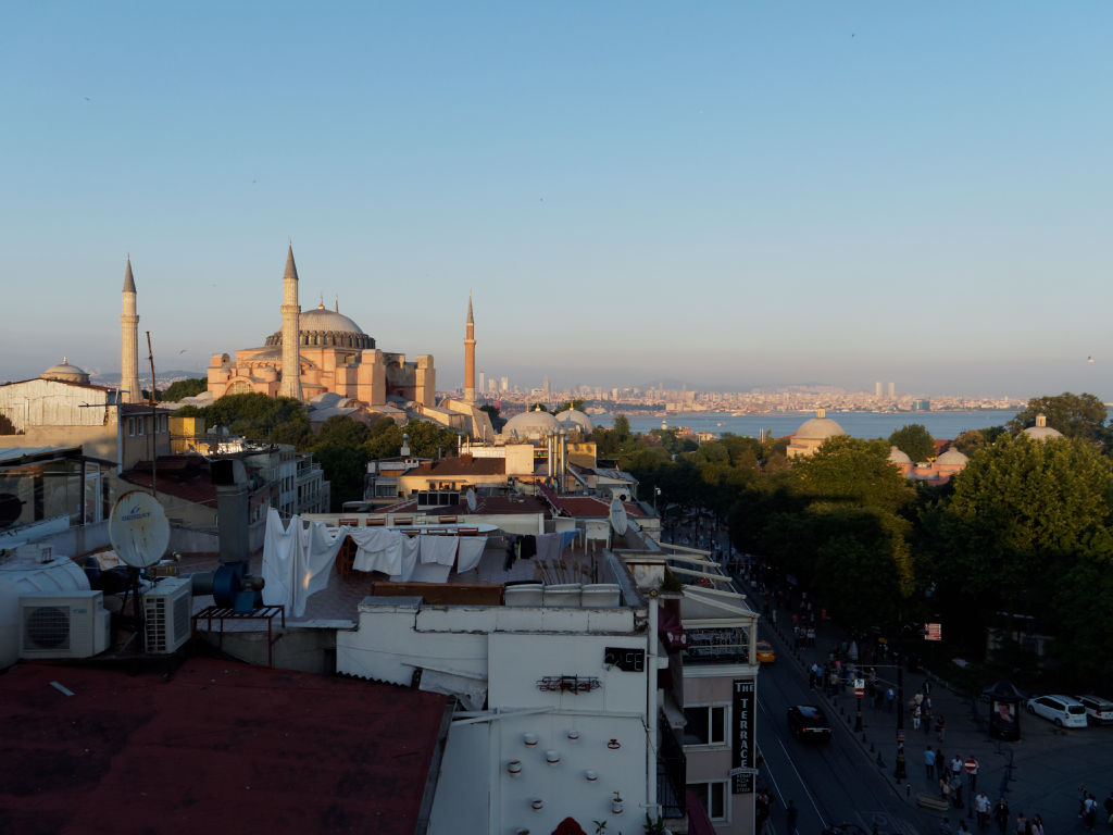 Sur place, on se met en tête de chercher un point de vue qui domine la place, on fait le tour du quartier et on trouve finalement un hotel qui accepte de nous laisser monter à son bar qui a une terrasse avec une vue incroyable, en échange de consommation. Le lieu est tellement magique, la vue embrasse parmi les plus beaux monuments de la ville, de Saint Sophie, au Bosphore, la partie asiatique d’Istanbul et la mosquée Bleue.