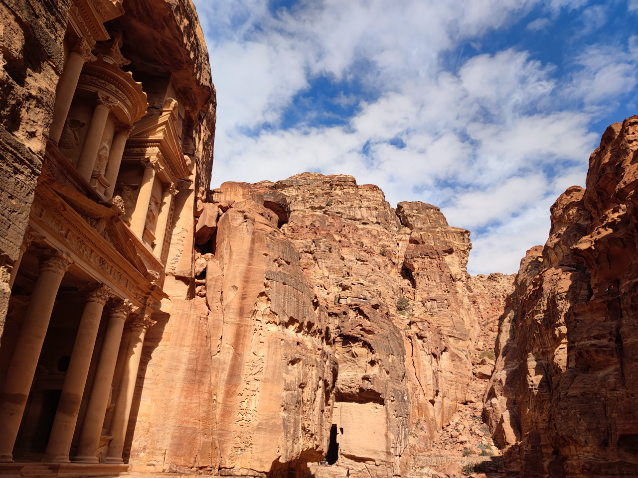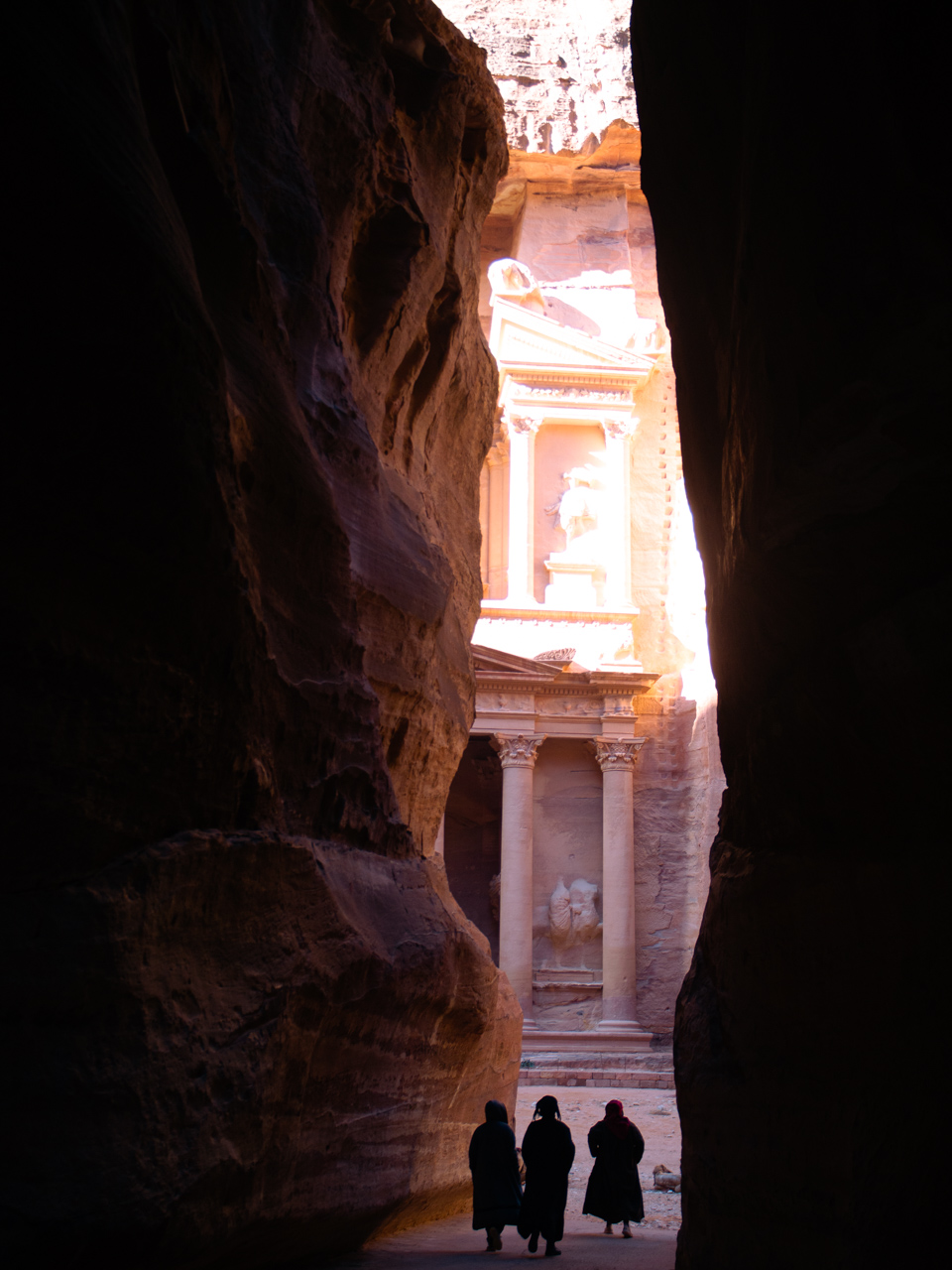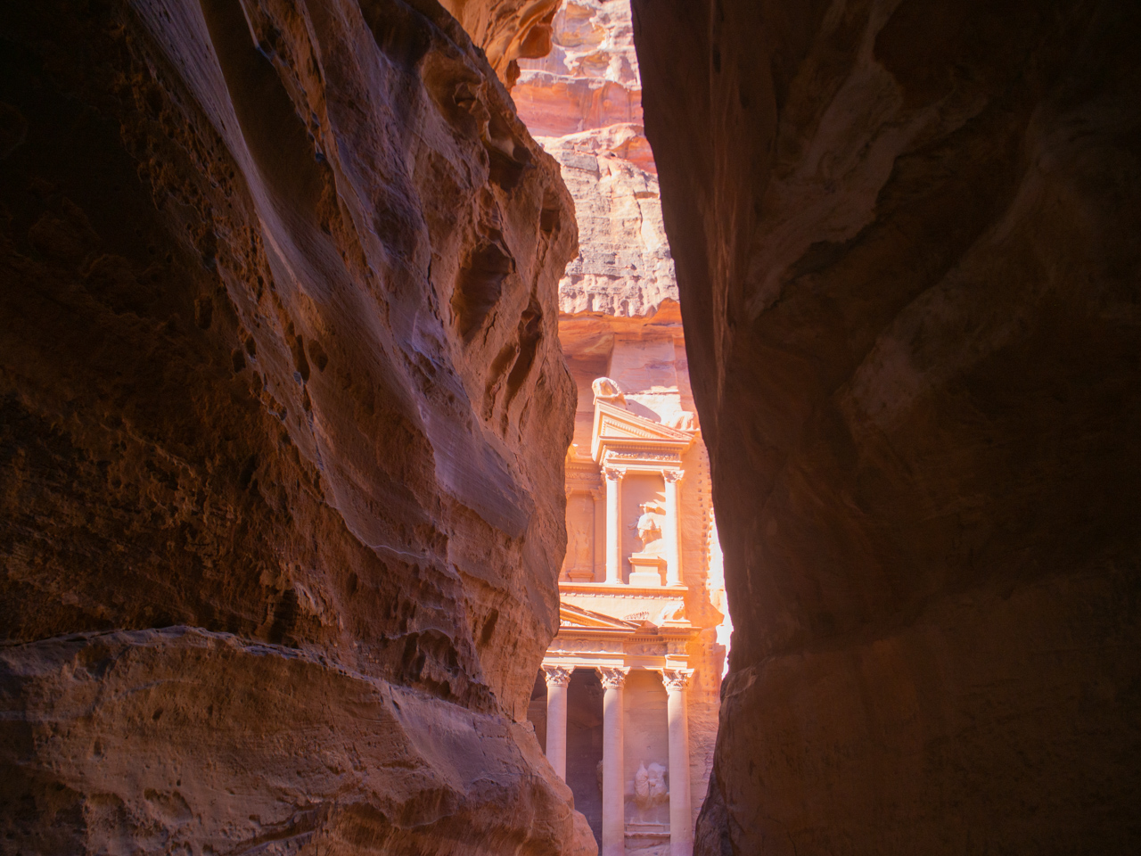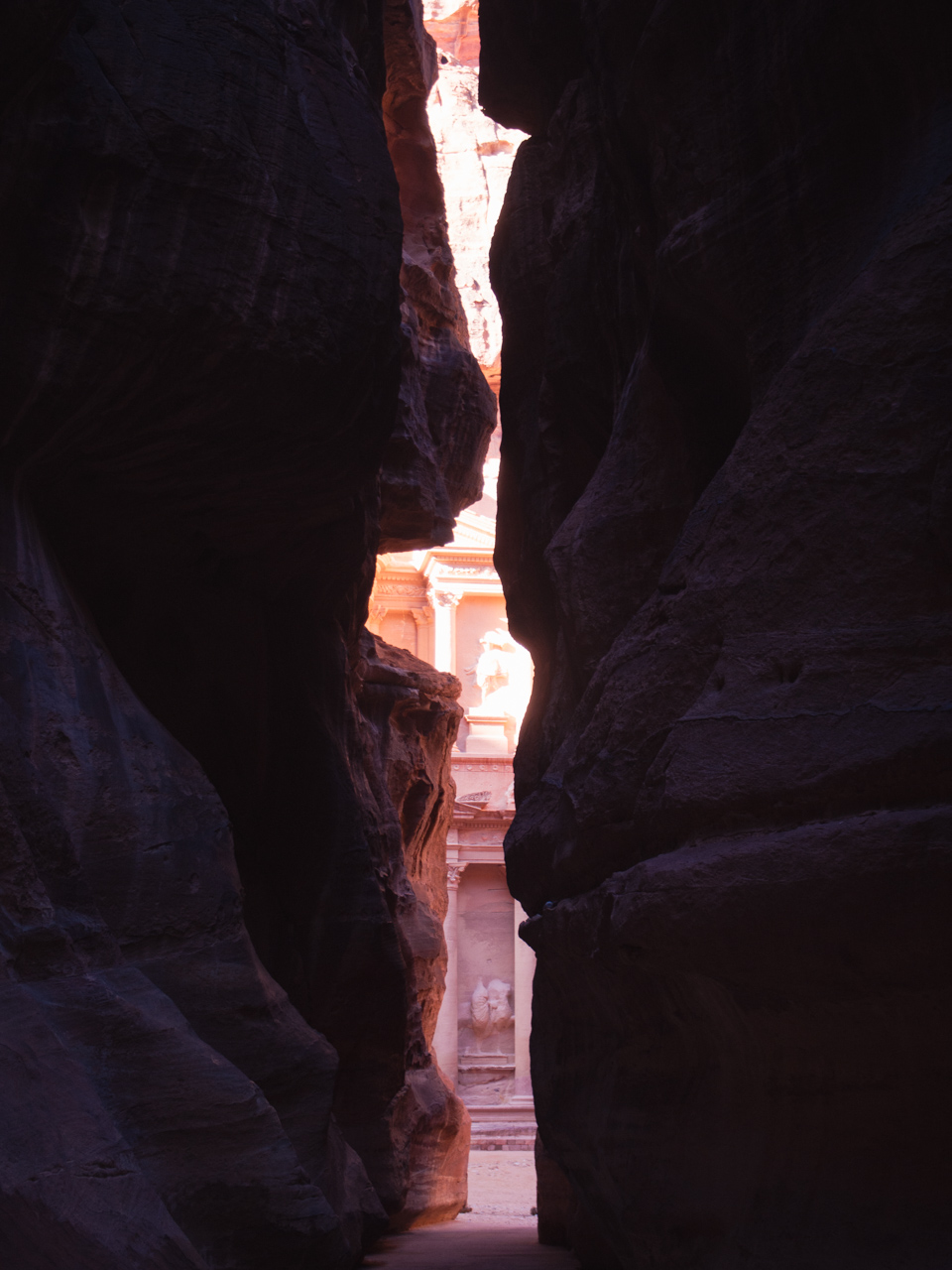 A la fin du Siq, on se dévoile les colonnes du monument le plus impressionnant de Pétra, le trésor, un grand temple taillé dans la roche nous fait face.