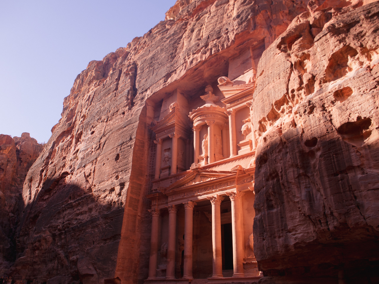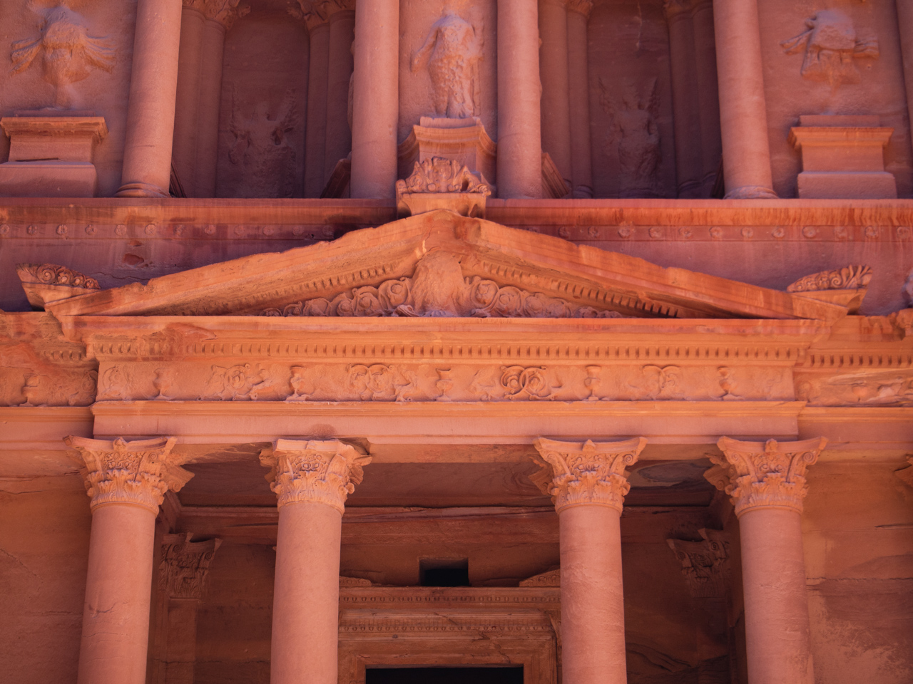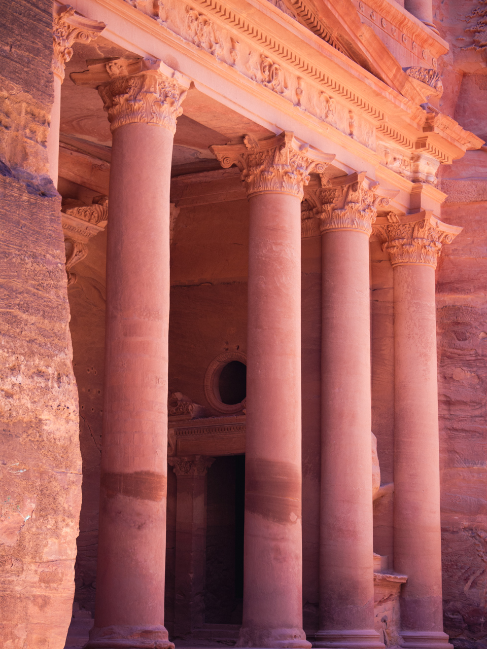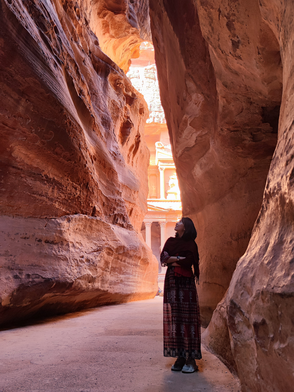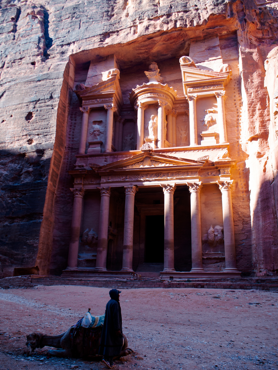 A la fin du Siq, on se dévoile les colonnes du monument le plus impressionnant de Pétra, le trésor, un grand temple taillé dans la roche nous fait face.