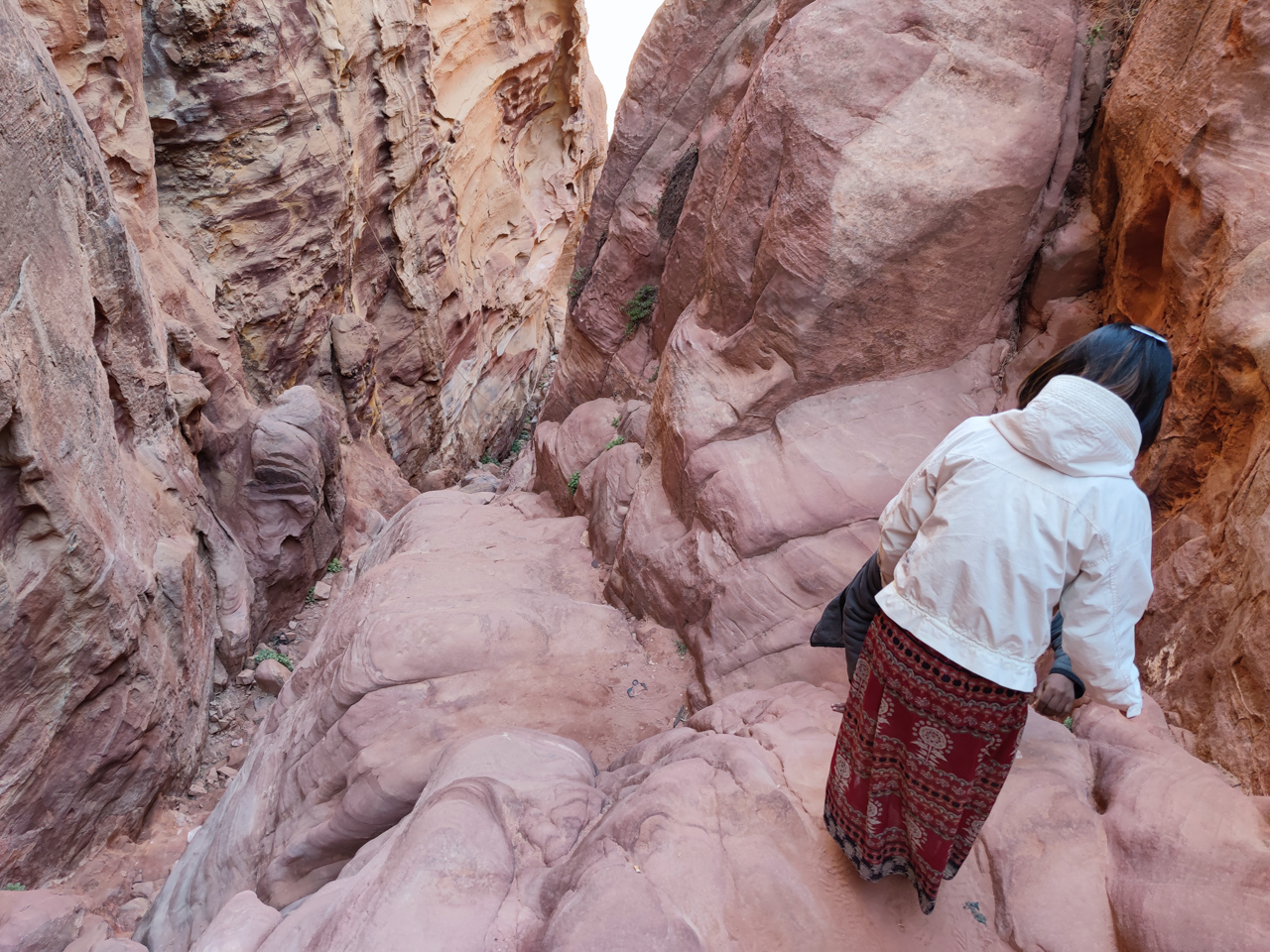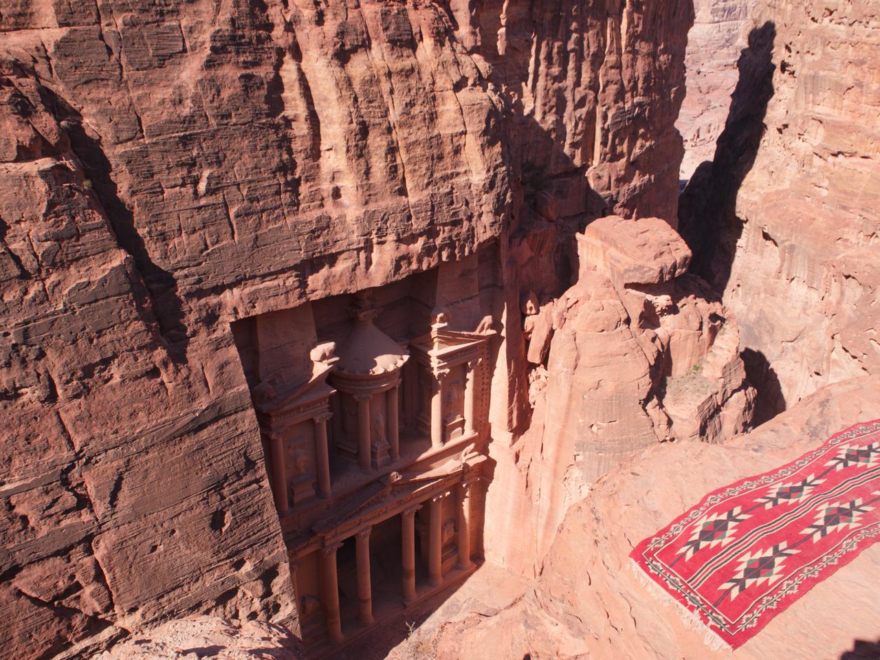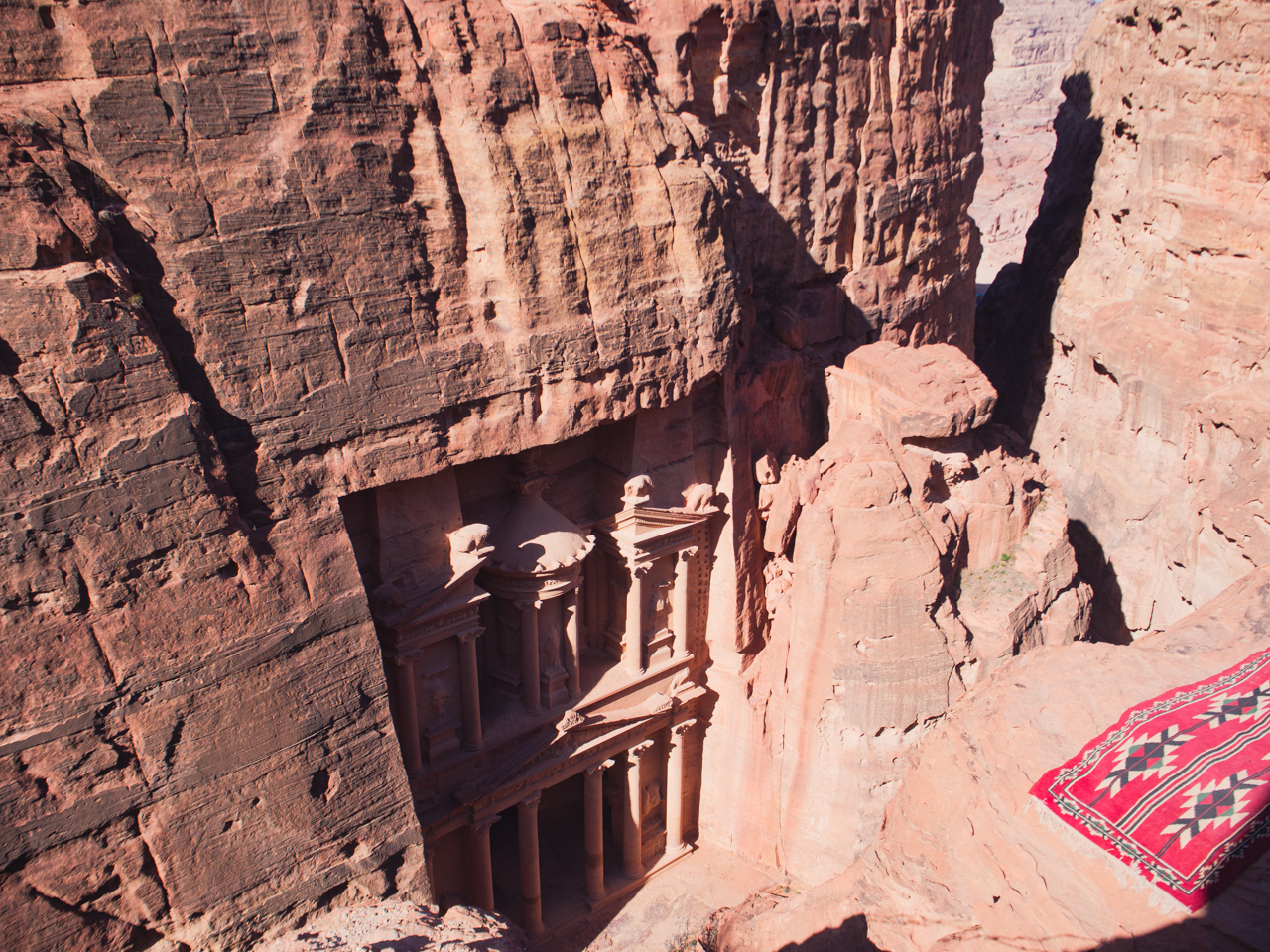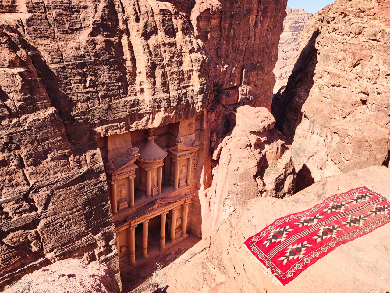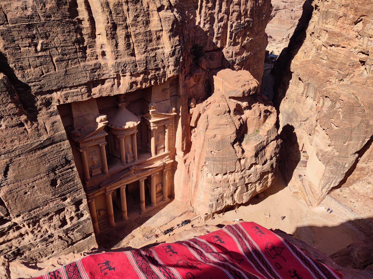 Il y a de nombreux jeunes bédouins qui proposent aux touristes de grimper en hauteur pour avoir une vue du dessus sur le trésor. Ils sont très sympas et on n’est jamais contre suivre un guide. Surtout que le point de vue est juste au-dessus, avec un point de vue magnifique pour les photos. La montée est difficile et acrobatique, surtout pour ma copine qui est en robe.