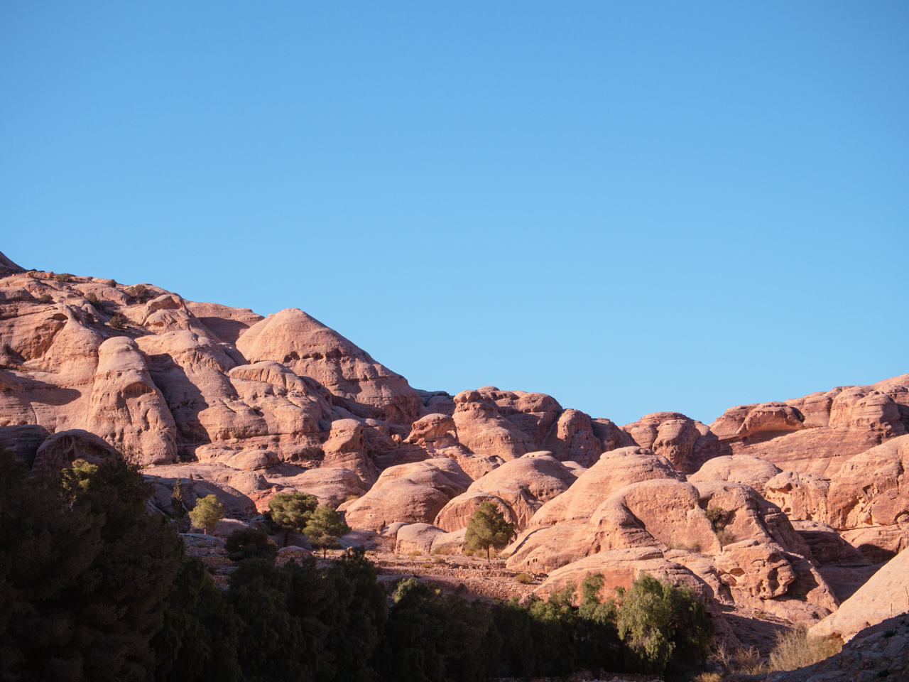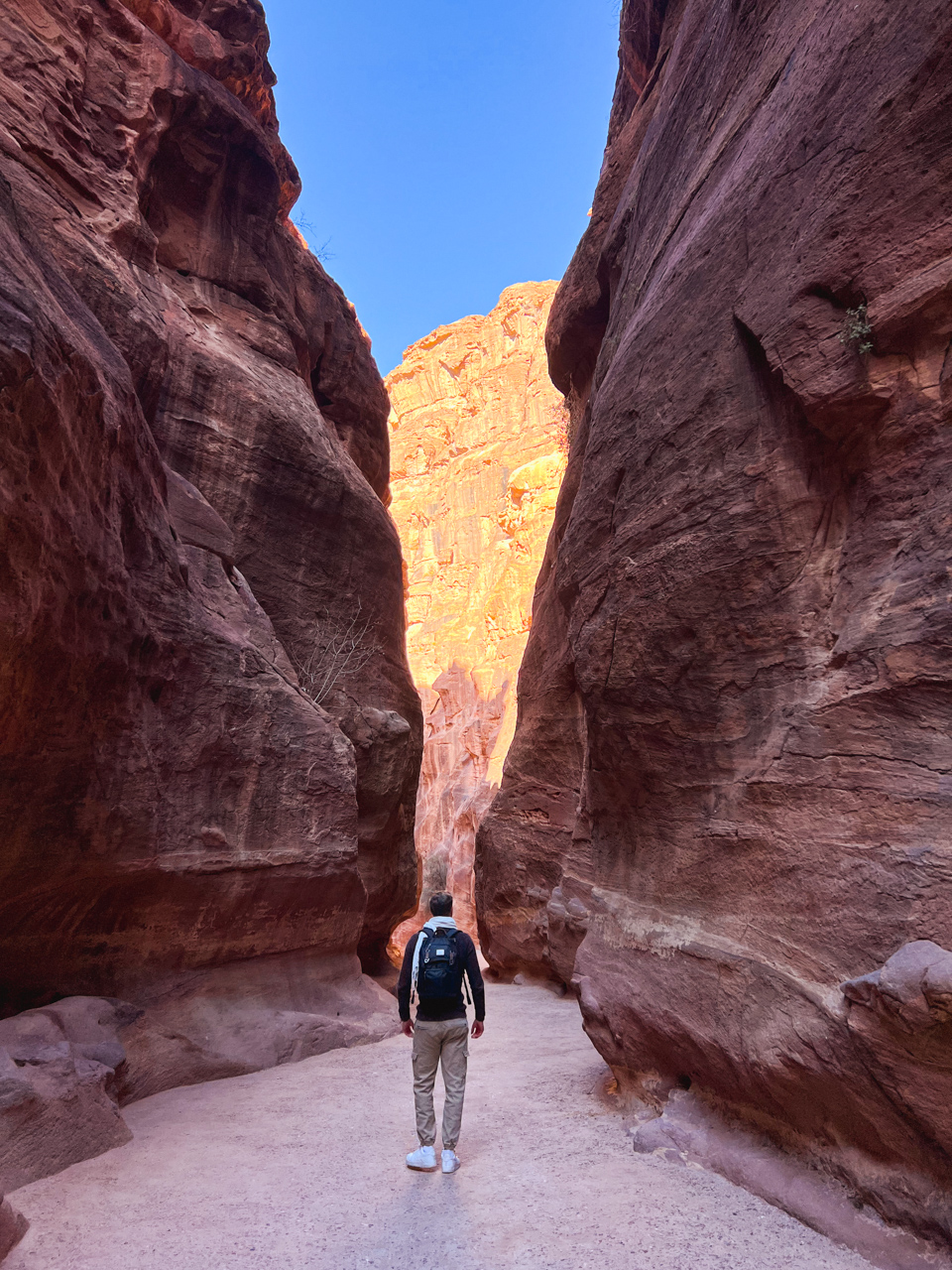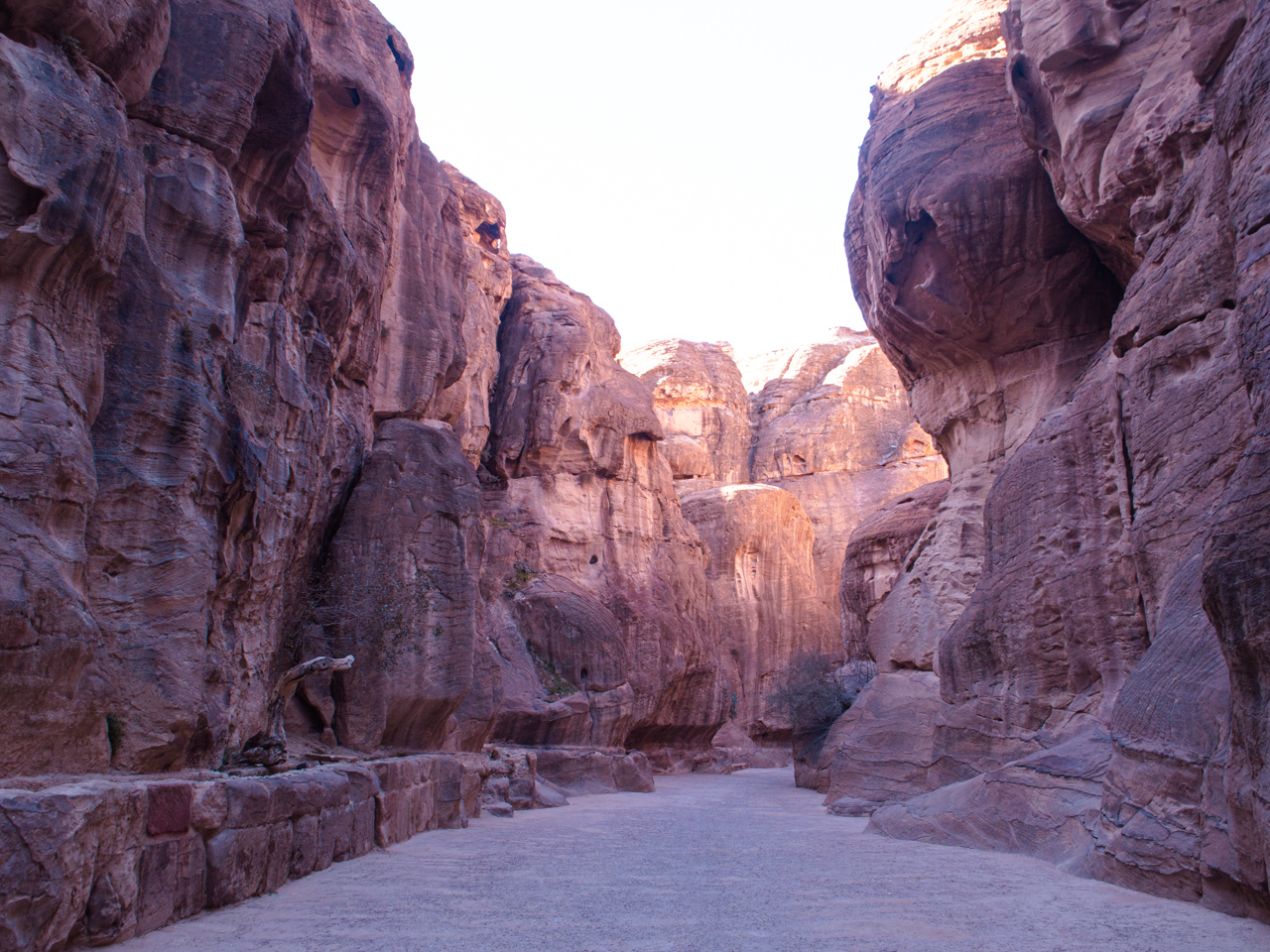 En février, il fait froid à Pétra, le vent qui s’engouffre dans le canyon est glacial et dès qu’il n’y a plus de soleil, ce n’est pas facile le matin et le soir même en étant bien habillé. On retourne lentement vers Wadi Musa en traversant encore le Siq, dans le sens inverse, les jambes sont lourdes après cette longue promenade d’une journée dans Pétra.