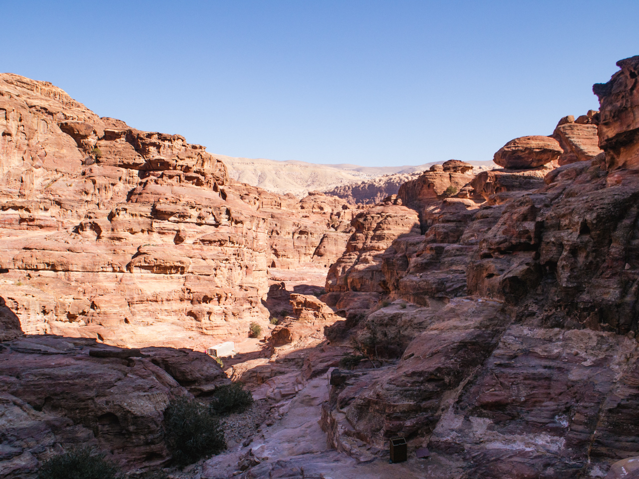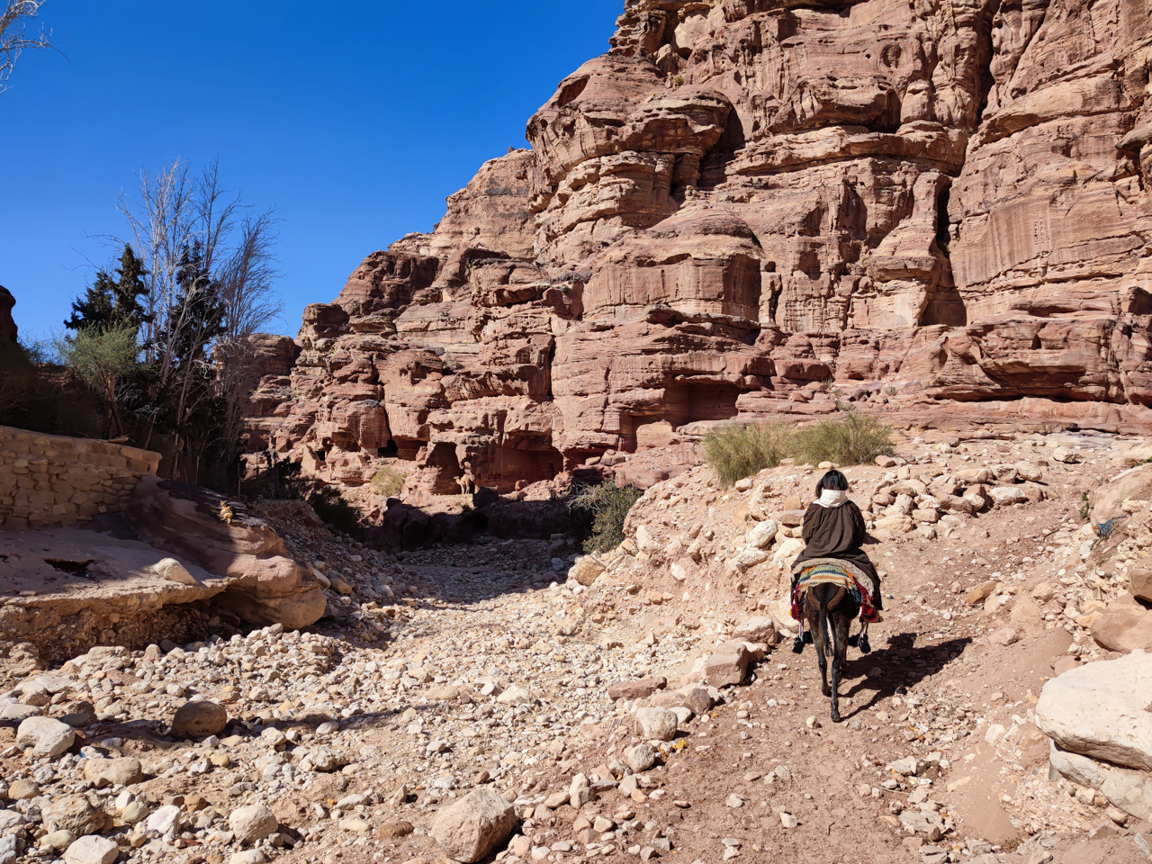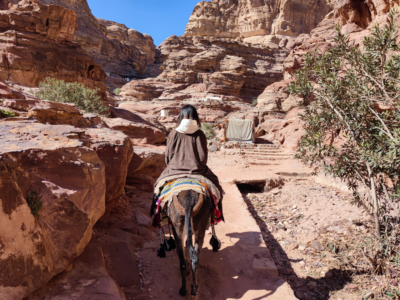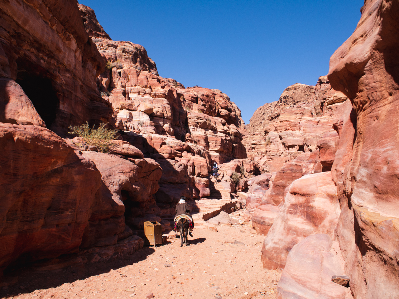 Pour information, il est possible de continuer un peu plus loin derrière le monastère pour avoir une vue qui domine le monument, c’est un bédouin qui nous l’a dit le lendemain, mais à ce moment là nous le savions pas. Après le repas nous retournons sur nos pas vers le trésor pour visiter les sites sur le chemin. A l'aller nous étions très concentré pour ne pas tomber dans le ravin avec notre äne, au retour, on profite de la descente pour contempler ce paysage minéral epoustouflant. La descente depuis le monastère se fait dans un long et profond canyon. Les parois du canyon sont de toutes couleurs et formes.