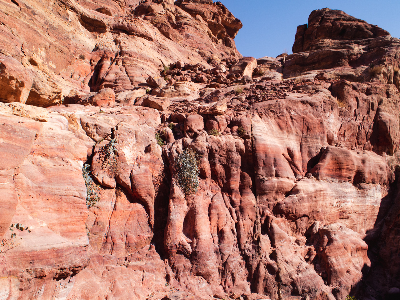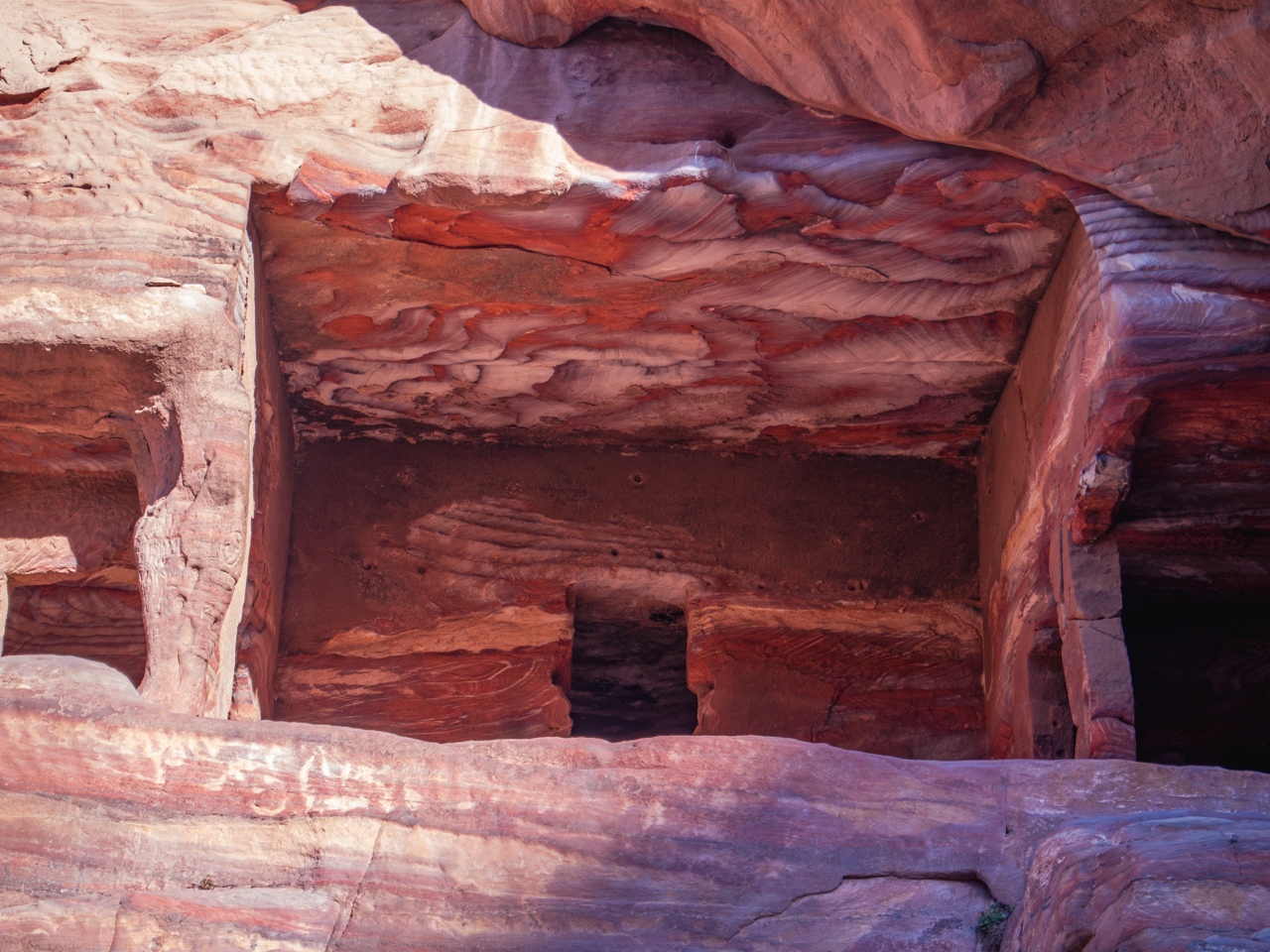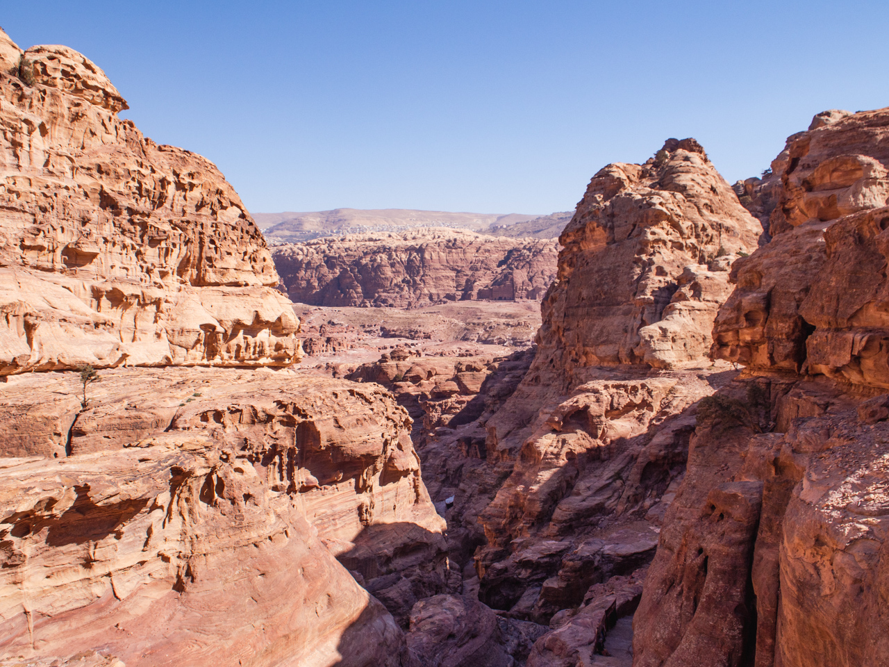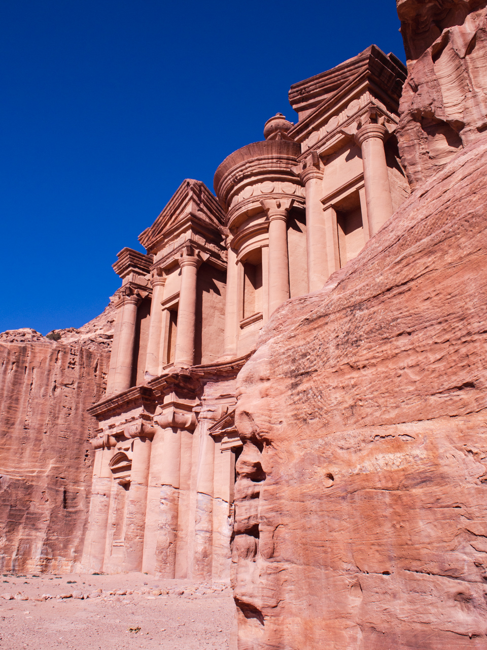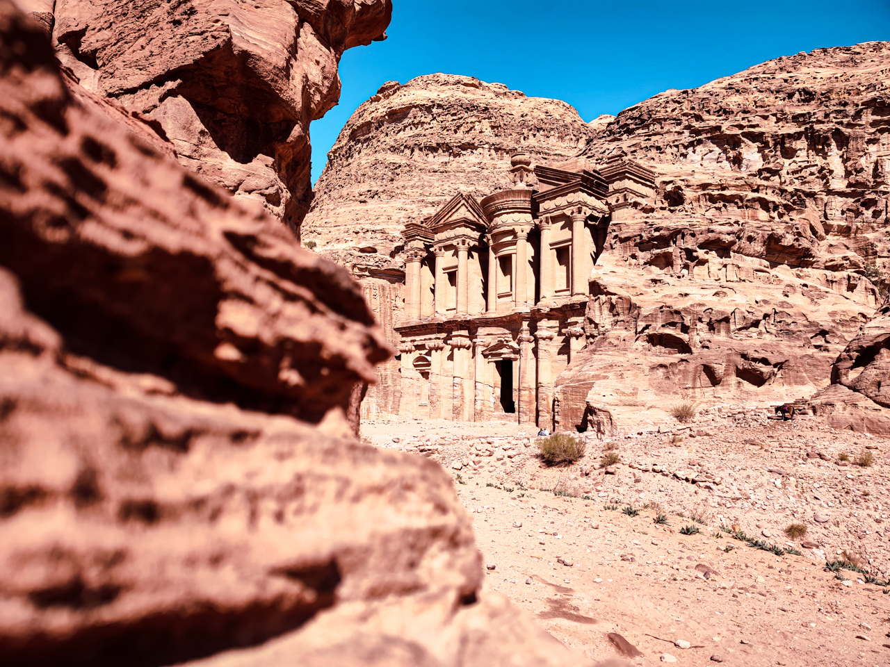 Pour information, il est possible de continuer un peu plus loin derrière le monastère pour avoir une vue qui domine le monument, c’est un bédouin qui nous l’a dit le lendemain, mais à ce moment là nous le savions pas. Après le repas nous retournons sur nos pas vers le trésor pour visiter les sites sur le chemin. A l'aller nous étions très concentré pour ne pas tomber dans le ravin avec notre äne, au retour, on profite de la descente pour contempler ce paysage minéral epoustouflant. La descente depuis le monastère se fait dans un long et profond canyon. Les parois du canyon sont de toutes couleurs et formes.