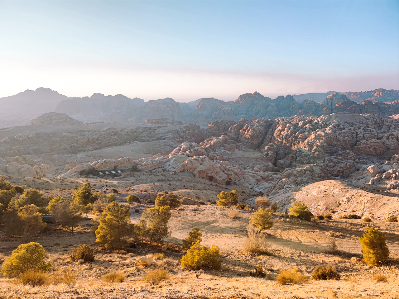 L’arrivée à Wadi Musa nous donne une première alerte sur la conduite en Jordanie qui ressemble un peu à la conduite en Chine. Personne ne fait vraiment attention au autres et on a failli foncer dans un pickup qui s’engager devant moi sans regarder. Heureusement, les freins de la KIA sont efficace et on freine juste avant. Aucun dégât mais un bon rappel sur l’attitude à adopter sur la route ici. La route serpente au dessus des montagnes de Petra, on s’arrête pour regarder le coucher de soleil magnifique sur la vallée.