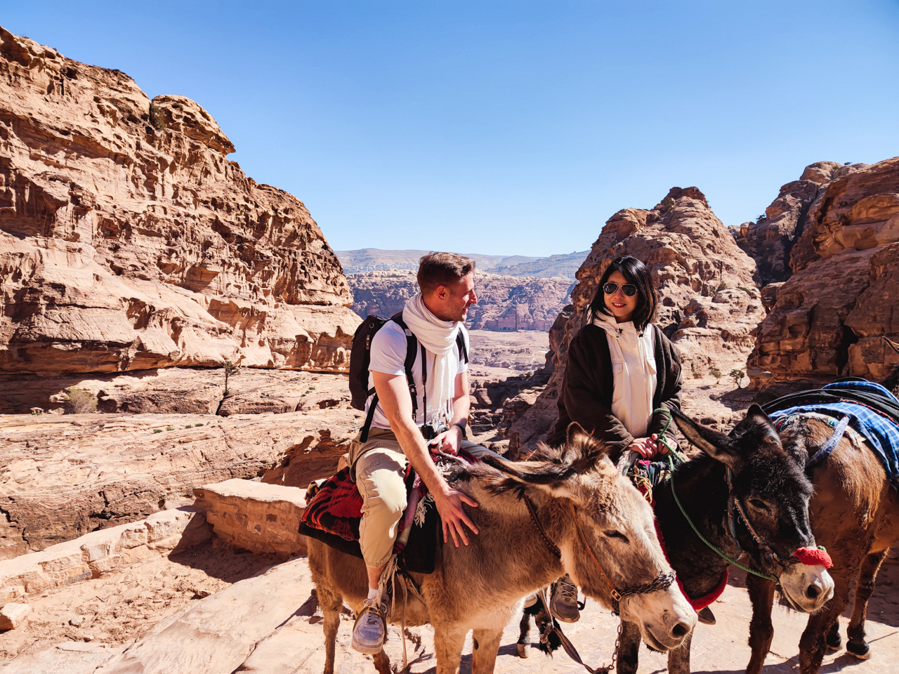 Après une matinée dans l’avion et des procédures COVID compliquées, nous arrivons à Aqaba au Sud de la Jordanie. Premier contact avec ce pays du Proche Orient, nous récupérons la voiture de location et conduisons jusqu’au trésor du pays, raison principale qui a déclenché notre voyage jusqu’ici, la cité perdue des Nabatéens de Pétra. Le site qui fait partie des sept nouvelles merveilles du monde à la hauteur de sa réputation est absolument envoutant.