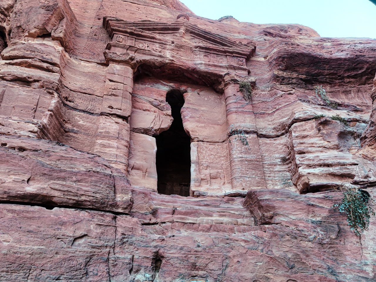 Pour cette première soirée, on profite des installations de l’hôtel puis on se couche assez tôt pour être prêt pour la découverte de Petra le lendemain. Pétra est l’ancienne capitale des Nabatéens, un peuple arabe qui s’était développé grâce au commerce entre l’Orient et l’empire égyptien puis Rome. La ville a édifié au fond d’un canyon, le Siq, et de nombreux monuments ont été taillés dans les falaises roses. Le site a été abandonné suite.à un tremblement de terre il y a 1500 ans et oublié sauf par les bédouins qui habitaient dans les grottes. Il y a deux cents ans un Suisse a redécouvert le site et depuis il fascine le monde entier au point d’avoir été élu parmi les sept nouvelles merveilles du monde. L’entrée à Pétra est très chère, c’est l’attraction la plus connue du pays et protégé par l’UNESCO. On peut choisir de visiter le site en un, deux ou trois jours, à mon avis le plus intéressant est de consacrer deux journées complètes à Pétra, c’est très grand et on ne peut pas apprécier tous les monuments en une seule journée. Nous nous acquittons de notre ticket d’entrée puis descendons le chemin qui nous amène devant le Siq. On peut déjà apercevoir quelques monuments sculptés dans la roche.