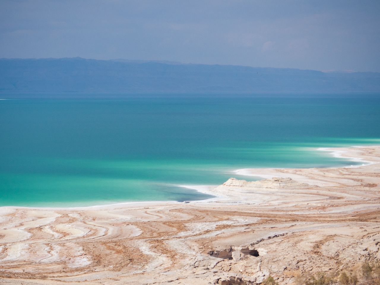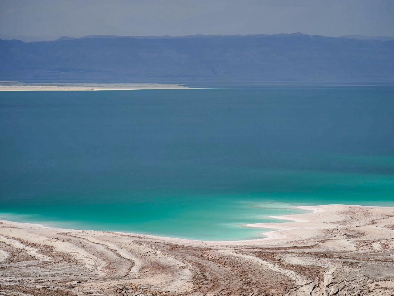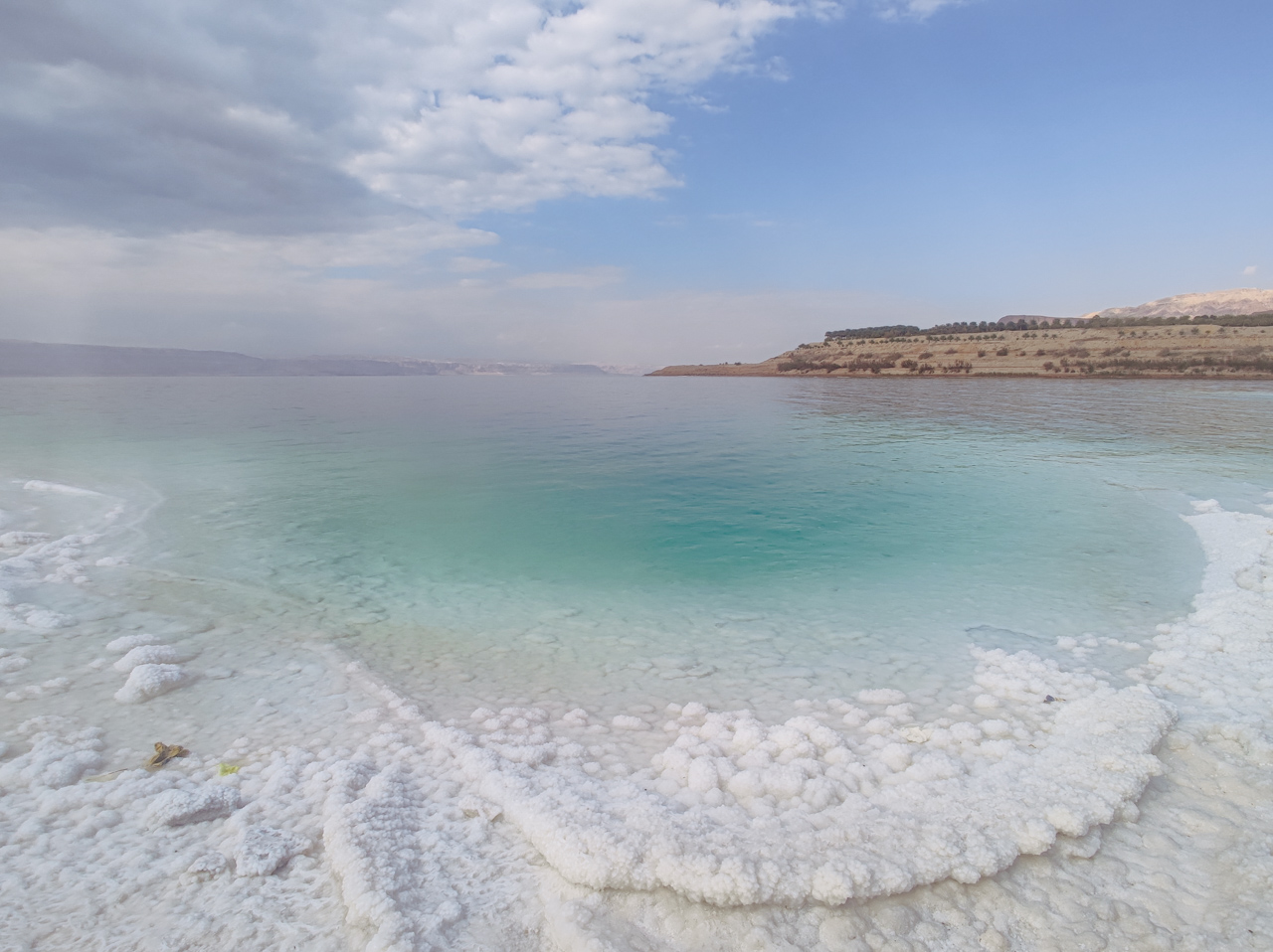 On arrive finalement à la mer morte. Changement de décor, Les couleurs de la mer vont du bleu turquoise au bleu profond, la salinité de cette mer et les dépôts de sel sur les berges qui donne ces couleurs paradisiaques.