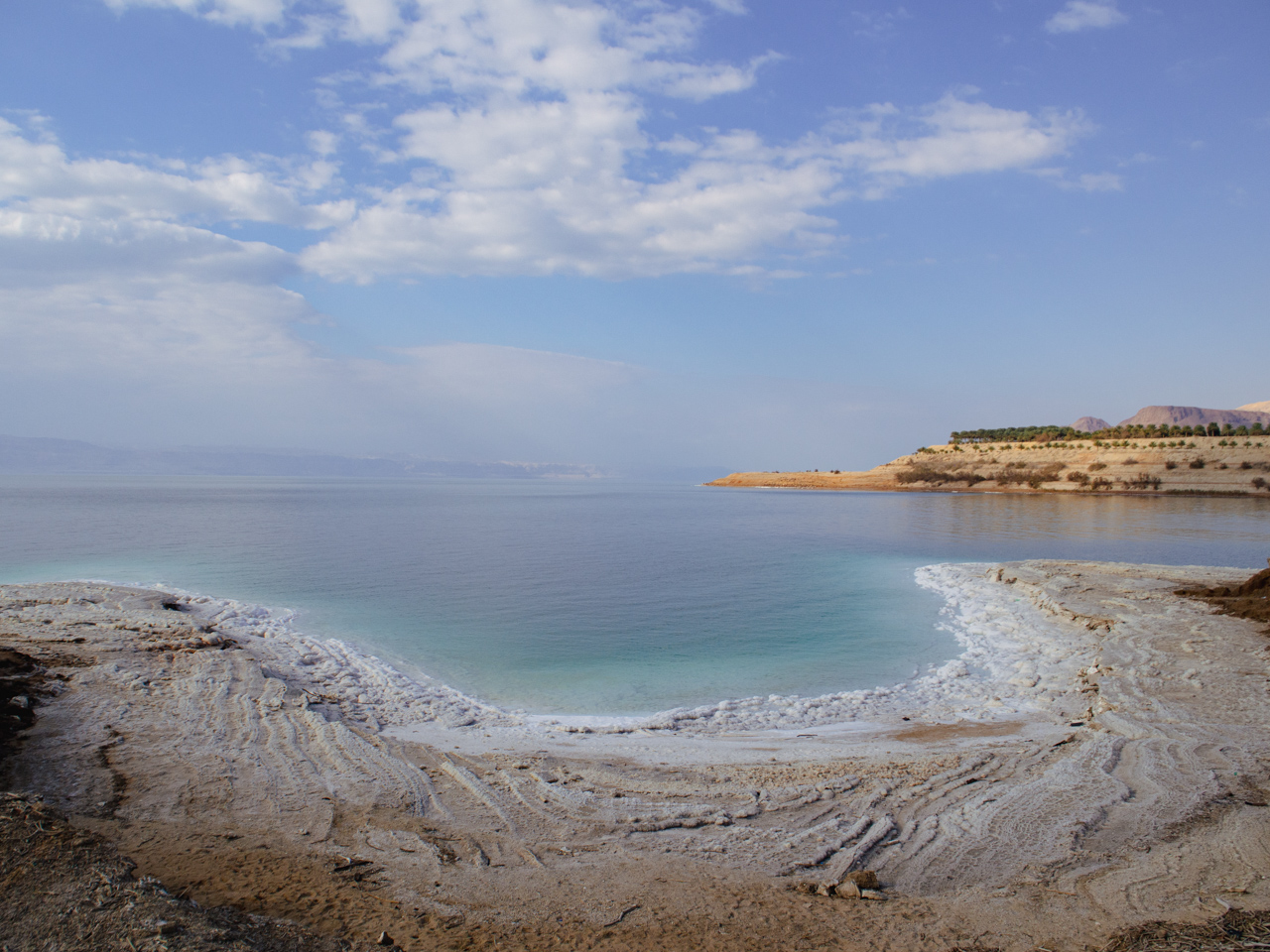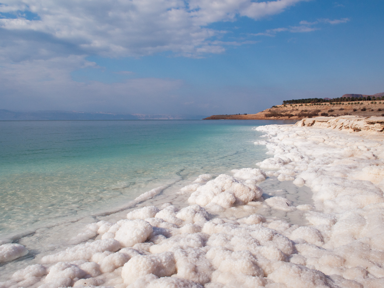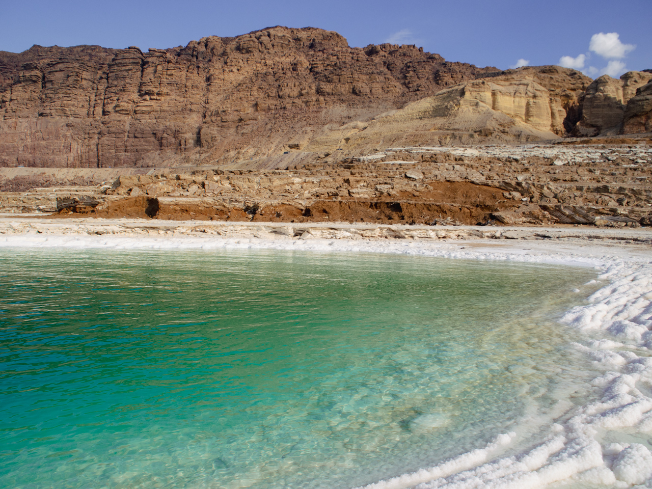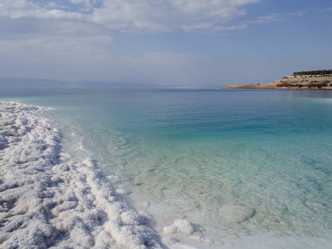 On arrive finalement à la mer morte. Changement de décor, Les couleurs de la mer vont du bleu turquoise au bleu profond, la salinité de cette mer et les dépôts de sel sur les berges qui donne ces couleurs paradisiaques.