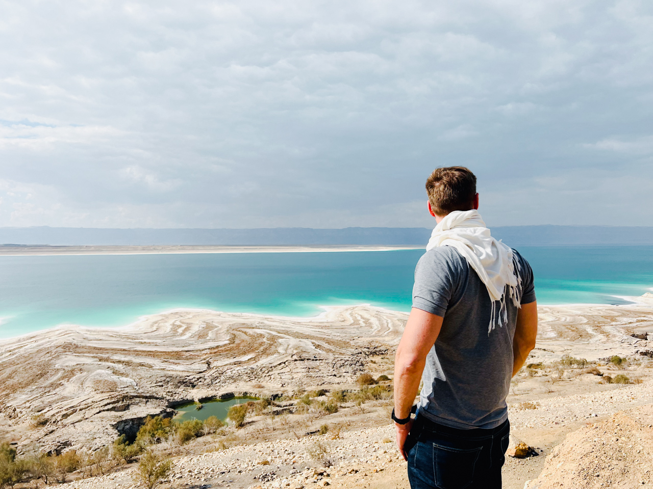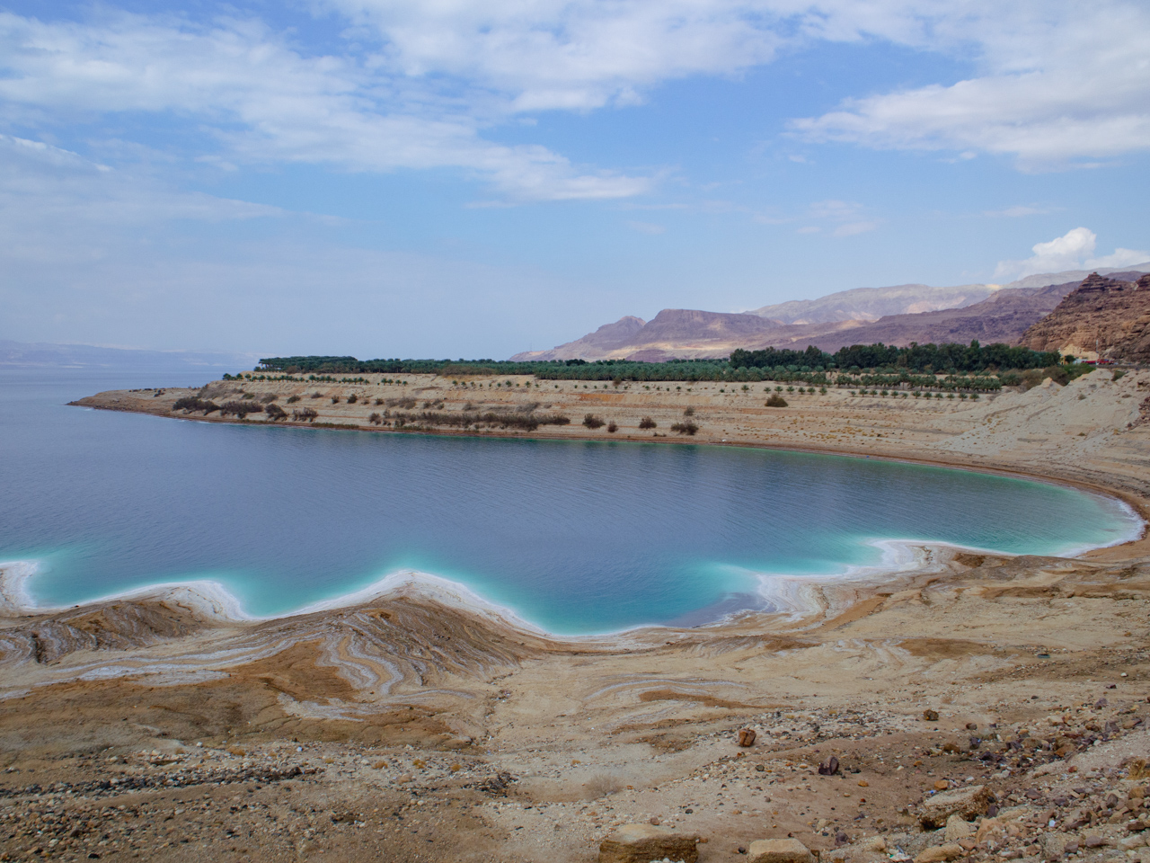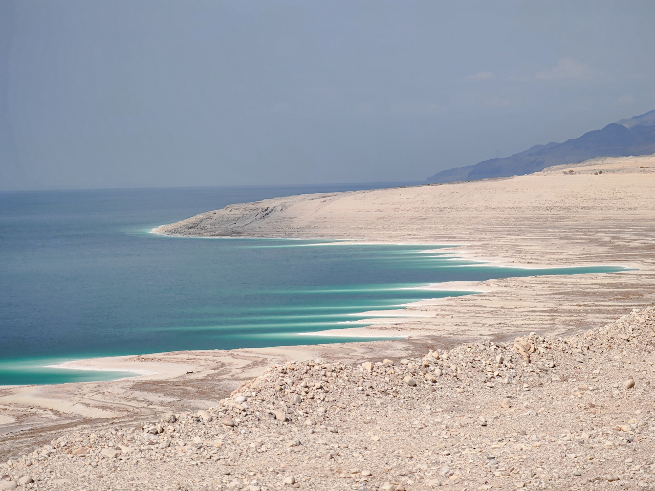 Nous rejoignons la Mer Morte en traversant des paysages magnifiques du Sud de la Jordanie. Ce pays n’est pas grand par la taille mais tellement diversifié en paysage. Tellement de paysages grandioses défilent sous nos yeux, des alentours de Petra très minéraux, où les rochers ont des formes originales, la route serpente au milieu de ce décor incroyable, puis vient le désert dans la dépression du Jourdain, enfin c’est le rivage de la Mer Morte au bleu clair et aux berges d’un blanc éblouissant.