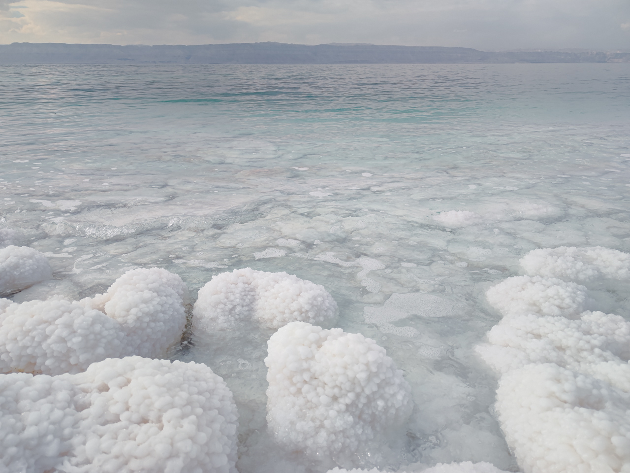 La mer morte est comme son nom l’indique n’héberge pas de vie. Son environnement y est incompatible avec le développement de quelque forme de vie que ce soit. La vue depuis la route est extraordinaire. On longe une falaise d’ocre qui se jette dans cette mer bleue claire. On s’arrête à la plage publique pour descendre et toucher l’eau et le sel. L’eau a une température agréable pour début Février. Le sel est dur et coupant par endroits, il faut faire attention à ne pas tomber pour ne pas se blesser. A l’inverse, sur les petites plages, les vagues ont fait rouler le sel jusqu’à ce qu’il devienne de petites billes toutes douces très bien polies.
