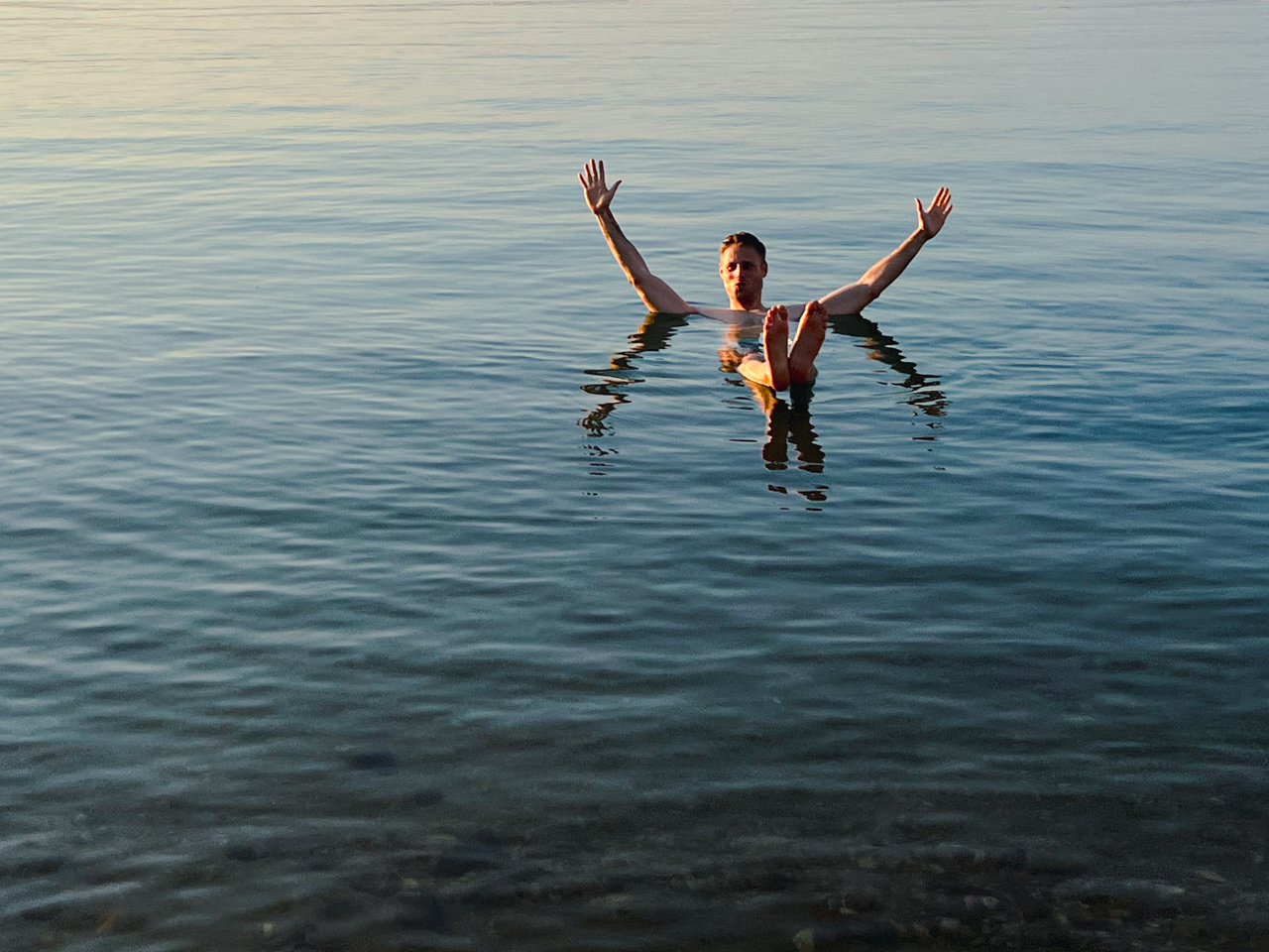 Comme tout le monde, on est venu jusqu’ici pour vérifier si c’est bien vrai, que l’on flotte dans la Mer Morte. Ce que tout écolier a appris à l’école, on veut en avoir le coeur net. L’eau est un peu fraiche, elle doit être autour de 22°C, il faut un peu de courage pour se jeter dedans mais notre esprit scientifique prend le dessus. On fait bien attention à ne pas mettre d’eau dans les yeux, puis on se tourne sur le dos, et oui c’est donc bien vrai, on flotte sans effort ! Même en levant les mains et les pieds hors de l’eau, en restant immobile, on a le corps qui reste au niveau de la surface.