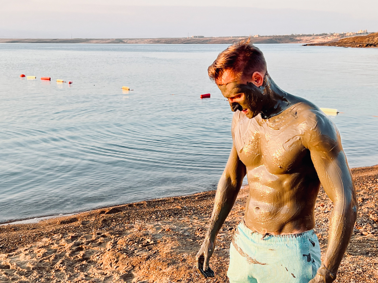 On suit le protocole proposé par l’hôtel, et après un premier bain de quinze minutes, on remonte sur la plage pour se couvrir de boue. Lorsque cette boue est sèche, on retourne se rincer dans l’eau. Ce protocole est censé être très bénéfique pour la peau. J’essaierai plusieurs jours et la différence notable et qu’effectivement on sent que la peau est moins sèche.