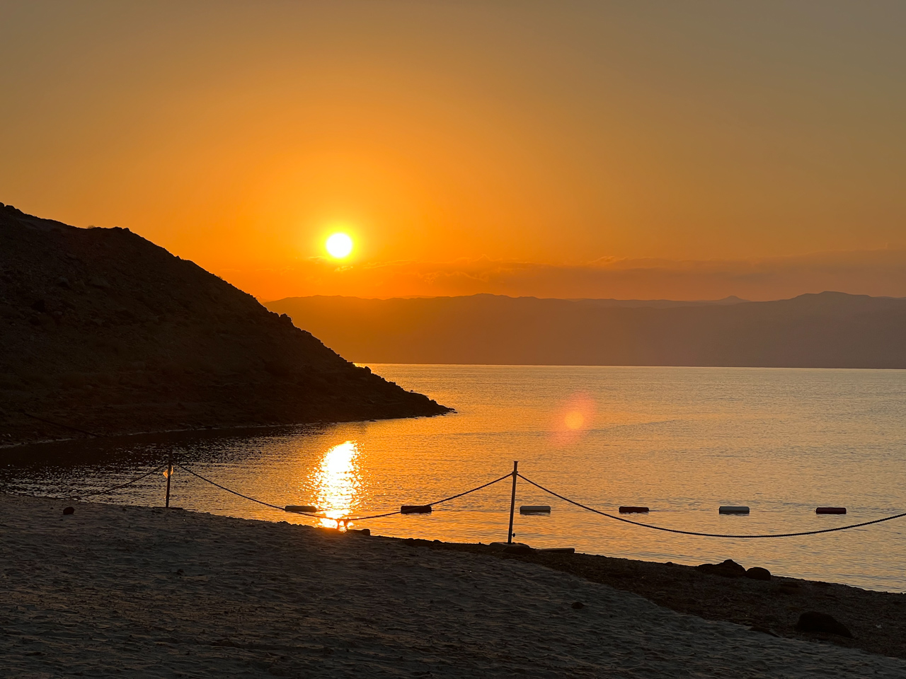 Alors que l’on s’amuse dans l’eau, on en profite pour contempler le soleil se coucher derrière les montagnes de Palestine, de l’autre côté.