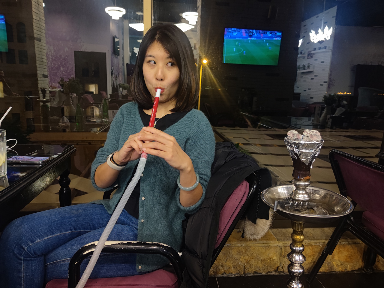 Un autre couple est arrivé, et le mari se joint à moi dans l’eau, sa femme tout comme ma copine préférant rester au sec. Samir et Reem sont un couple d’Amman qui s’est offert un break d’une nuit pour changer d’air. Je retrouverai plus tard Samir à la salle de sport de l’hôtel où l’on fait plus ample connaissance, nous avons beaucoup de passions en commun. On décide de manger ensemble à l’hôtel en couple et les deux filles accrochent elles aussi tout de suite. Ils ont l’habitude de se rendre dans un bar à chicha le soir après le diner et ils nous proposent de nous joindre à eux. Je n’ai jamais essayé de ma vie et je suis plus porté sur la santé et le sport, mais comme on s’entend très bien, on décide de les accompagner.
