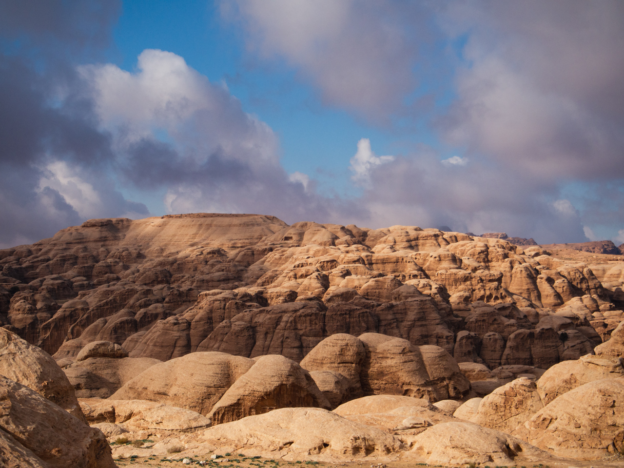 On arrive à distinguer certaines grottes et caves, ainsi que des temples creusés dans la roche. On est pas loin du village bedouin où l'on était hier soir, on voit bien tout le chemin que l'on a remonté dans la nuit (la côte à droite sur la photo).