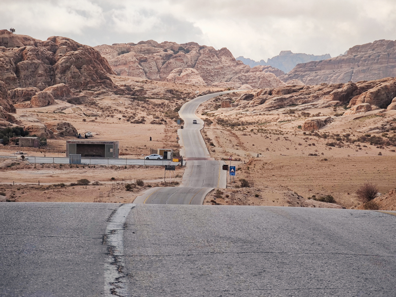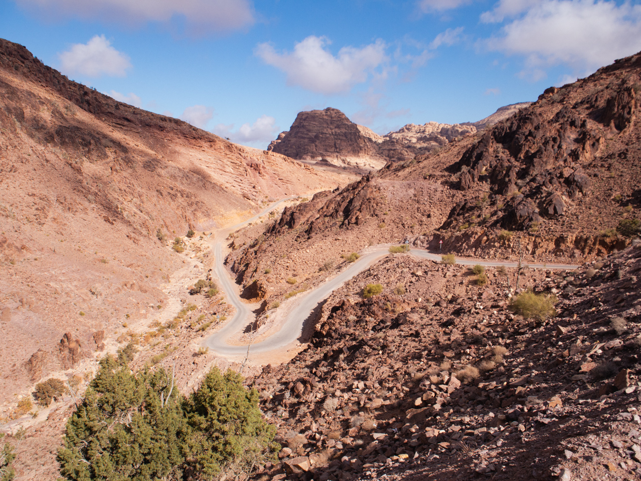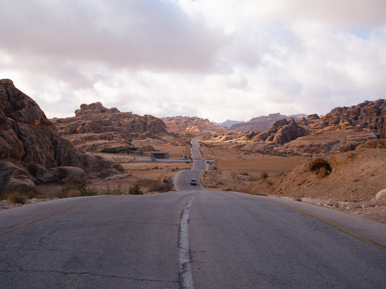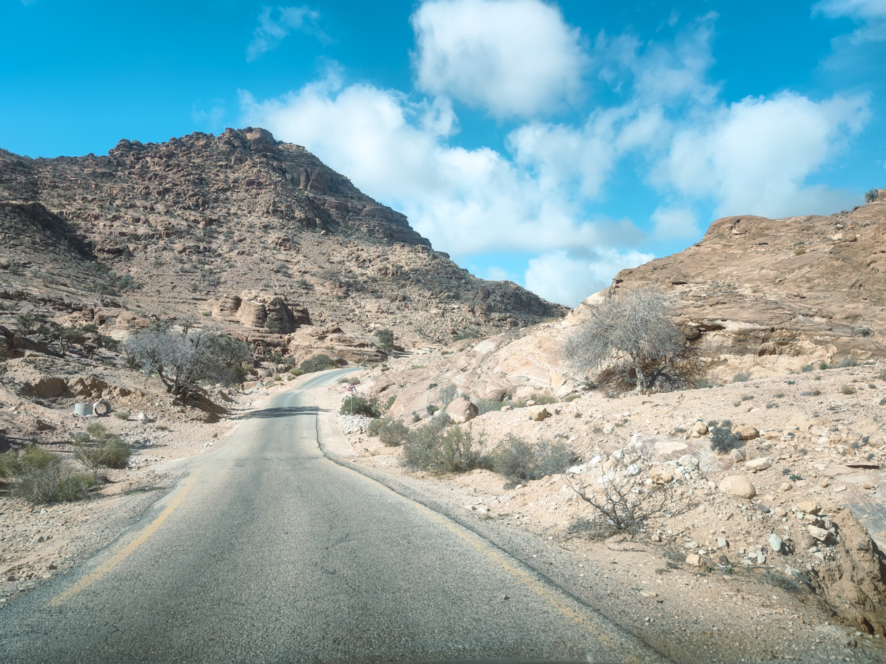 Après l’entrée de Little Petra, on bifurque à gauche sur la petite route du Wadi Araba plutôt que la route principale de King’s Highway. Cette route est sinueuse et traverse des paysages désertiques, il n’y a personne qui vit et là sauf quelques nomades qui ont installé leur tente avec leurs chèvres.