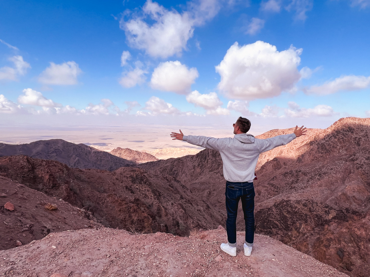On arrive à un balcon sur la vallée du Jourdain, le point le plus bas de la Terre et les montagnes de Palestine de l’autre côté. Les roches ont des couleurs très différentes, la route se fraie un passage sinueux pour descendre jusqu’à une altitude de 500 mètres sous le niveau de la mer.