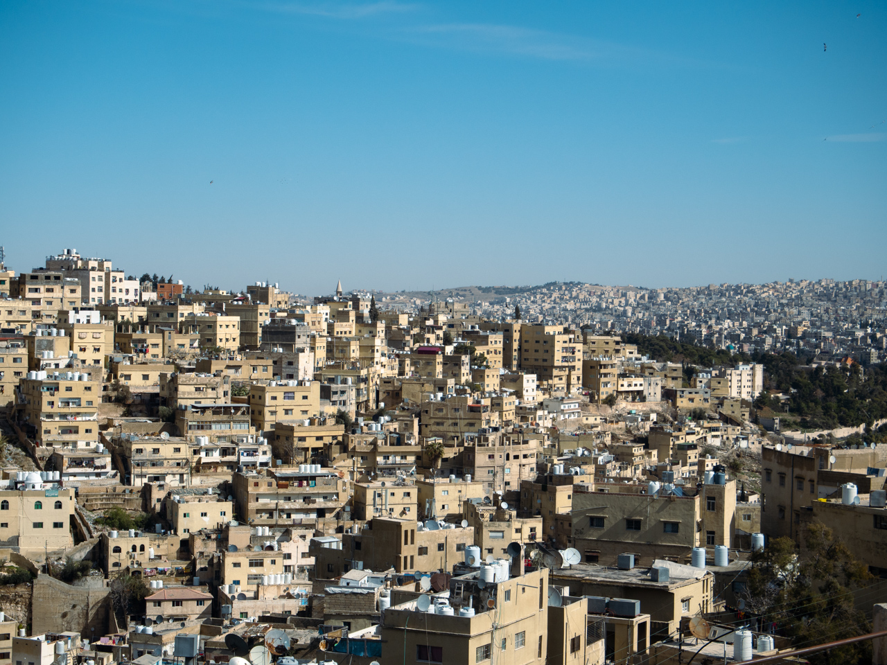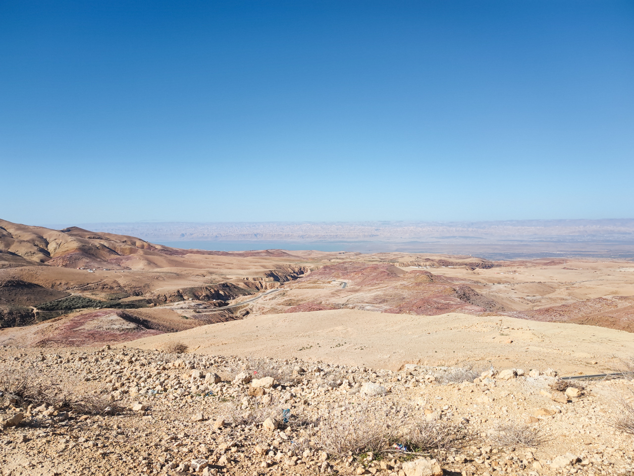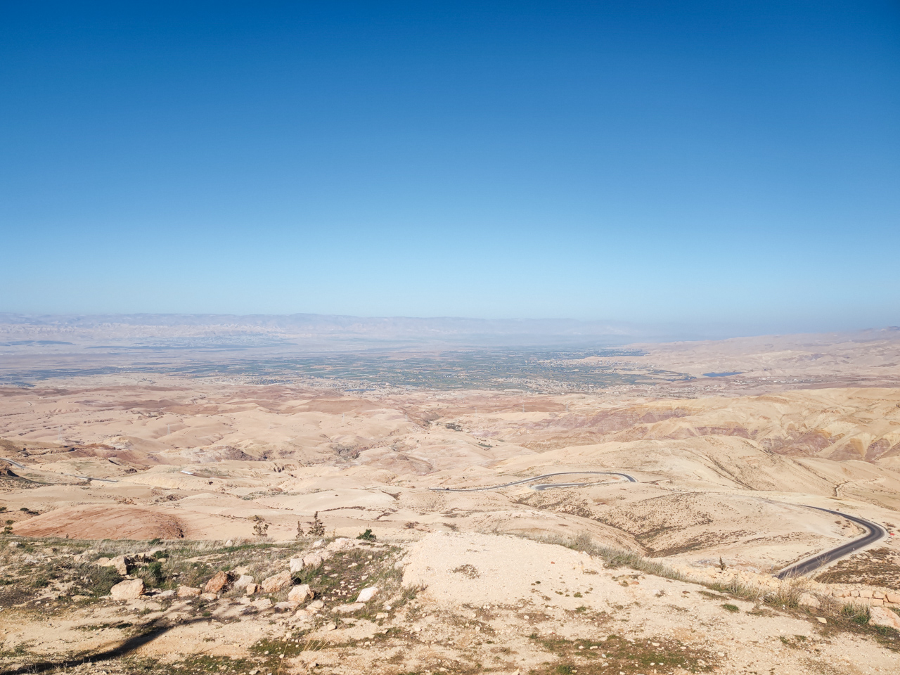 Sur les conseils de Samir, on décide de passer à Amman. En fait la capitale de la Jordanie n’est pas loin et on peut facilement faire l’aller retour bien que l’on soit logé à la Mer Morte. Avant de rejoindre la plus grande ville du pays, on remonte la dépression par la route du Mont Nébo. Cette route traverse des paysages magnifiques, jusqu’à l’endroit présumé où Moïse aurait pointé à son peuple la terre promise avant de poursuivre jusqu’à Amman.