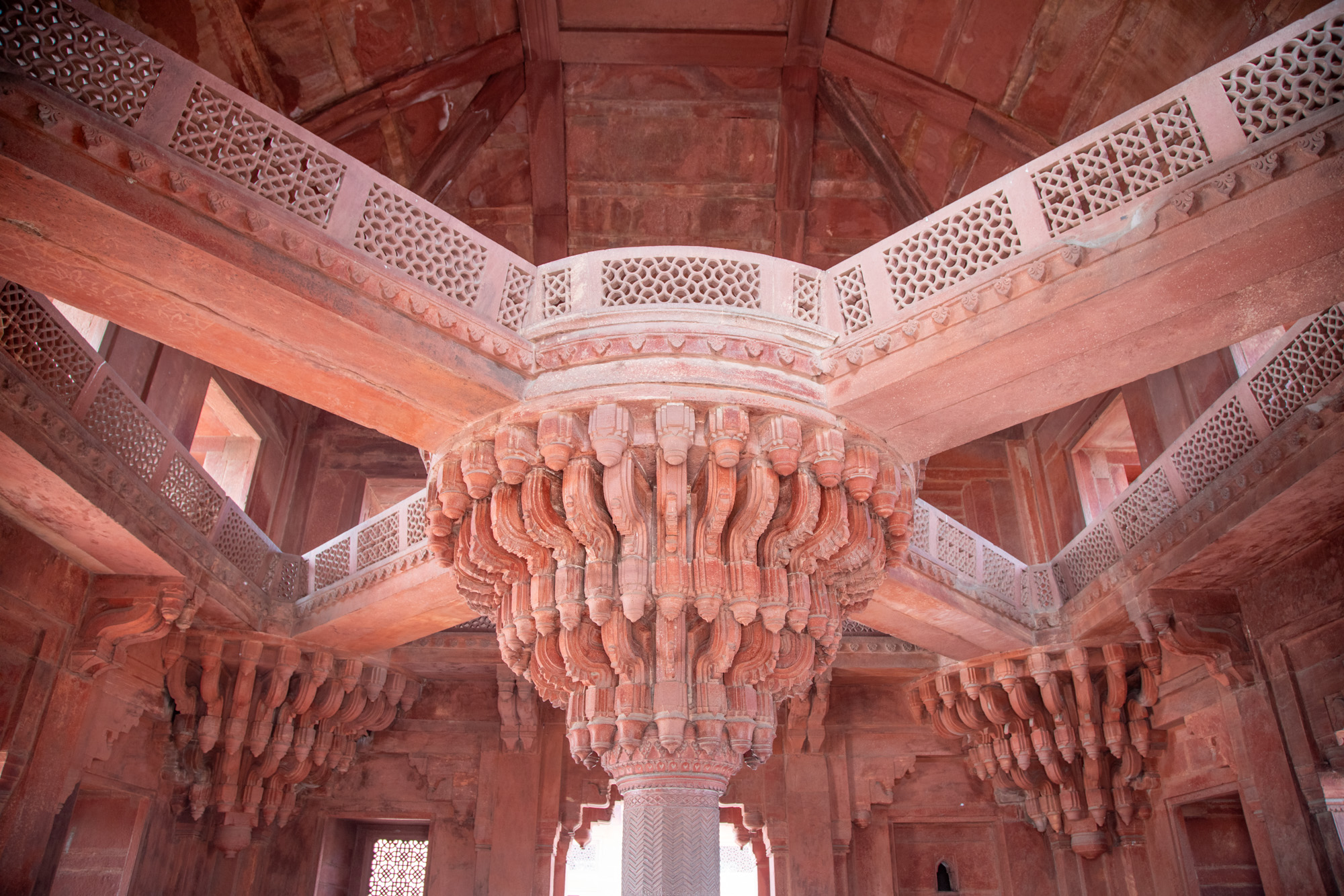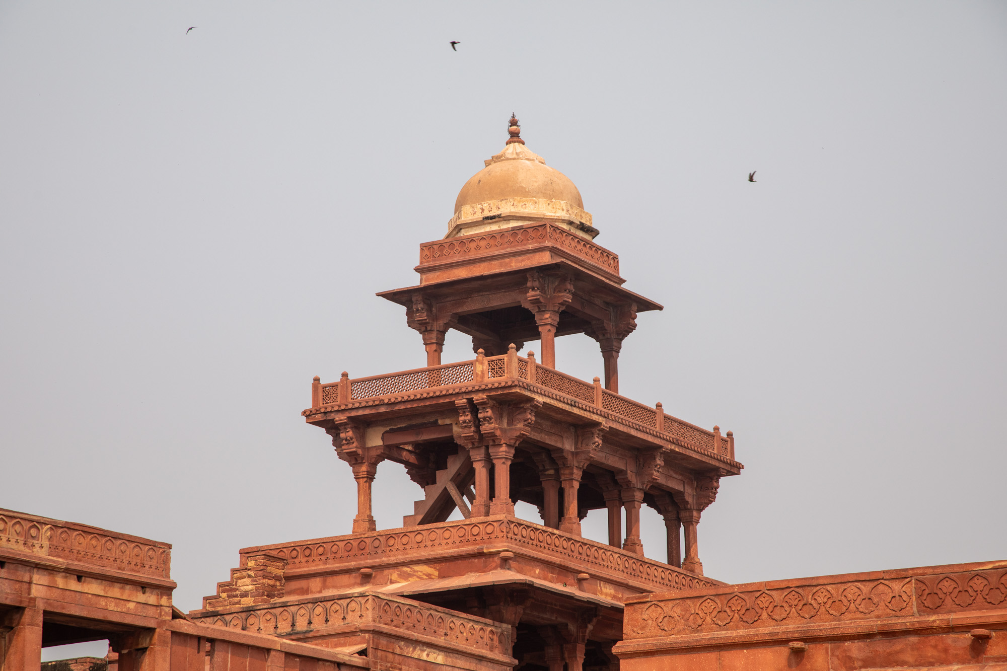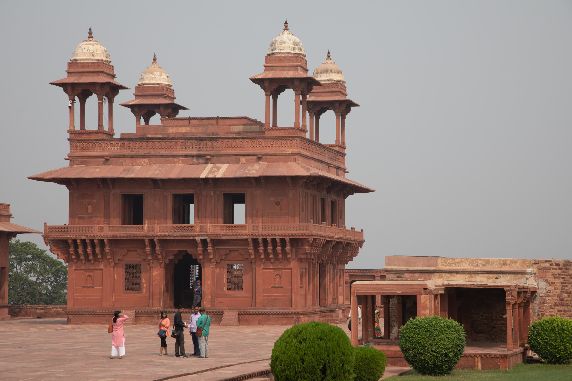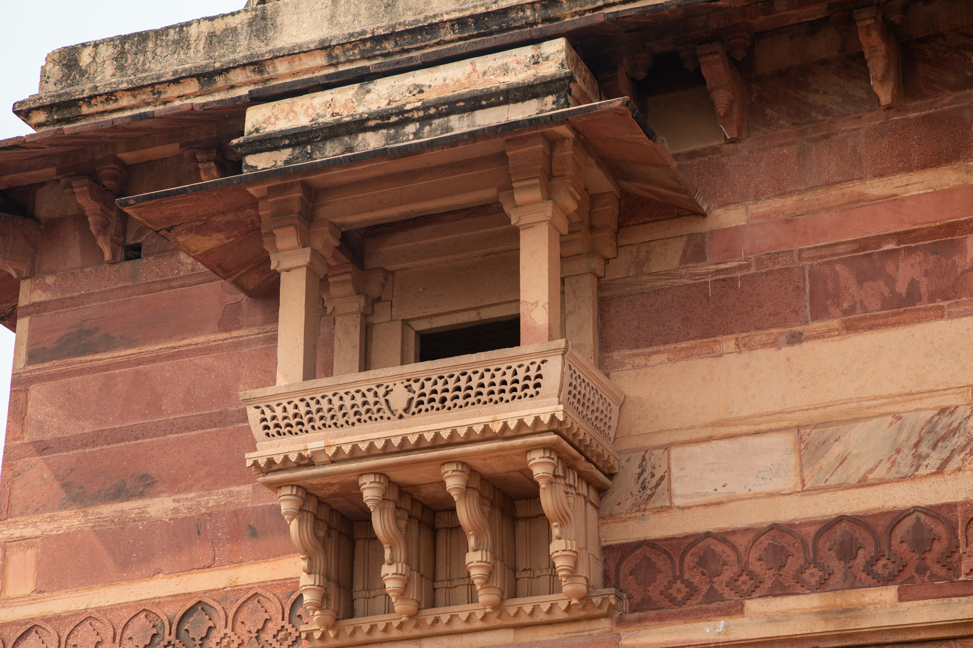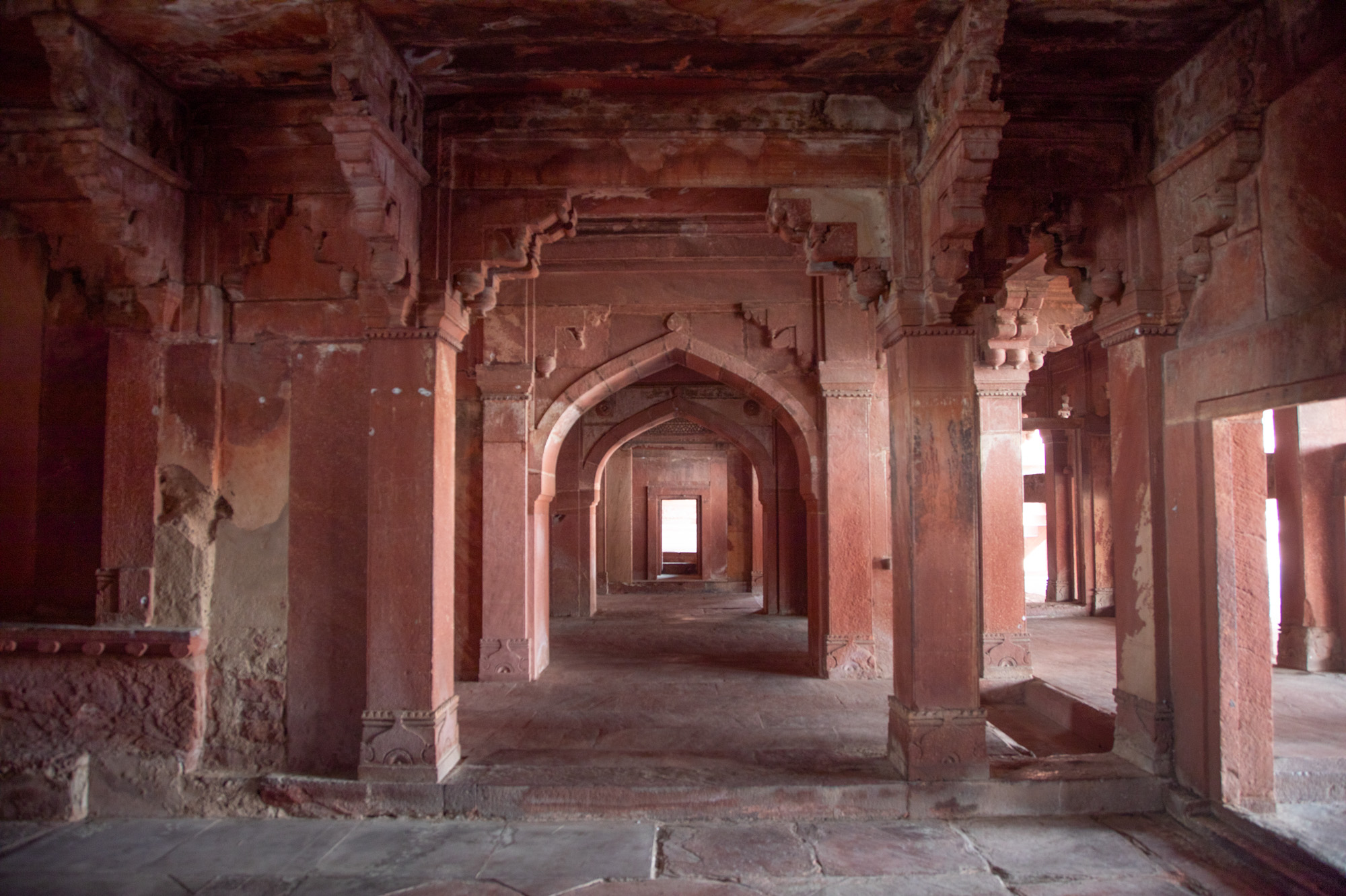 Fatehpur Sikri est divisé en deux zones distinctes toutes aussi intéressantes l’une de l’autre. Il y a d’abord la résidence royale puis la mosquée qui est encore en activité. Une navette nous emmène avec le guide à l’entrée de la résidence sur la colline. On pénètre dans un grand ensemble de bâtiments qui ressemble de par sa disposition aux forts que l’on a visité à Delhi et Agra. Ce sont en fait chacun d’eux des résidences des empereurs Moghols à différentes époques. L’époque de Fatehpur Sikri comme centre politique de l’Empire a été plutôt de courte durée, le guide nous en raconte l’histoire. L’empereur qui voulait absolument un fils pour préserver sa lignée a rencontré sur la colline un homme saint pour une entrevue puis par la suite sa troisième femme est enfin tombée enceinte et lui a offert un héritier. En retour de cette grâce, l’empereur déplaça la capitale de l’empire sur cette colline isolée, fit construire un palais et un temple pour l’homme saint juste à côté. Il gouverna depuis Fatehpur Sikri mais le choix de la localisation, loin de tout et sans accès à la ressource la plus importante dans cette région désertique, de l’eau, ont rapidement mis fin au projet et Fatehpur Sikri est retourné peu à peu dans l’oubli après la mort de l’empereur. Les bâtiments sont toutefois très intéressants à découvrir, c’est aussi la dernière place forte des Moghols avant Jaipur, à quelques kilomètres près, on quitte la région de l’Uttar Pradesh pour pénétrer dans l’Etat du Rajasthan, le monde des Rajputes qui ont combattu leurs ennemis Moghols pendant plusieurs siècles.