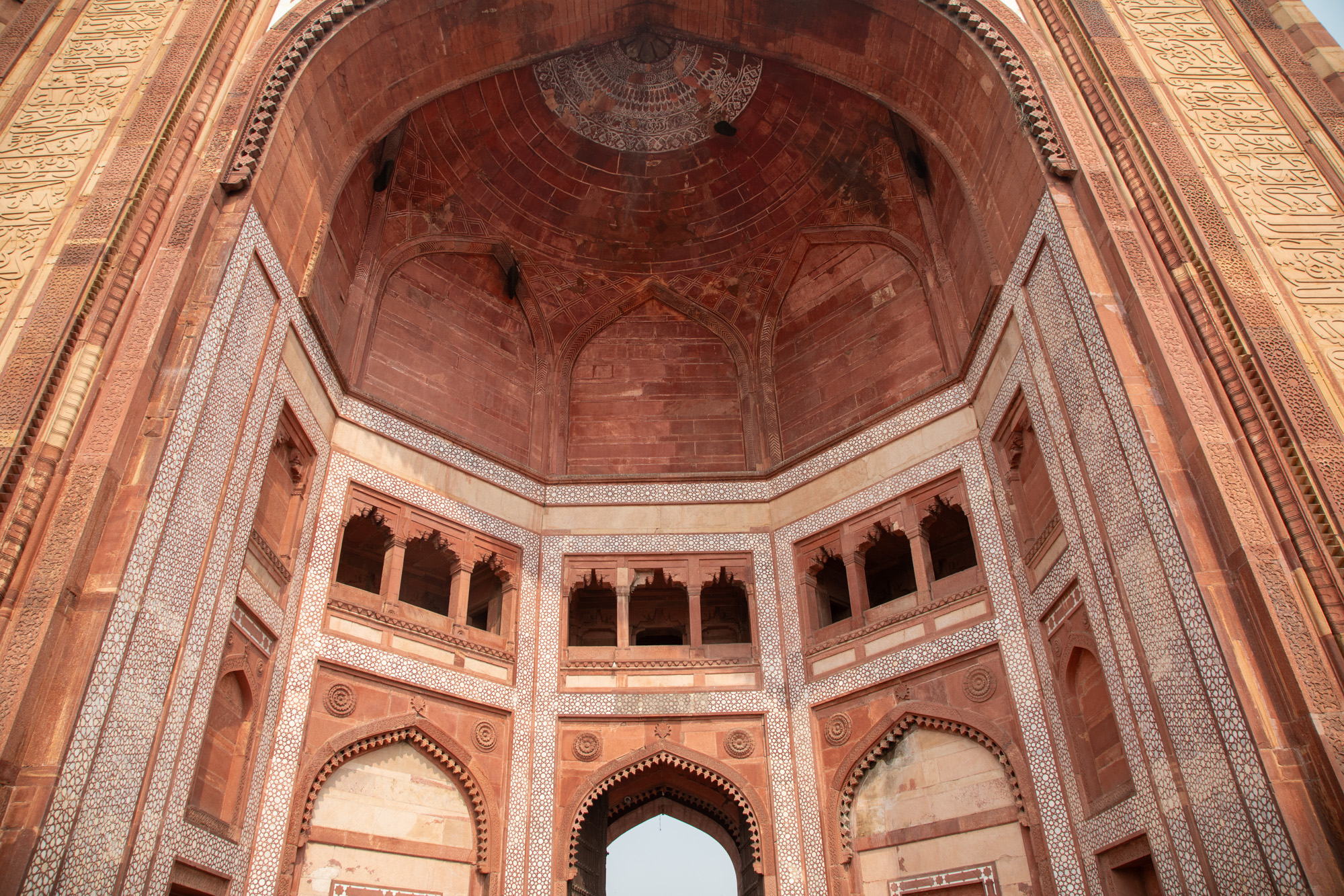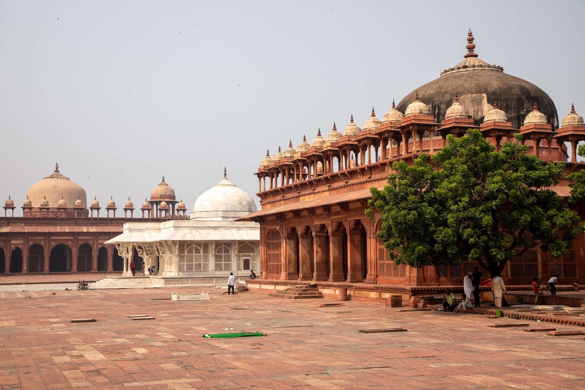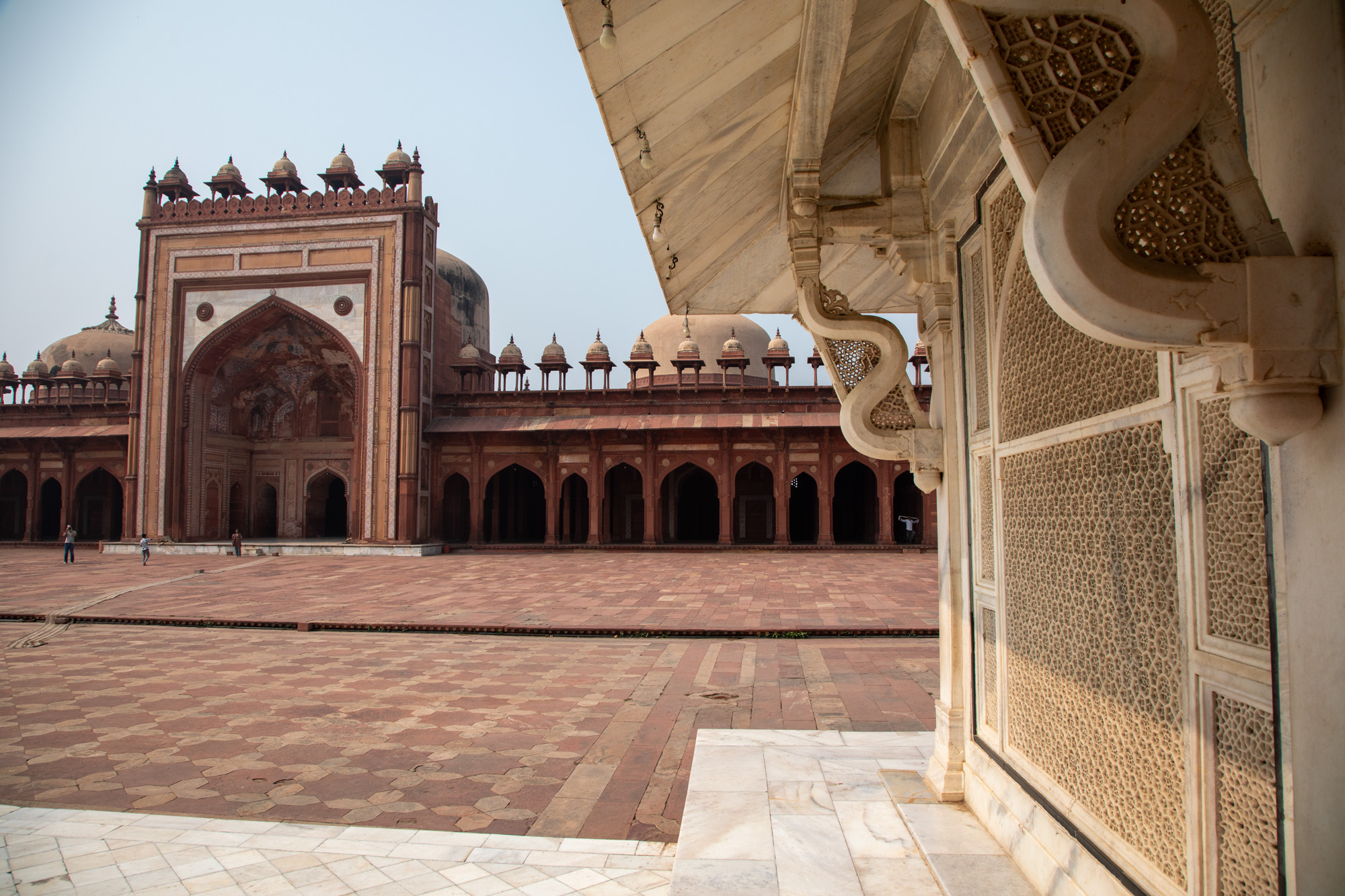 Notre chauffeur nous attend le matin devant notre hotel d’Agra, et on part pour notre première étape pour notre journée ensemble, la ville impériale de Fatehpur Sikri qui se trouve à une première heure de route depuis Agra. On roule jusqu’à un parking à l’intérieur des anciennes murailles de la ville démolies. On prend un guide qui va nous accompagner au sein du complexe qui est plutôt grand.
