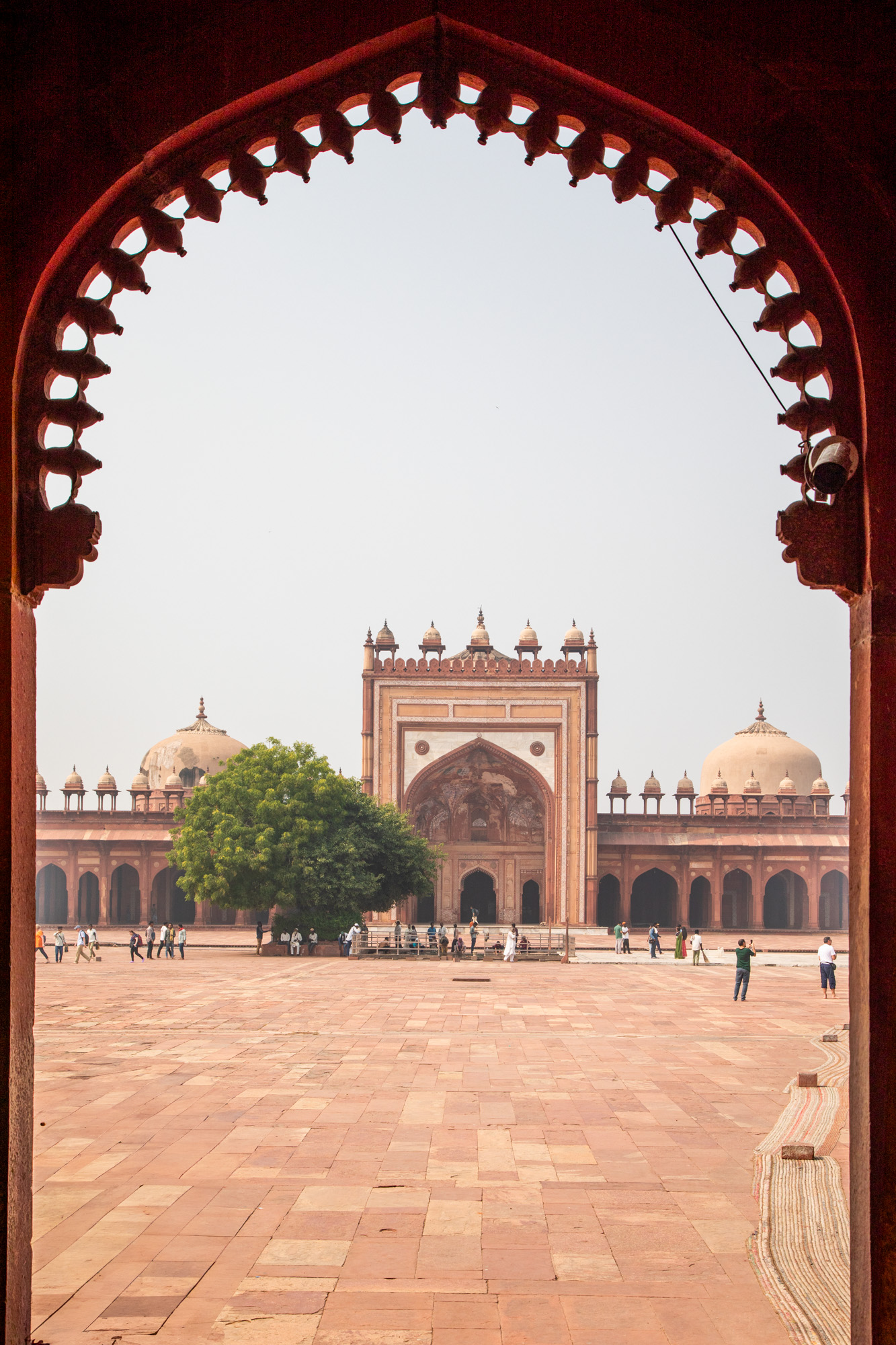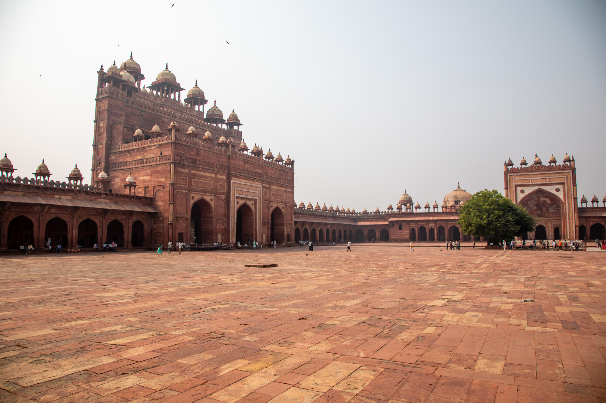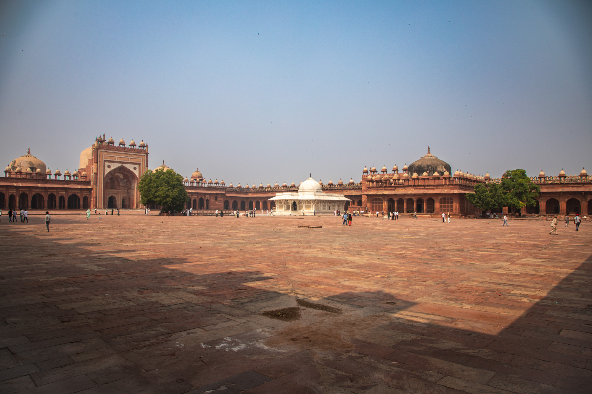 On ressort de la mosquée qui surplombe la petite ville de Fatehpur Sikri qui est dans la poussière. Derrière nous la grande porte de l’édifice religieux est tellement impressionnant qu’il ne rentre pas dans le cadre de l’appareil photo.