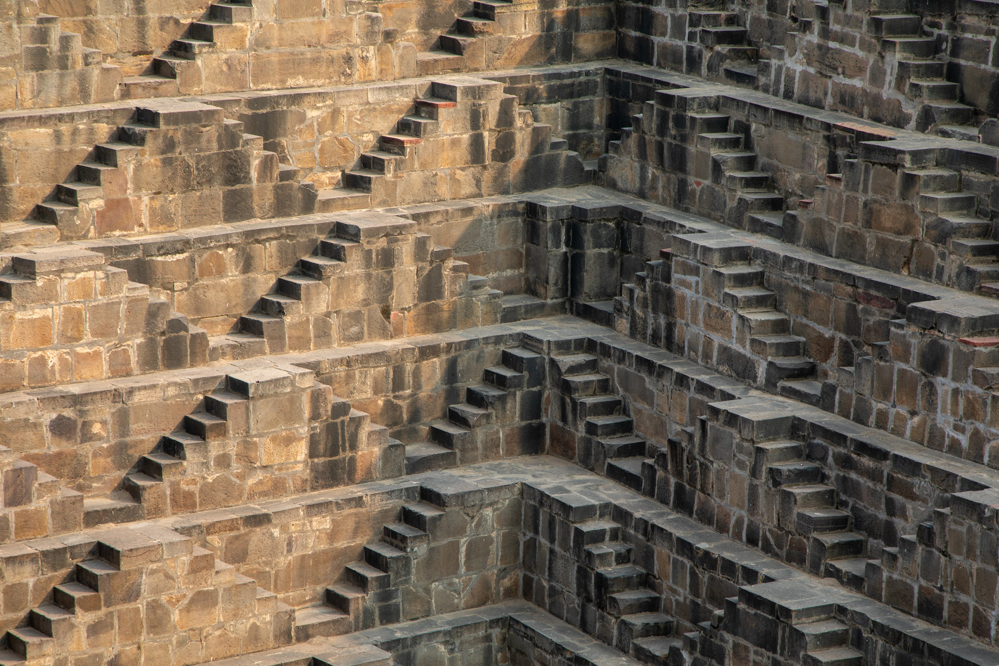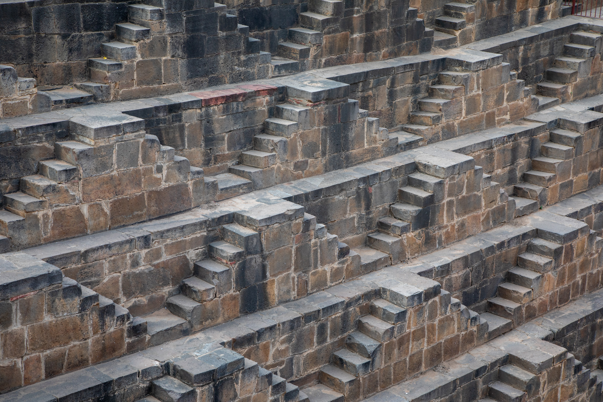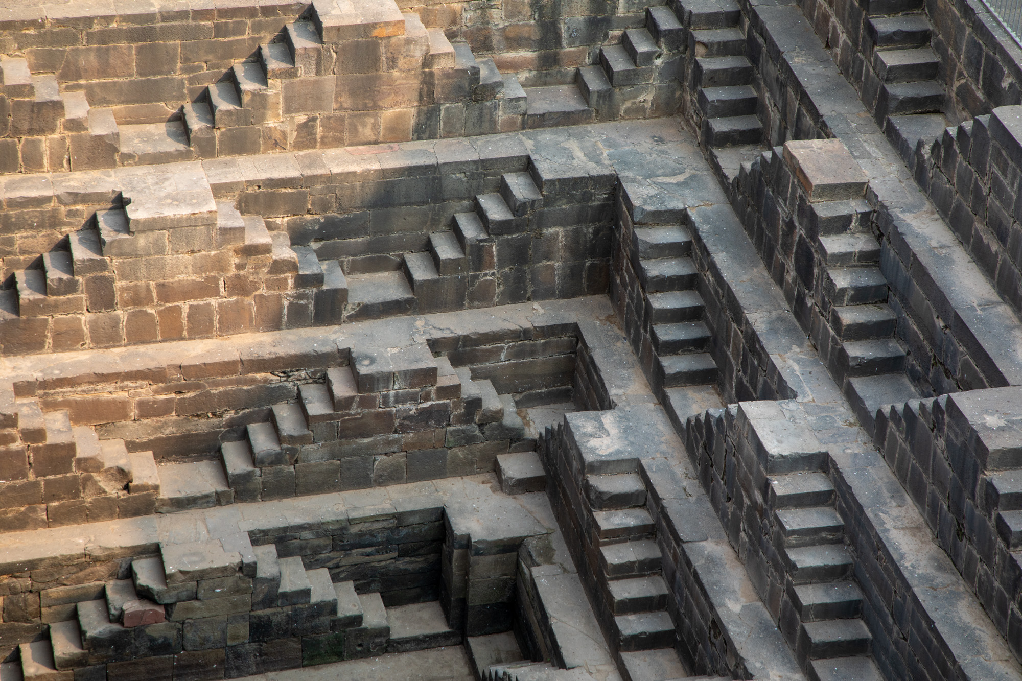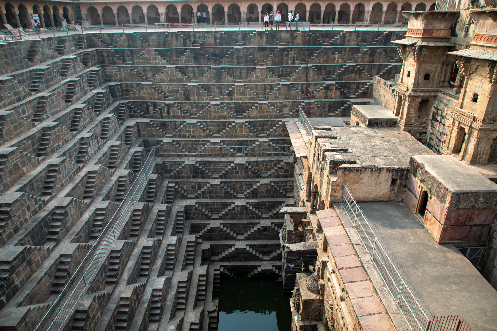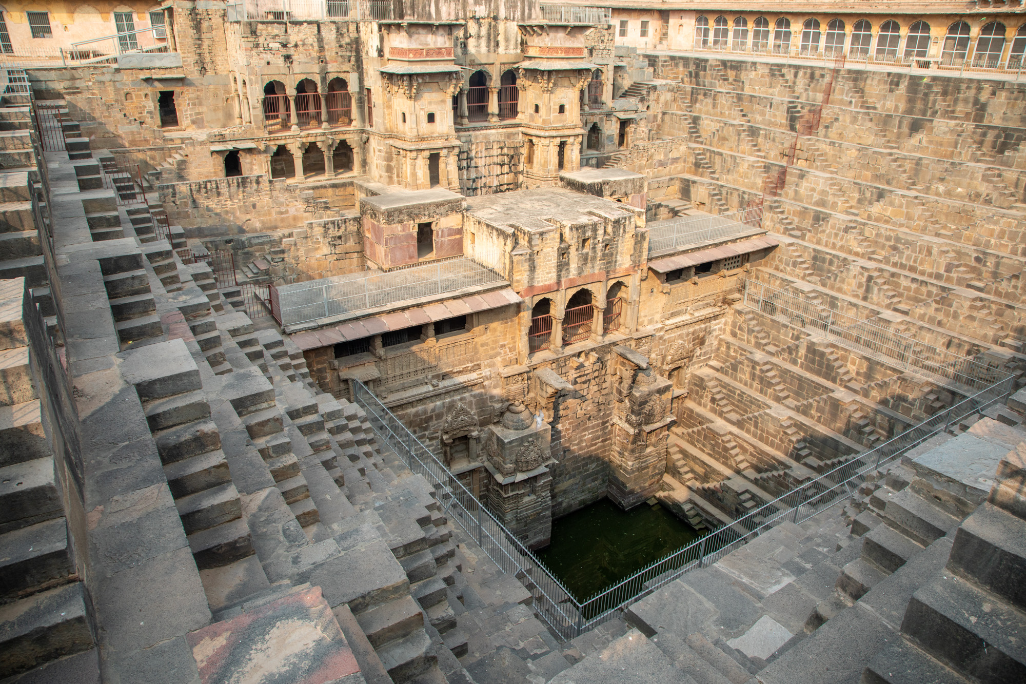 Notre prochaine étape se situe à proximité de Jaipur déjà, il s’agit du village d’Abhaneri. On y arrive en fin d’après midi après une longue et monotone route sur une voie rapide au milieu de la campagne désertique du Rajasthan. A Abhaneri se trouve un des puits sacrés les plus impressionnants d’Inde, Chand Baori, qui plonge profondément jusqu’au point d’eau. La géométrie du lieu est fascinante, avec des escaliers qui descendent par paliers.