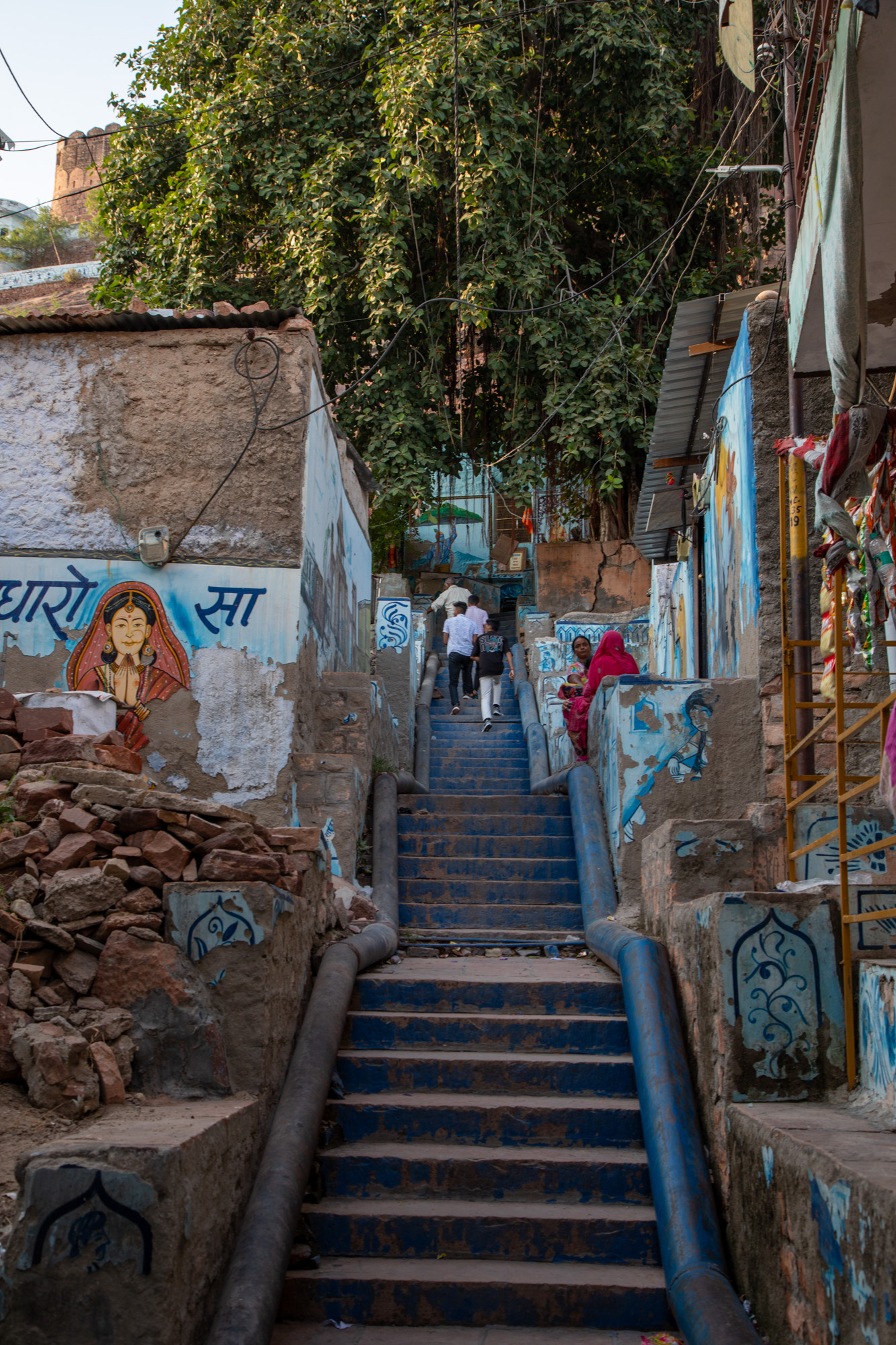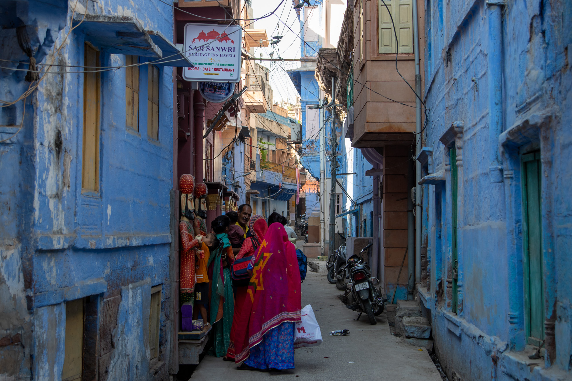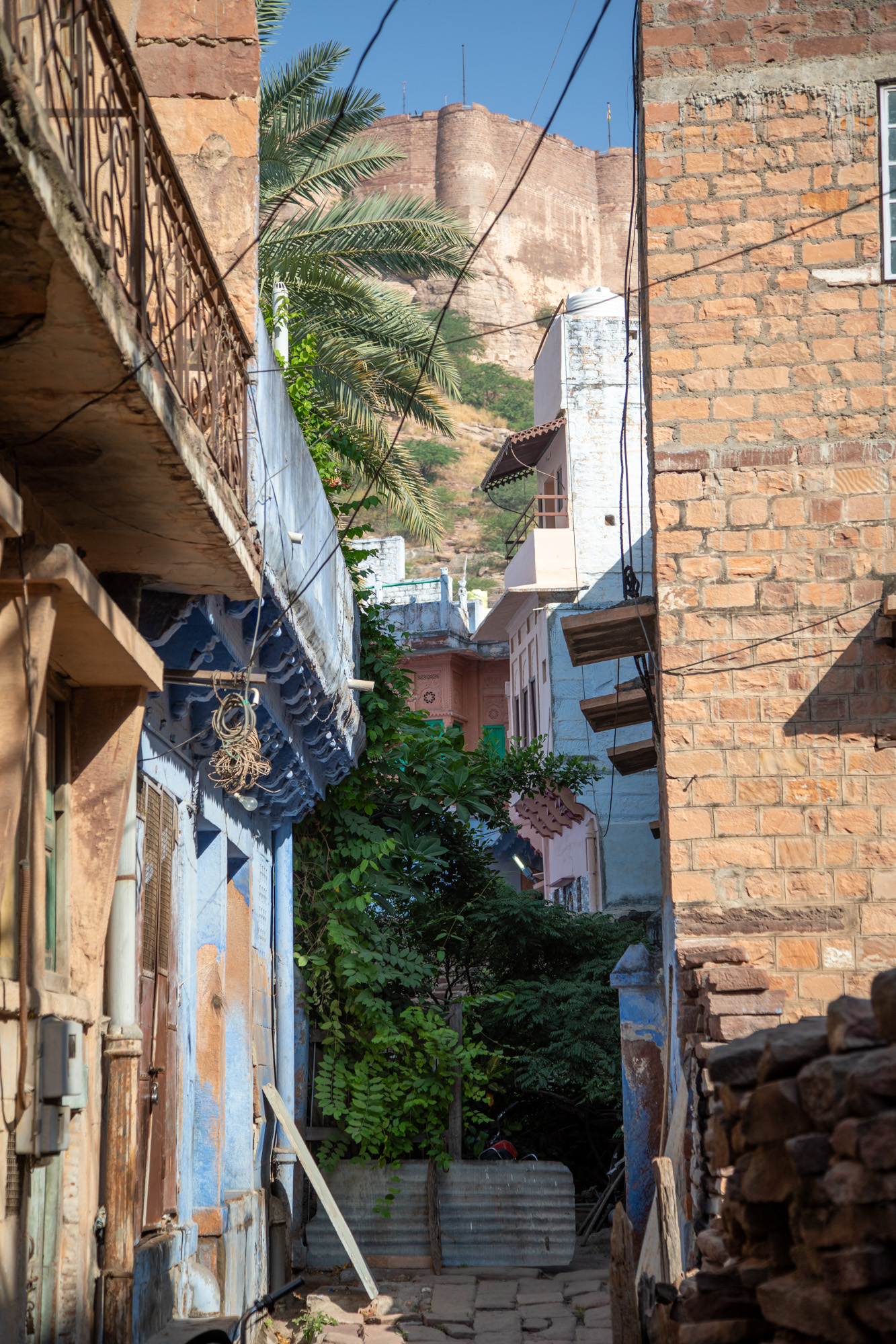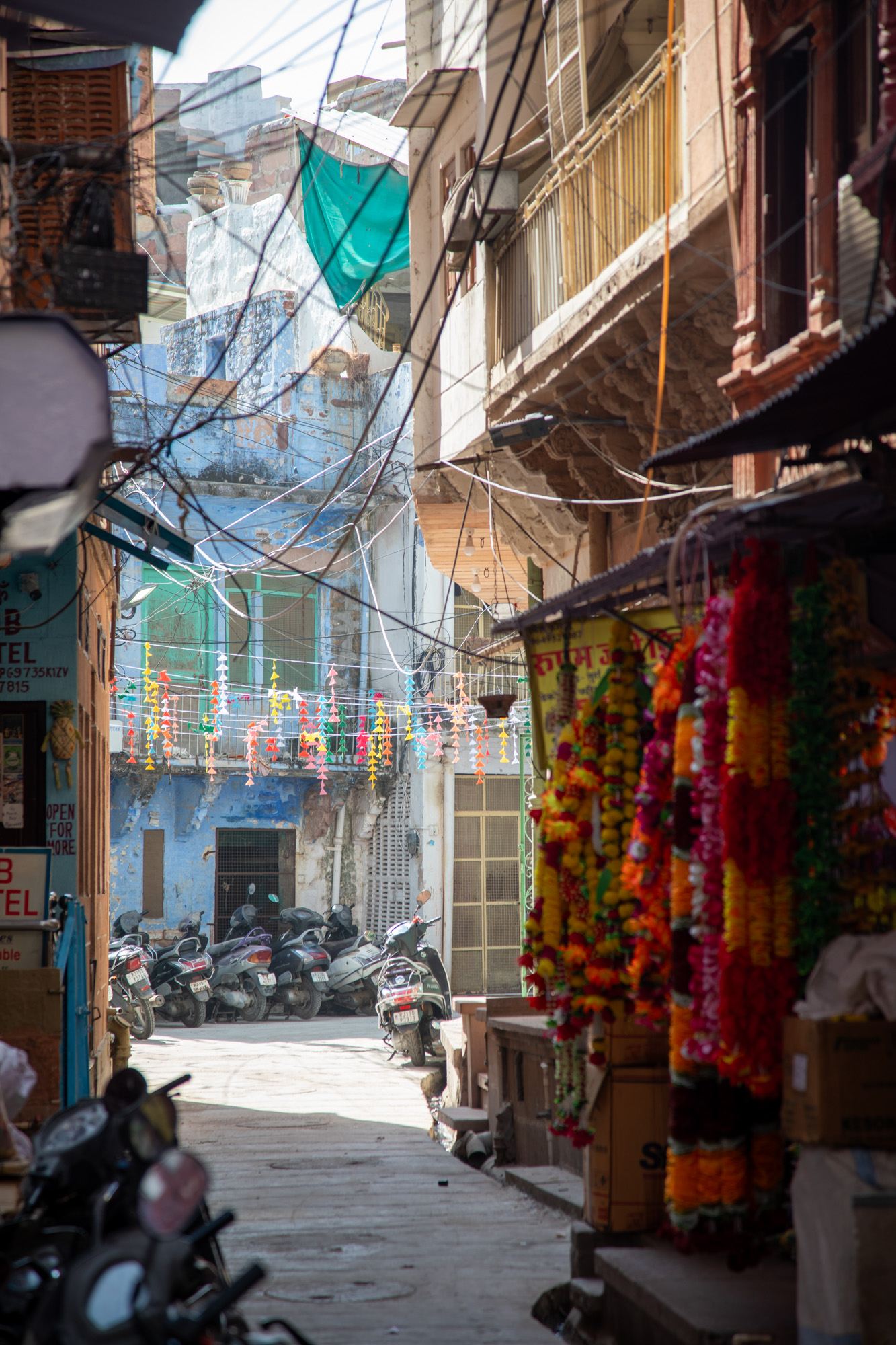 La vieille ville de Jodhpur a vraiment des airs de ville du désert, comme dans un conte des mille et une nuits. Les ruelles sont étroites, les bâtiments très hauts, le soleil ne passe pas, il y a des odeurs, des chiens rodent, les motos nous frôlent, la mosquée fait les appels à la prière. Il y a déjà pas mal de boutiques pour les touristes mais on sent que le quartier a gardé encore son âme.