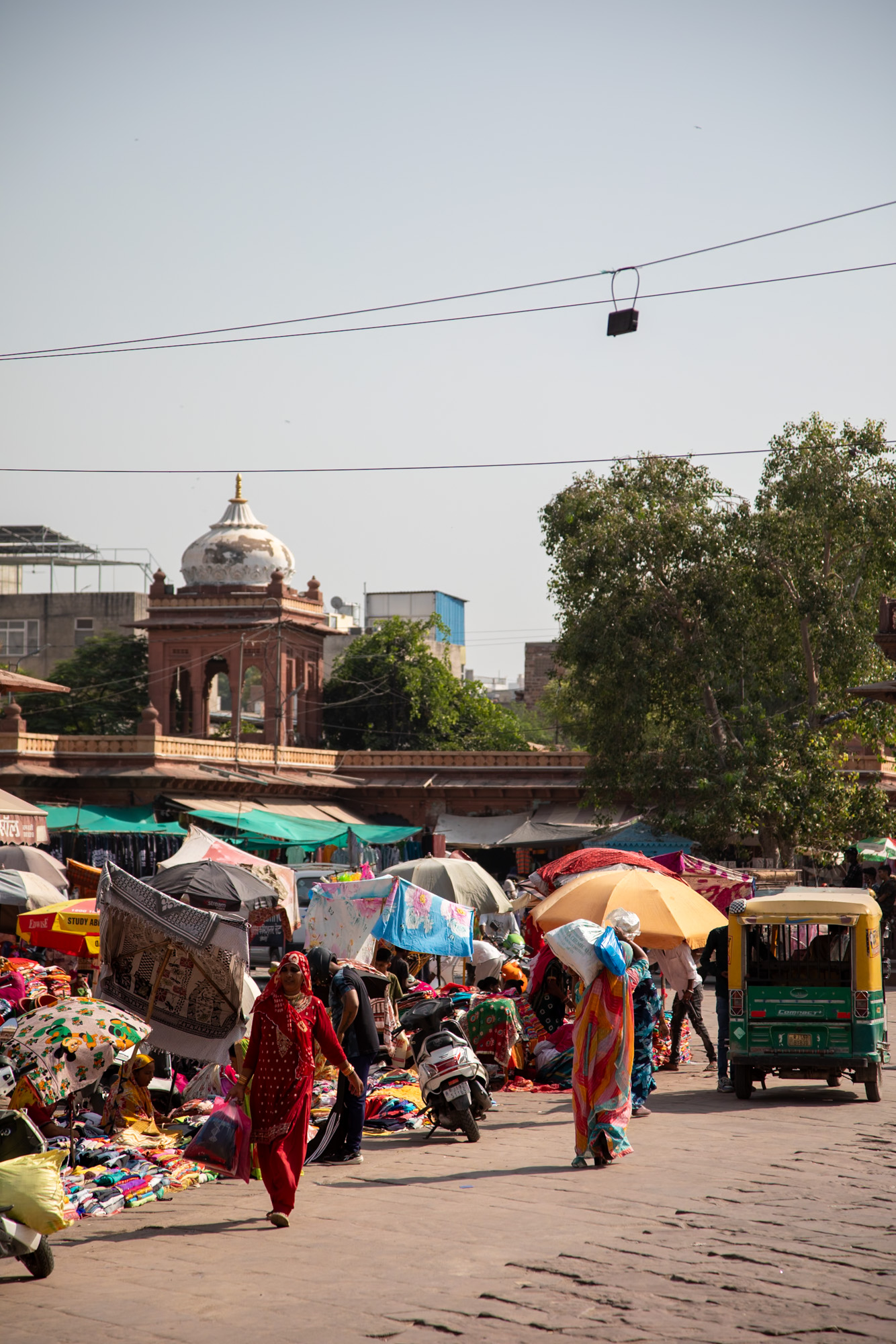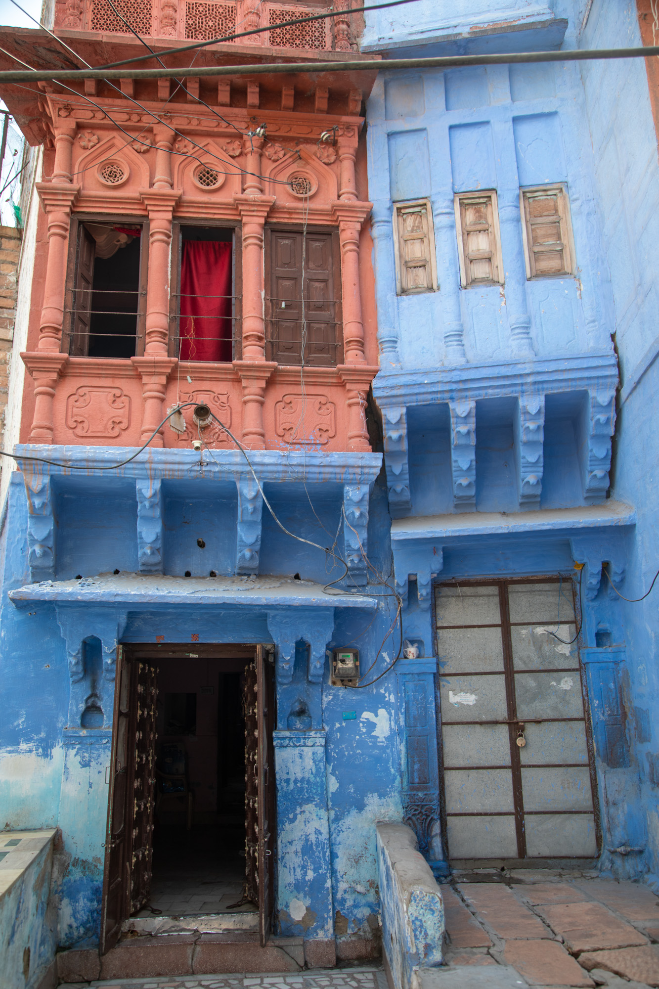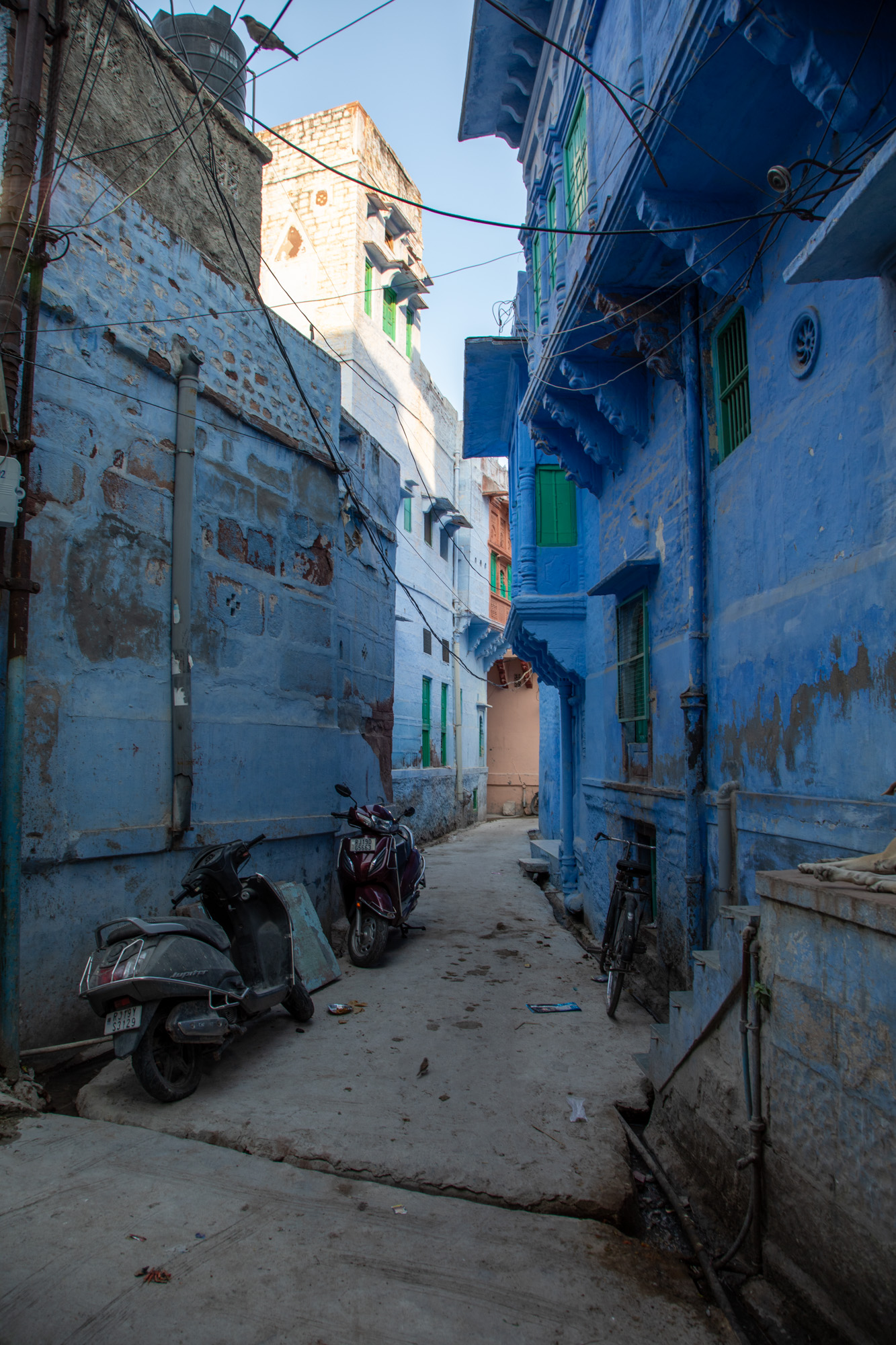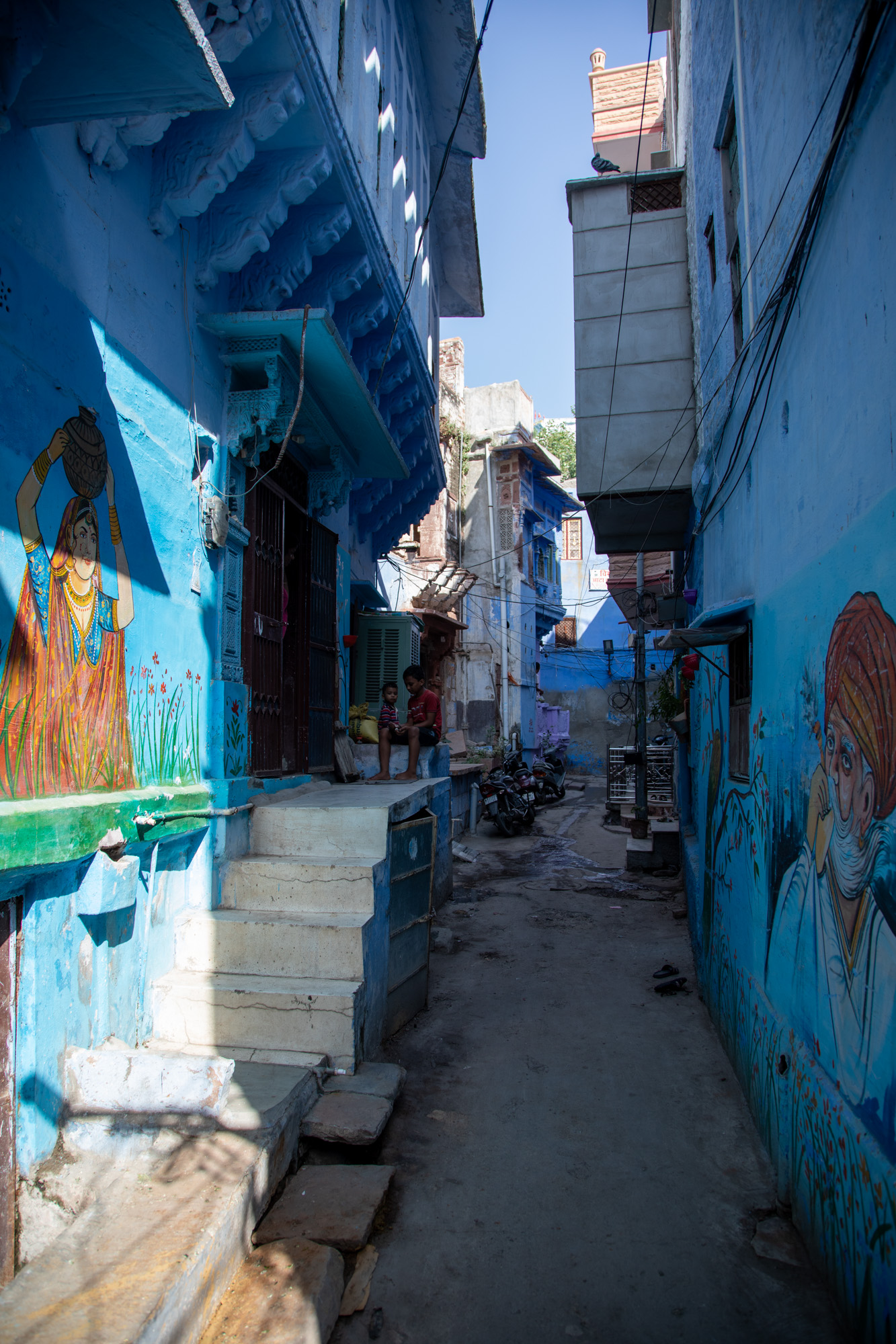 La vieille ville de Jodhpur a vraiment des airs de ville du désert, comme dans un conte des mille et une nuits. Les ruelles sont étroites, les bâtiments très hauts, le soleil ne passe pas, il y a des odeurs, des chiens rodent, les motos nous frôlent, la mosquée fait les appels à la prière. Il y a déjà pas mal de boutiques pour les touristes mais on sent que le quartier a gardé encore son âme.