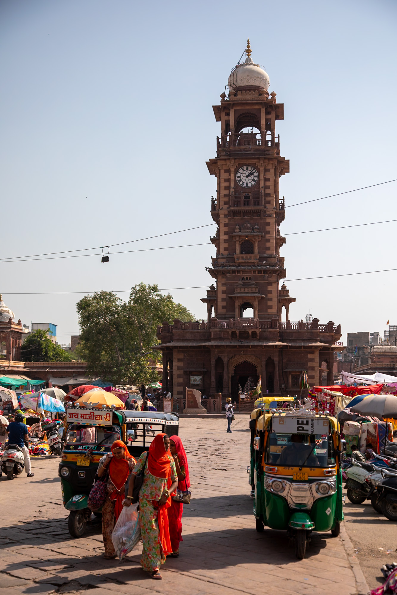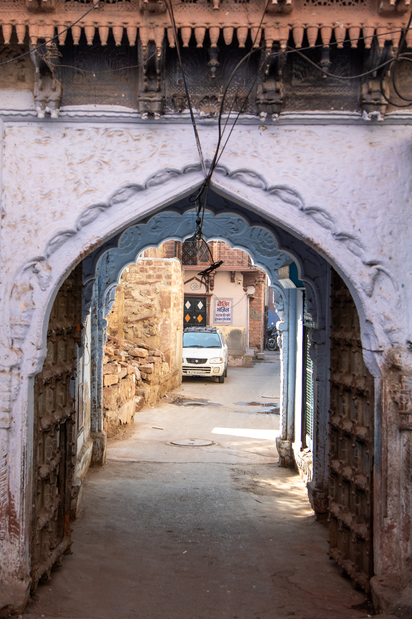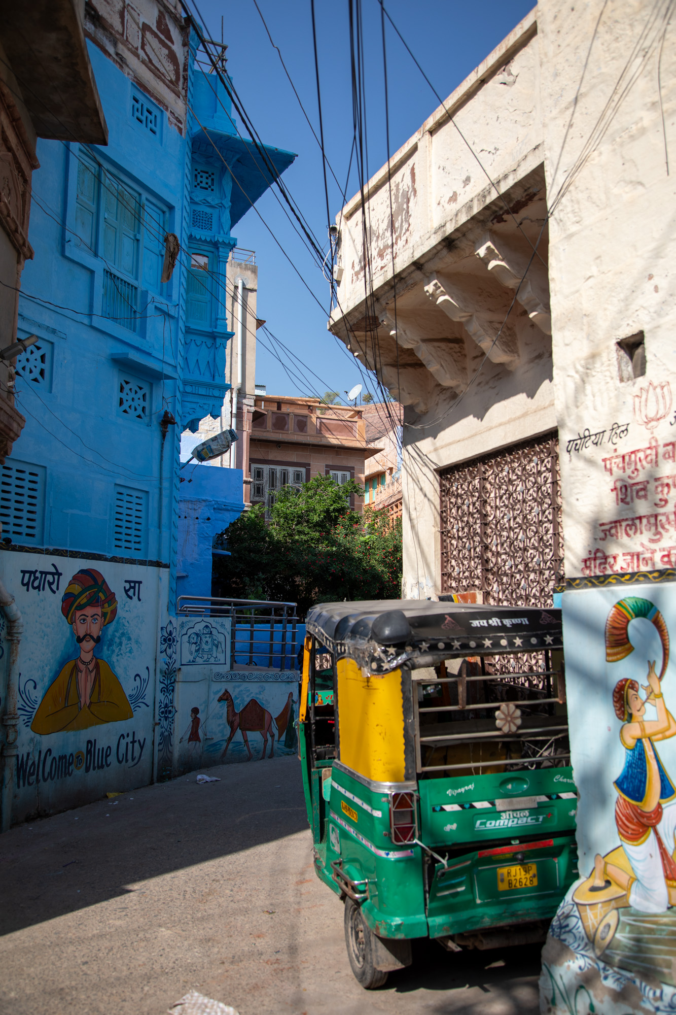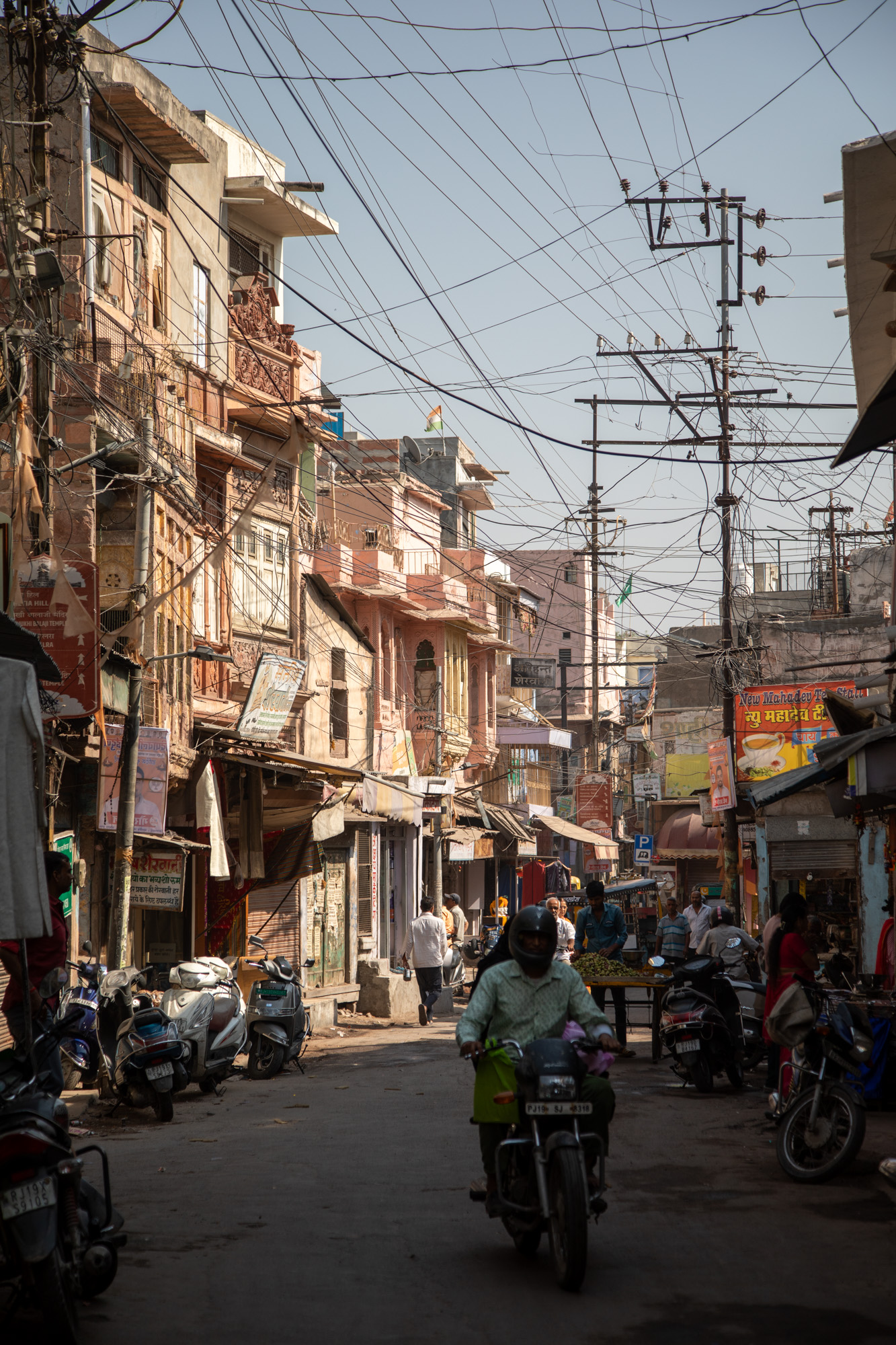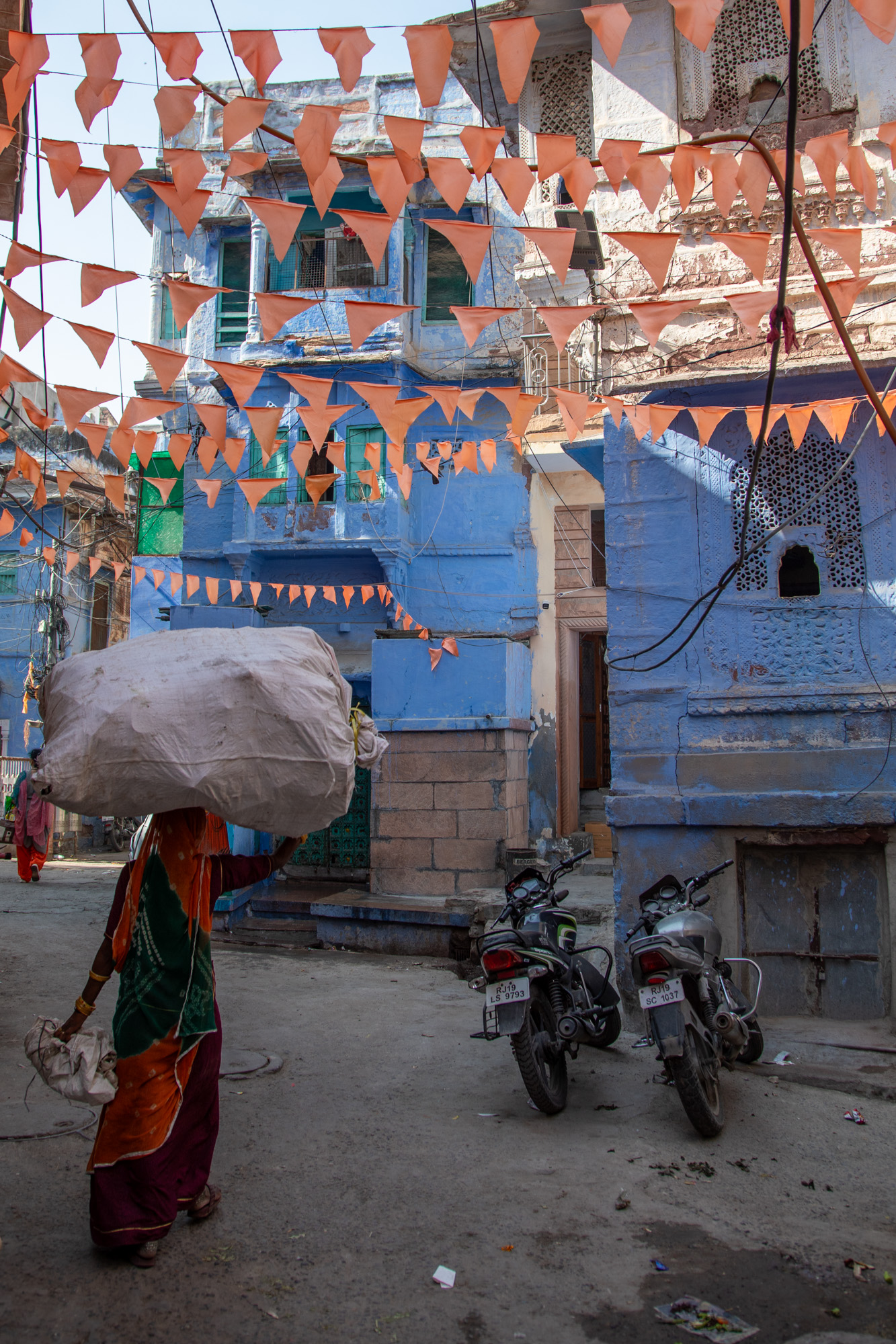 La vieille ville de Jodhpur a vraiment des airs de ville du désert, comme dans un conte des mille et une nuits. Les ruelles sont étroites, les bâtiments très hauts, le soleil ne passe pas, il y a des odeurs, des chiens rodent, les motos nous frôlent, la mosquée fait les appels à la prière. Il y a déjà pas mal de boutiques pour les touristes mais on sent que le quartier a gardé encore son âme.