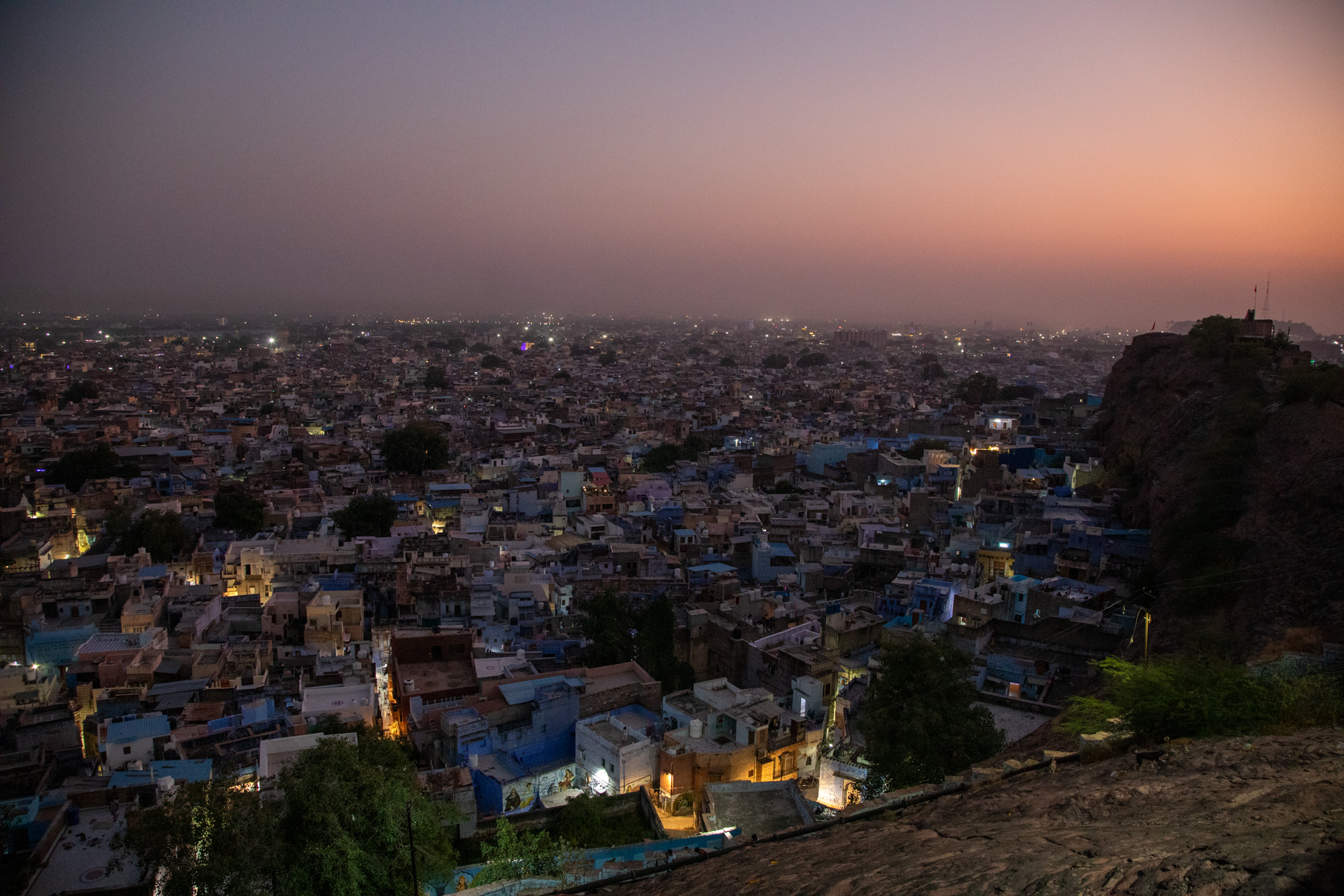 Avec les lumières qui commencent à scintiller, le spectacle continue malgré la nuit qui arrive. Cette soirée au dessus des toits de Jodhpur est fantastique, on ne peut que recommander de monter au niveau du temple de Maa Jwalamukhi Devi pour avoir un des meilleurs couchers de soleil du Rajasthan.
