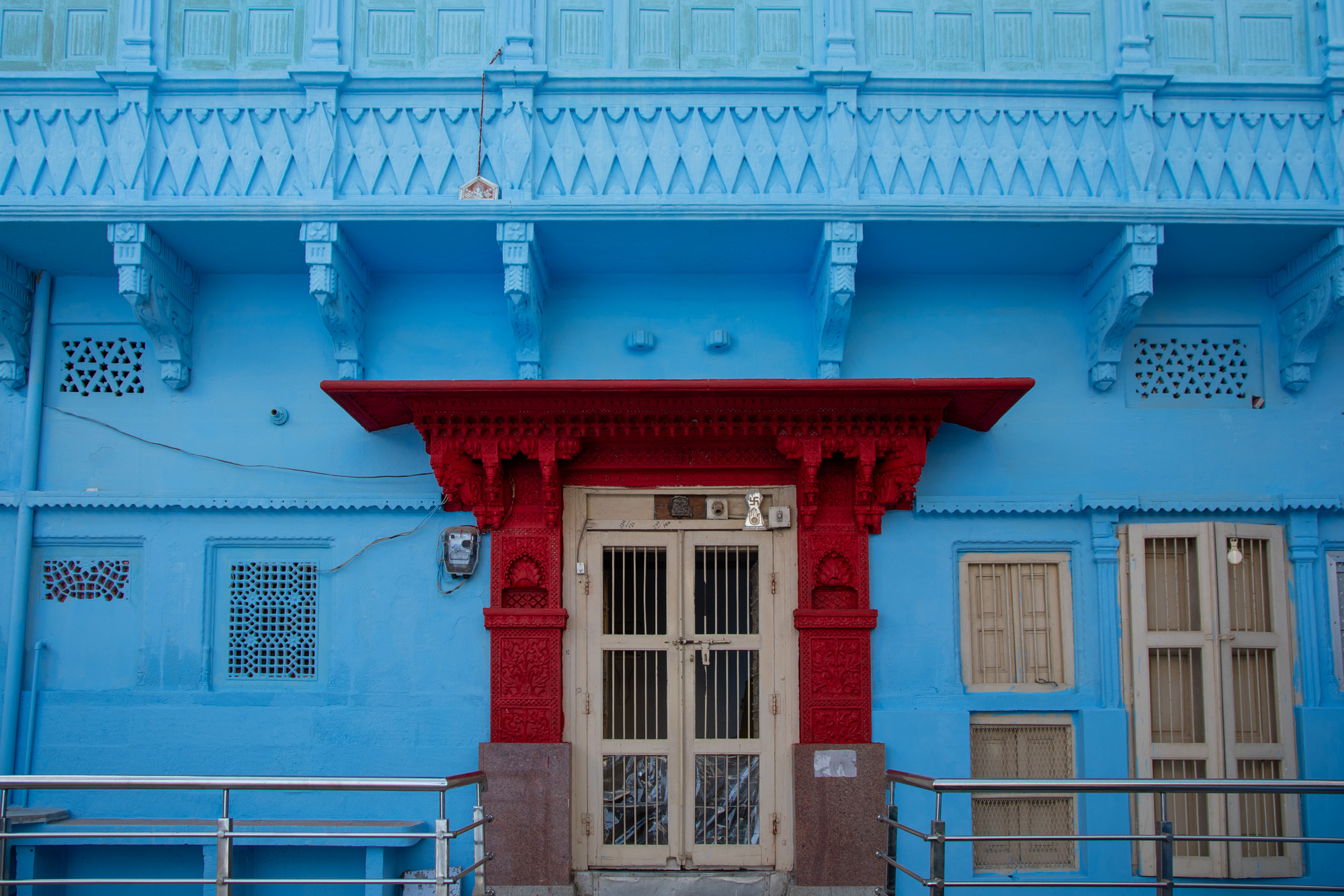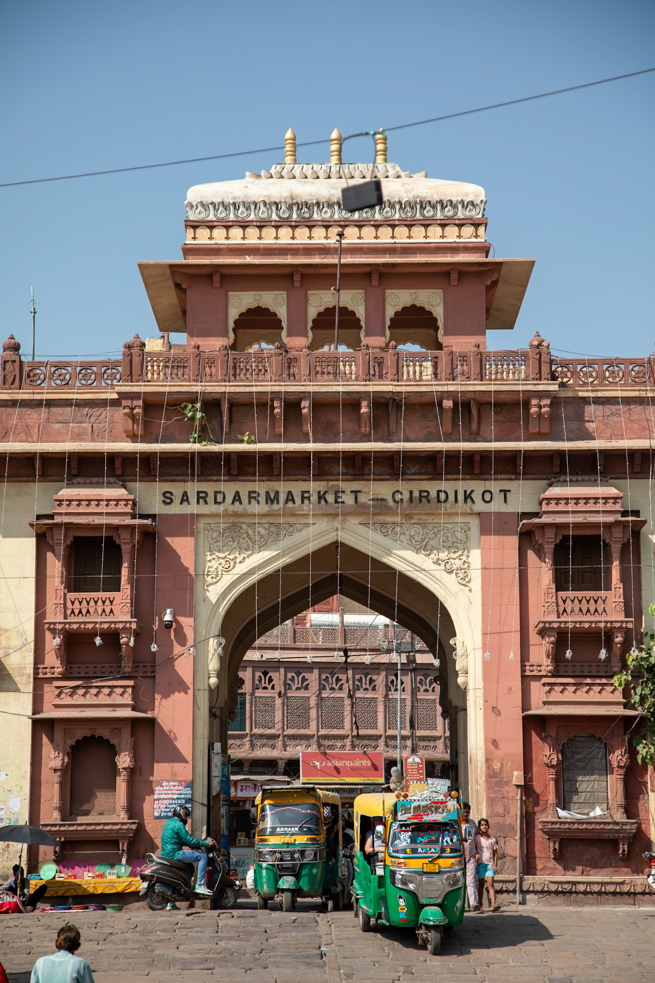 On a bien fait de couper la route depuis Jaipur jusqu’à Jodhpur par une soirée au lac Pushkar. Le taxi que l’on avait réservé pour la course de la veille revient nous chercher le matin pour la deuxième partie du trajet jusqu’à la ville bleue. La route est monotone, c’est plat et aride et un peu long, on en profite pour se reposer car les nuits sont souvent perturbées en Inde par le bruit. Avec Diwali qui approche, il y a beaucoup de jeunes qui jouent avec des pétards la nuit et c’est pas le même genre de pétards que l’on trouve en France, le bruit est terriblement puissant et nous réveille plusieurs fois. On arrive en milieu d’après mid à Jodhpur et depuis la route on ne peut pas manquer la vue sur la forteresse de Mehrangarh qui domine l’horizon. Construite sur un piton rocheux, l’immense palais a des dimensions incroyables. La ville de Jodhpur est plus étendue que l’on pensait, c’est en fait la deuxième ville de la région du Rajasthan après Jaipur et il y a un trafic monstrueux dans les rues de la ville. L’animation des rues est comme on l’imaginait avant notre voyage en Inde, de la foule, des voitures, des rickshaw, des klaxons.On arrive à la place de l’horloge où le taxi est obligé de nous déposer, l’entrée de la vieille ville est interdit, les rues sont trop étroites, il faut finir à pied. On remercie chaleureusement notre chauffeur qui nous a accompagné pendant ces deux trajets entre Jaipur et Pushkar et Pushkar à Jodhpur, on met les sac sur le dos et on pénètre dans la vieille ville par une porte joliment décorée.