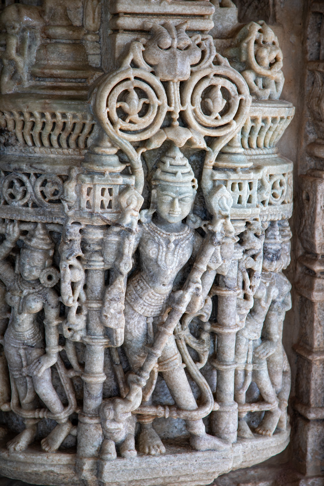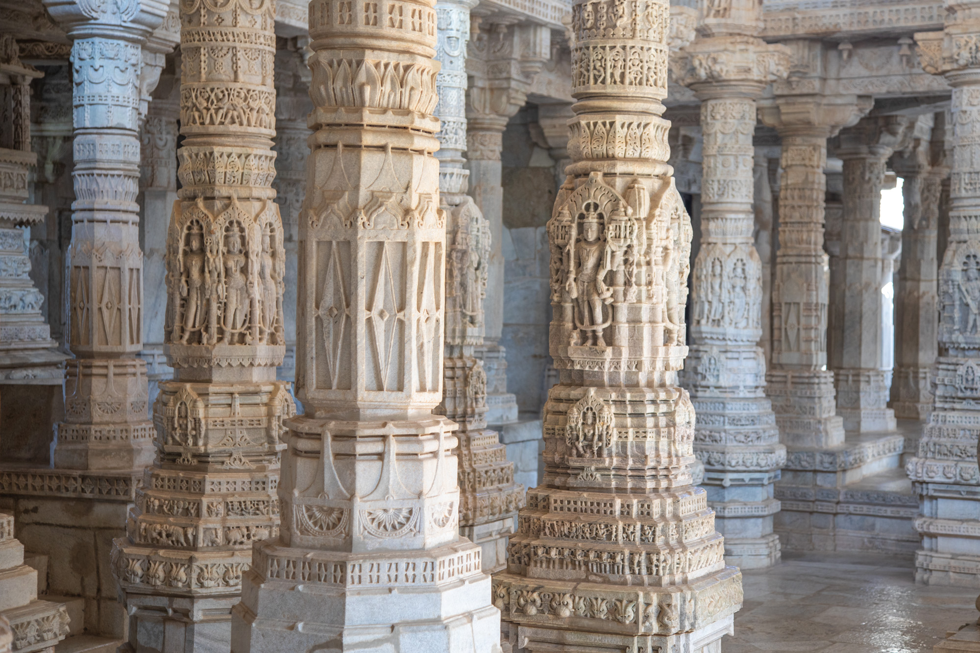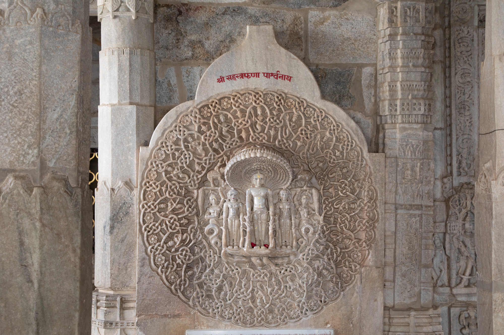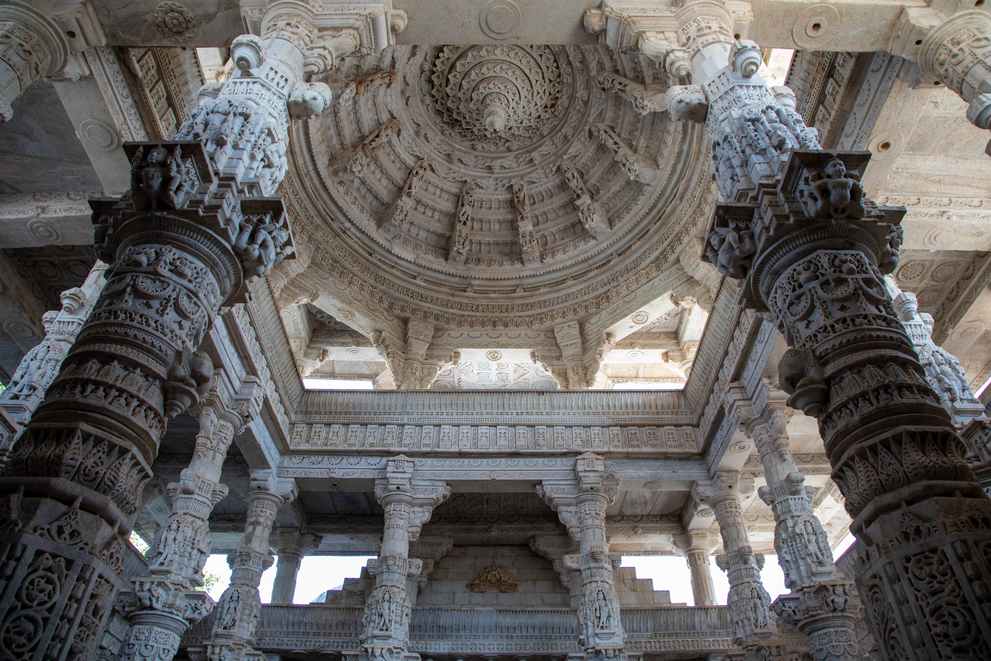 Nous partons en matinée avec un taxi de Jodhpur pour la dernière étape de ce voyage Rajasthan, mais avant de rejoindre la ville lacustre, on fait un détour par le temple Jain de Ranakpur niché au coeur des collines des montagnes Aravalli. La route pour rejoindre le temple quitte la plaine et commence à serpenter dans un paysage sauvages. Une autre Inde défile sous nos yeux, jusqu’à maintenant nous n’avions connu que des villes. On se serait bien arrêté plus longtemps dans ce coin, il y a d’ailleurs plusieurs guesthouses en retrait de la route, et des panneaux mentionnent la possibiité de faire des safari pour voir les animaux sauvages de la réserve de Kumbhalgarh National Park où vit notamment le léopard. On s’arrête dans un restaurant très mignon construit en contrebas de la route, face à une petite rivière où des chèvres broutent. On arrive au temple de Ranakpur en milieu d’après midi, c’est un temple de la religion Jain, différente de ce que l’on a pu voir jusqu’à maintenant. Fait de marbre, le temple est magnifique avec des sculptures somptueuses.
