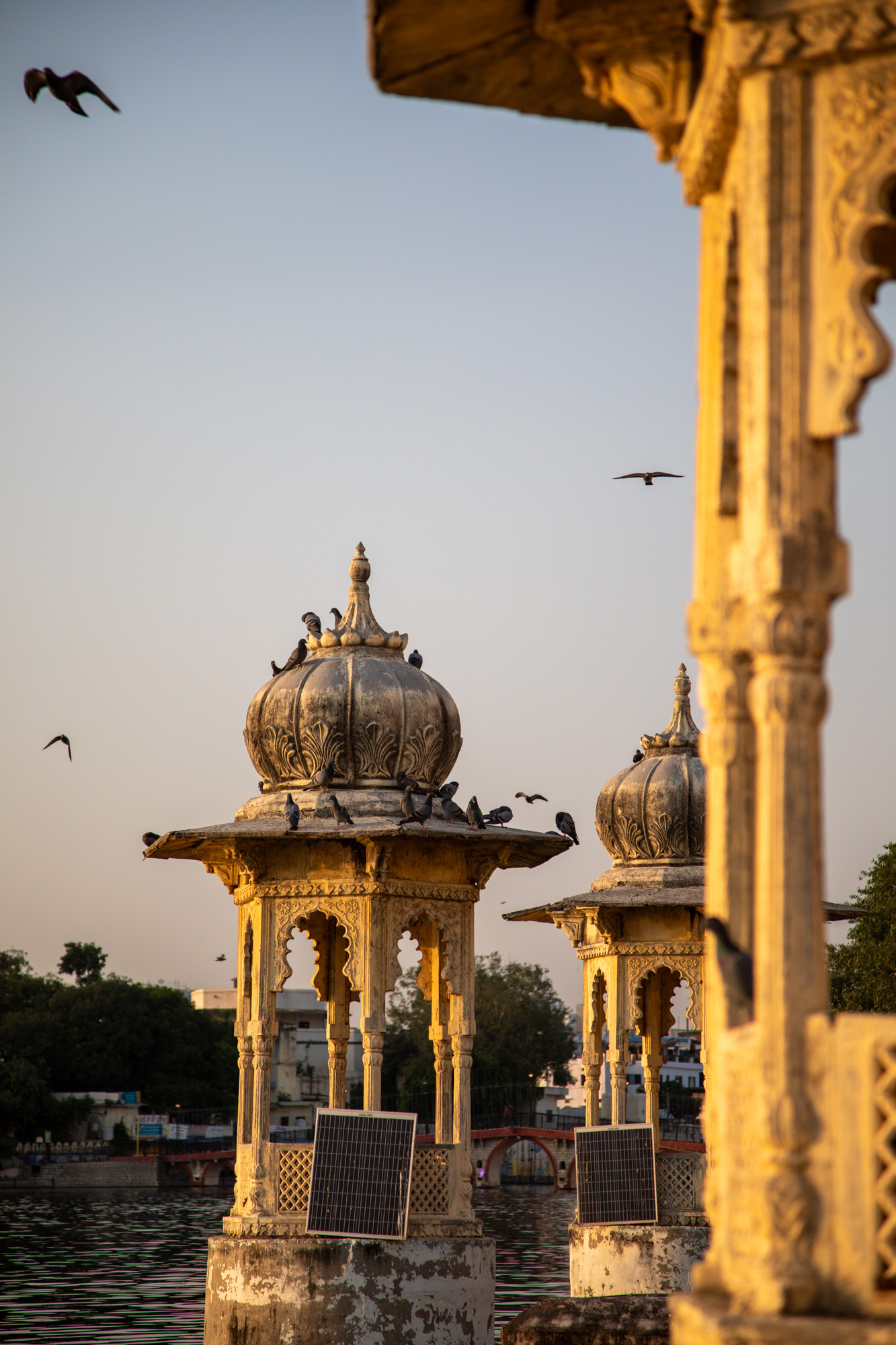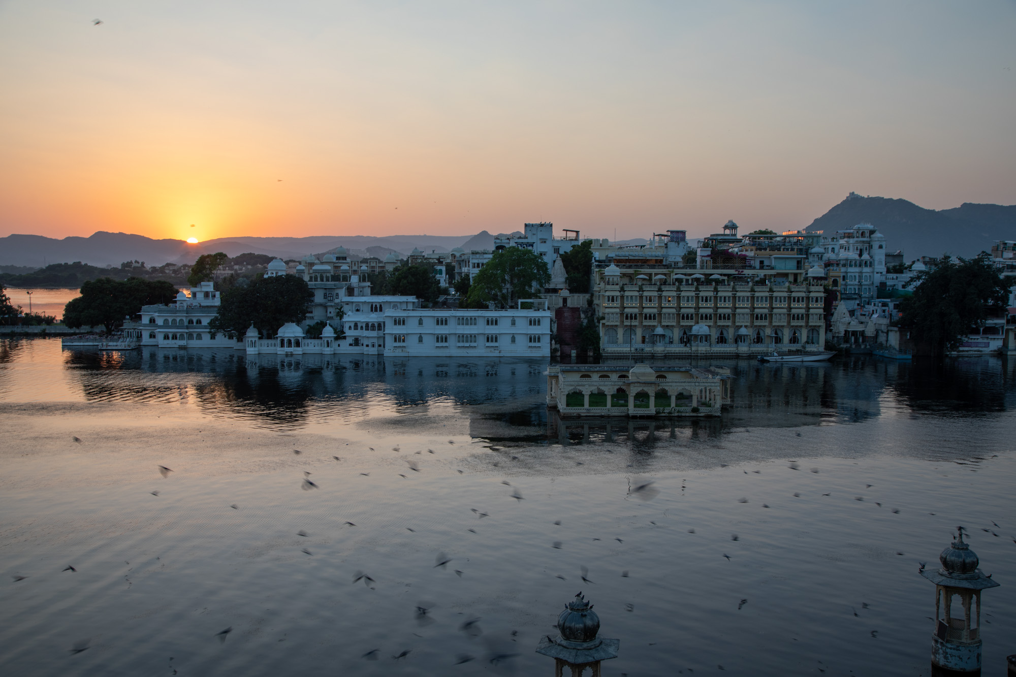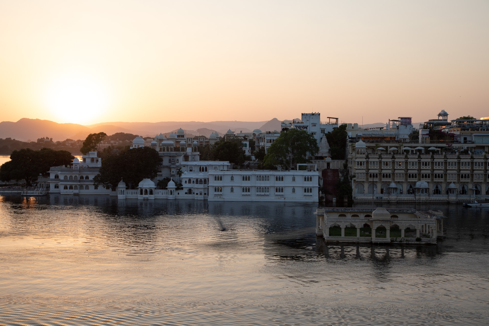 Après cette très belle visite, on reprend la route et on arrive à Udaipur un peu avant le coucher de soleil. Le taxi n’a pas le droit de pénétrer dans le centre ville, on finit donc le chemin à pieds avec le sac sur le dos. Notre hotel est situé juste en face du lac, et comme la plupart, il y a un rooftop qui a une vue splendide. On s’installe pour prendre un rafraichissement face au soleil qui se couche derrière les collines. Le timing est parfait.