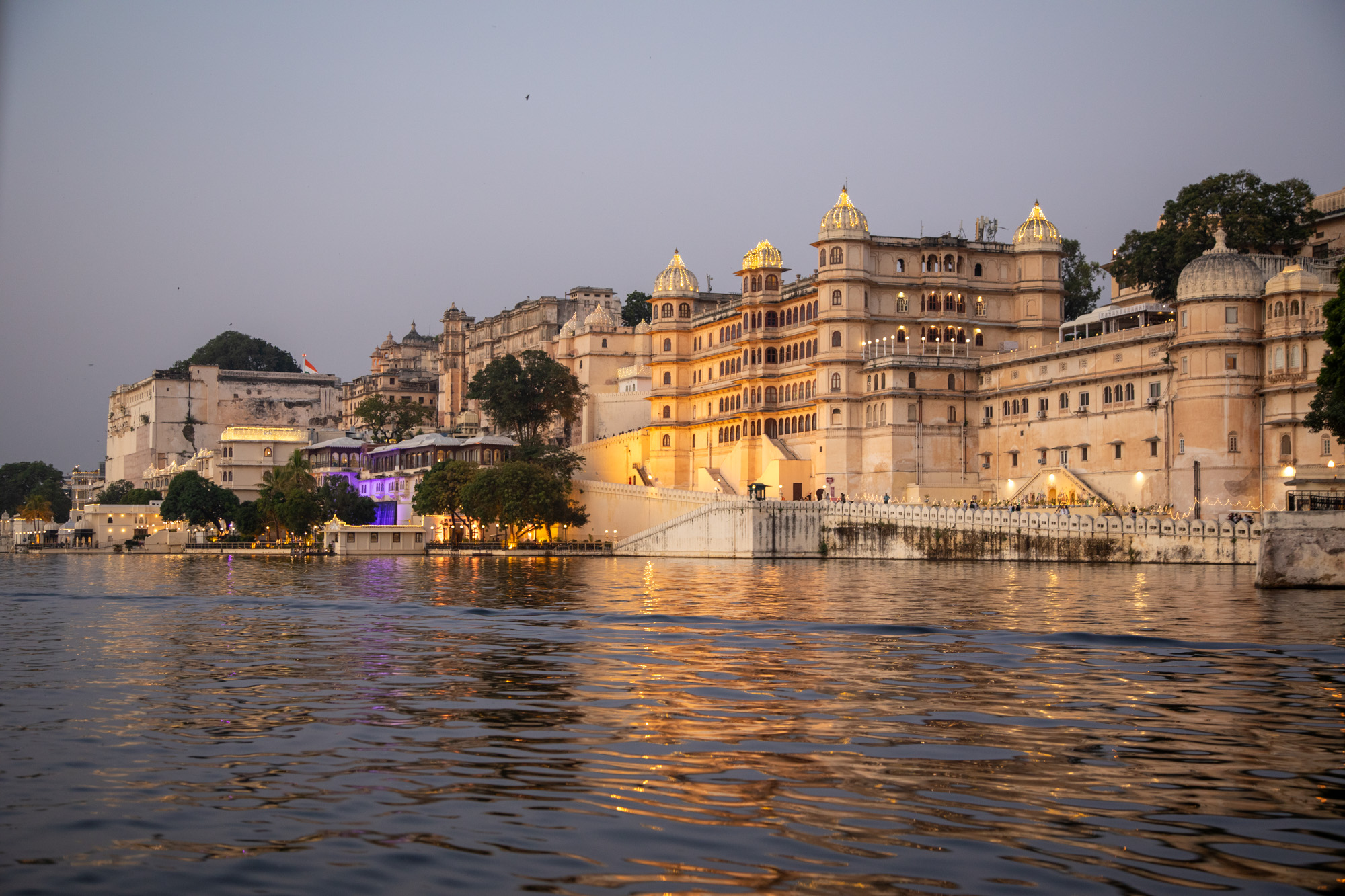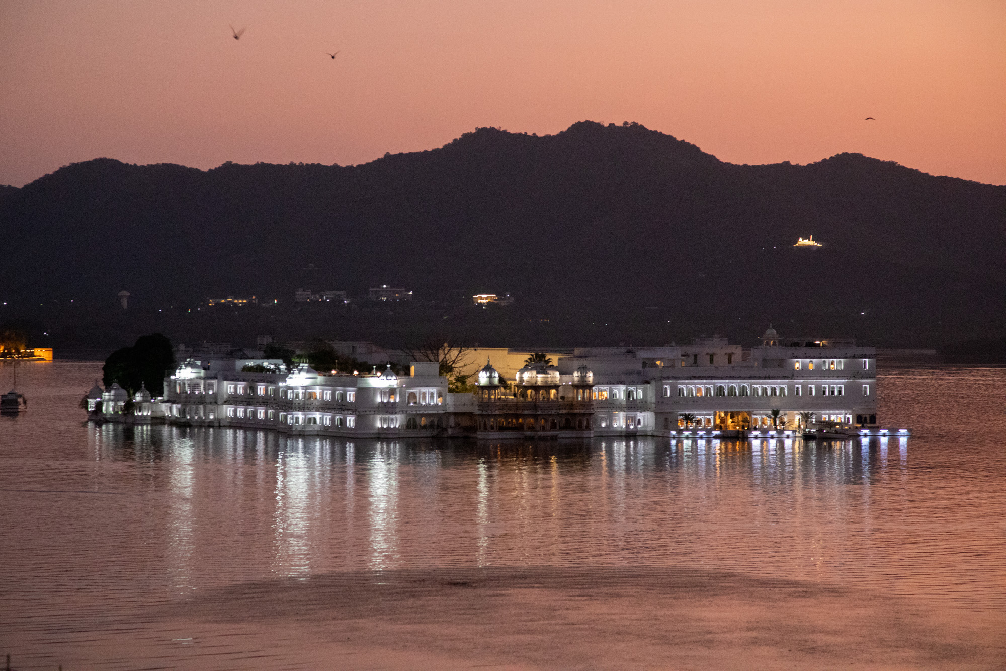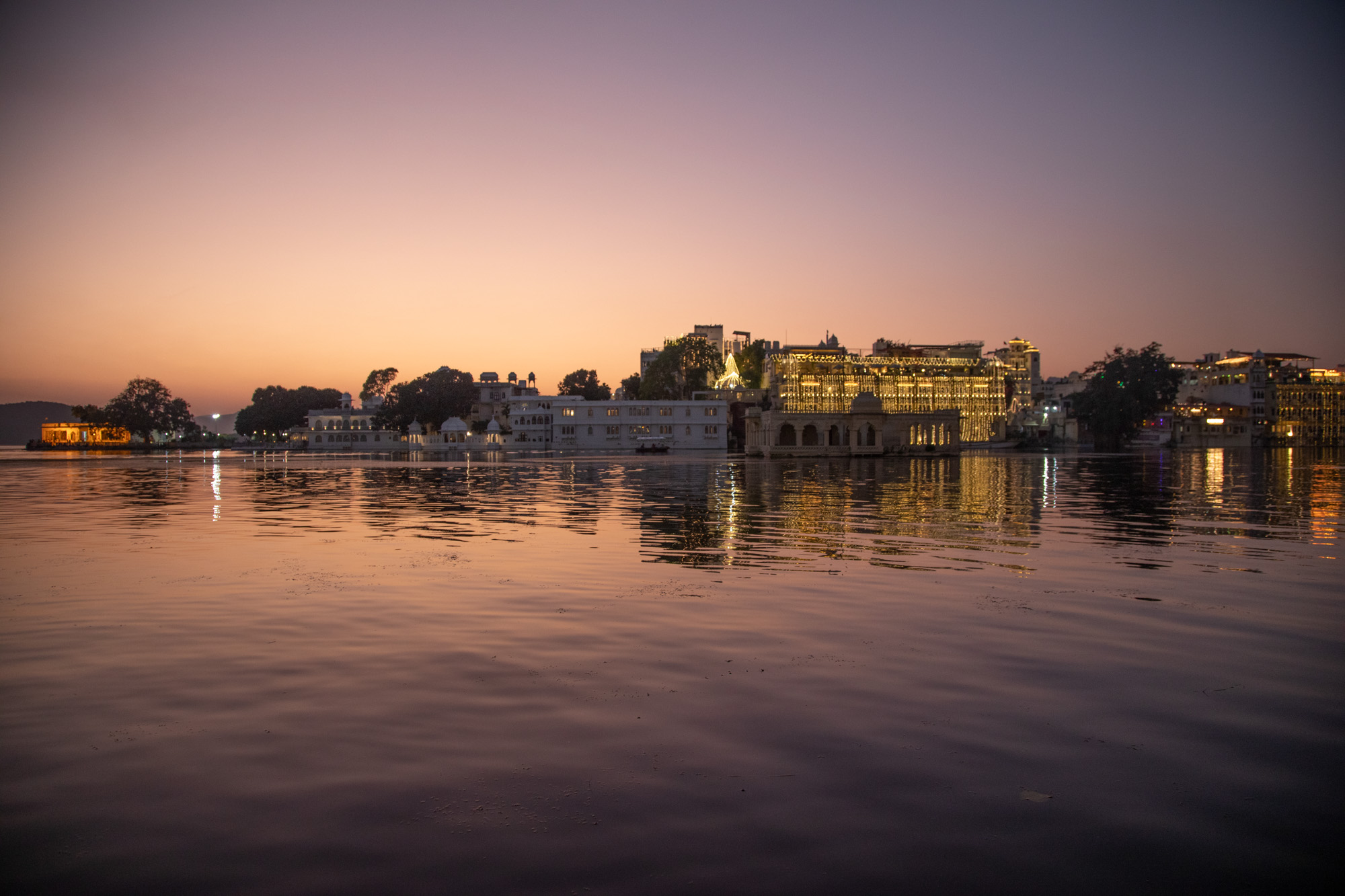 Après le coucher du soleil, les lumières viennent mettre en valeur les batiments qui bordent le lac. Il y a un sens de l'esthétique indénibale à Udaipur, la température a déjà baissé, ce qui fait du bien par rapport à Jodhupr.