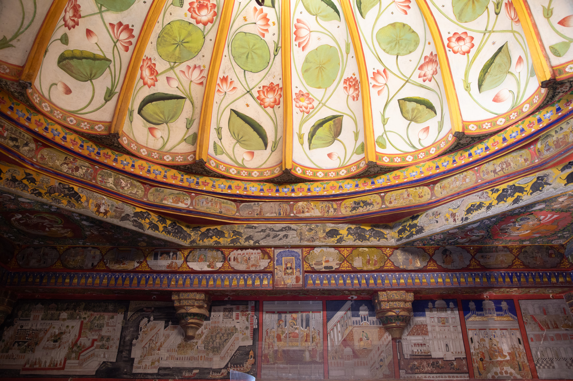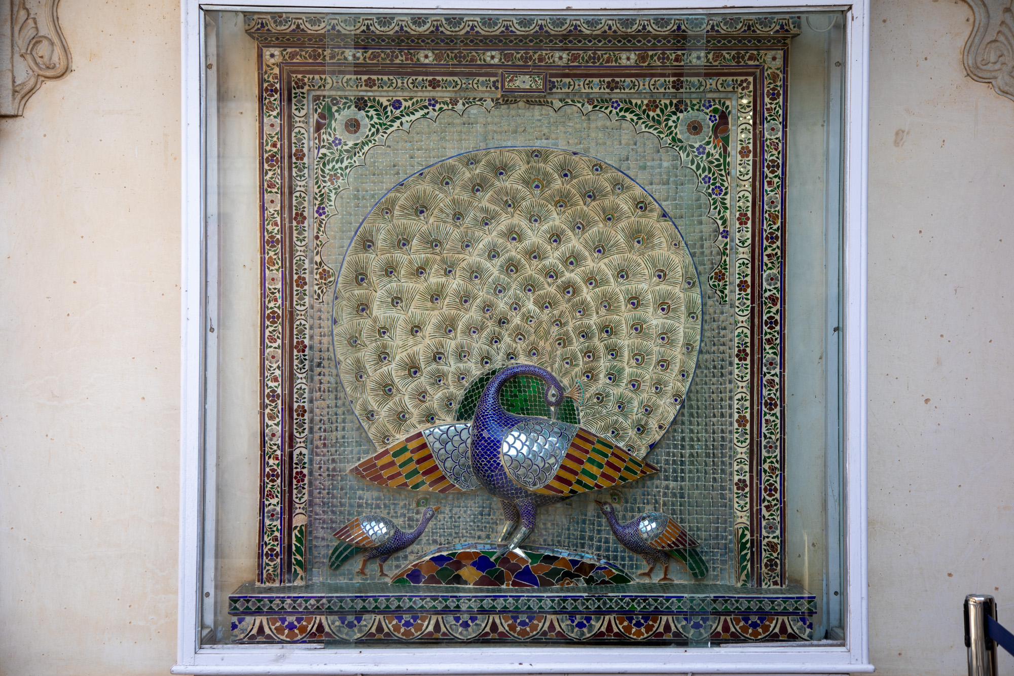 Il y a de symboles royaux disséminées dans les pièces, comme ces poignées de porte en forme de lion, ces masques royaux avec le visage du maharaja dont on n'a surtout pas oublié de dessiner la moustache, les moulures au plafond ont aussi droit à des détails, avec ces fleurs peintes et en son centre de nouveau la tête moustachue du monarque, et bien sur des paons qui sont un des plus beaux symboles de l'Inde.
