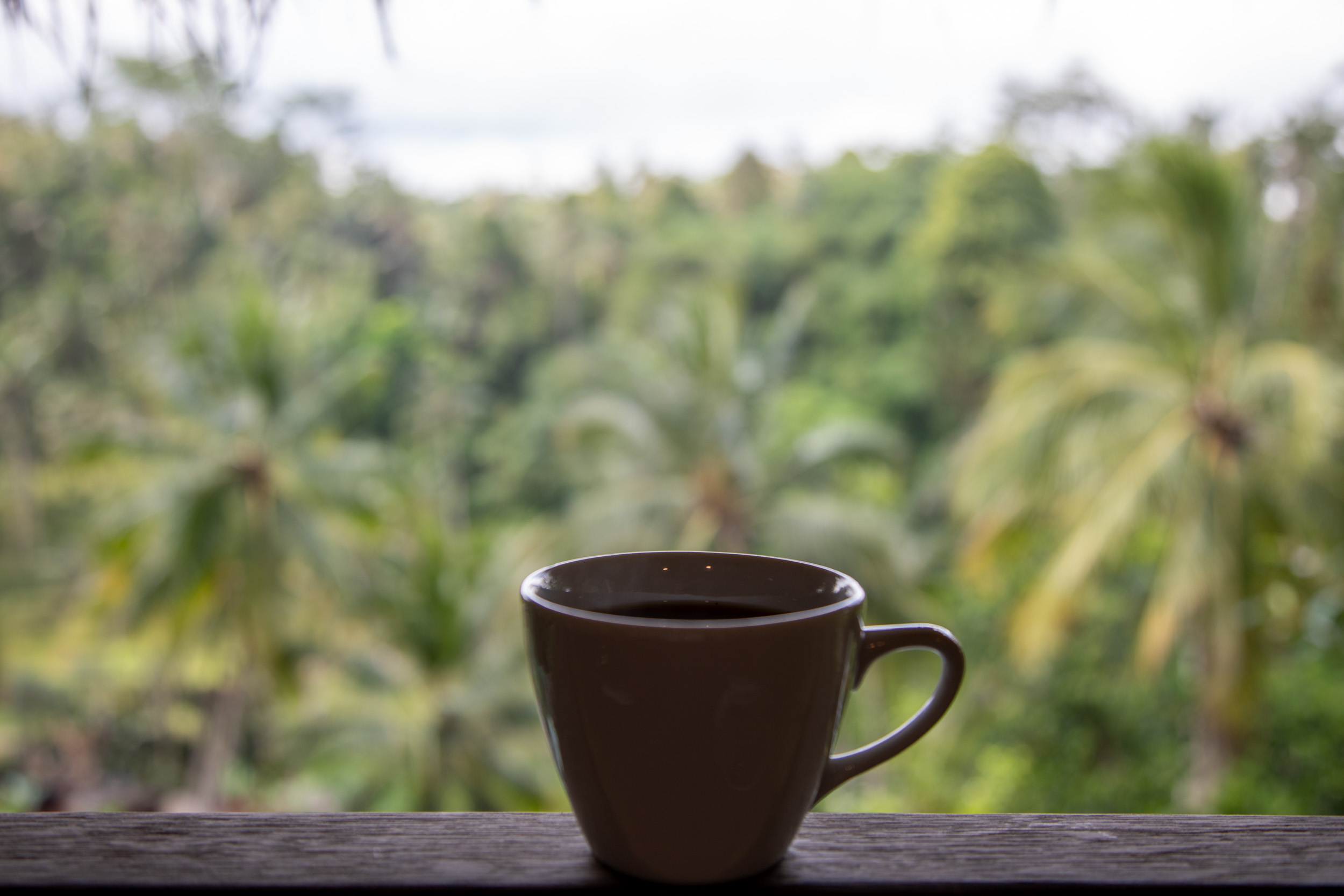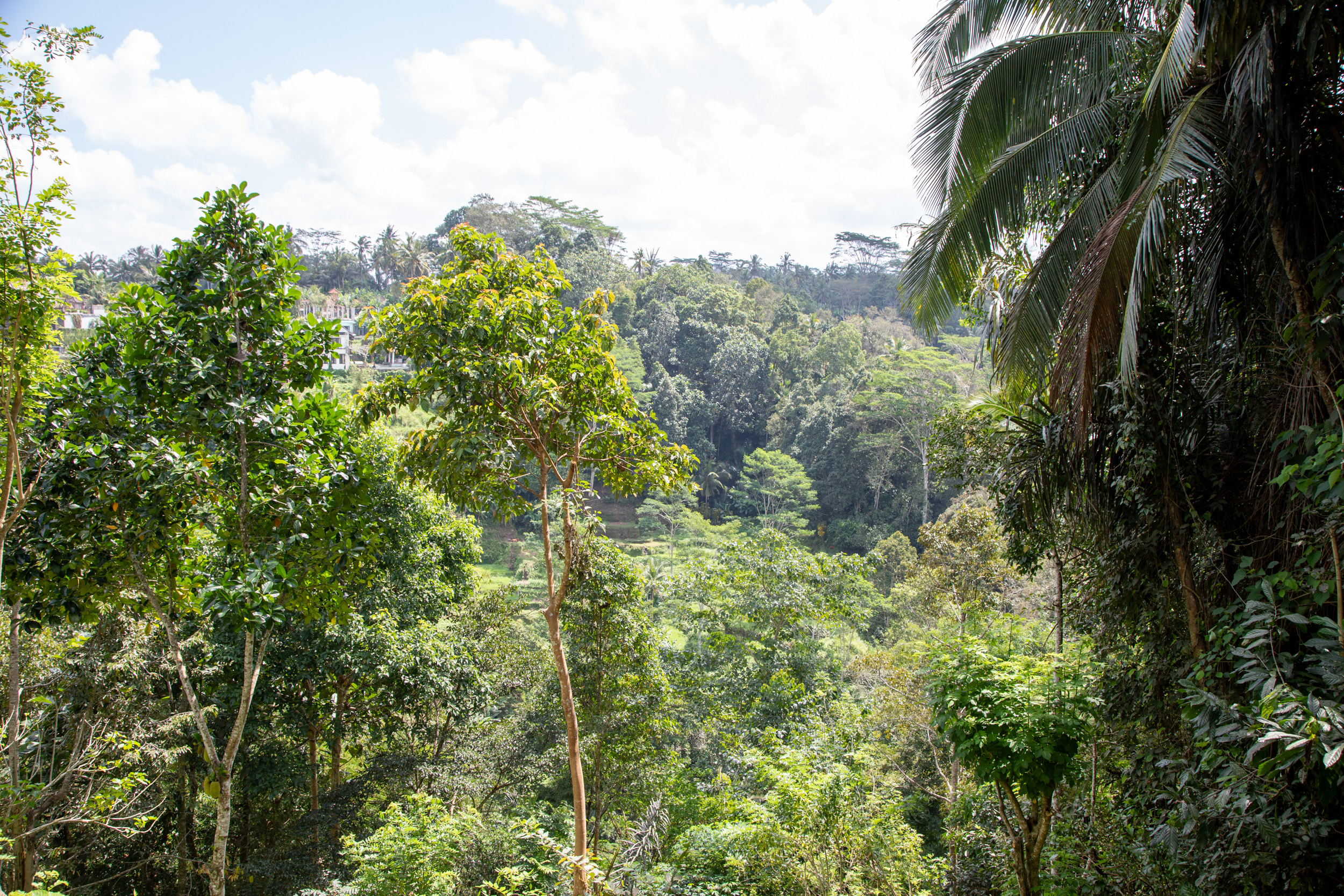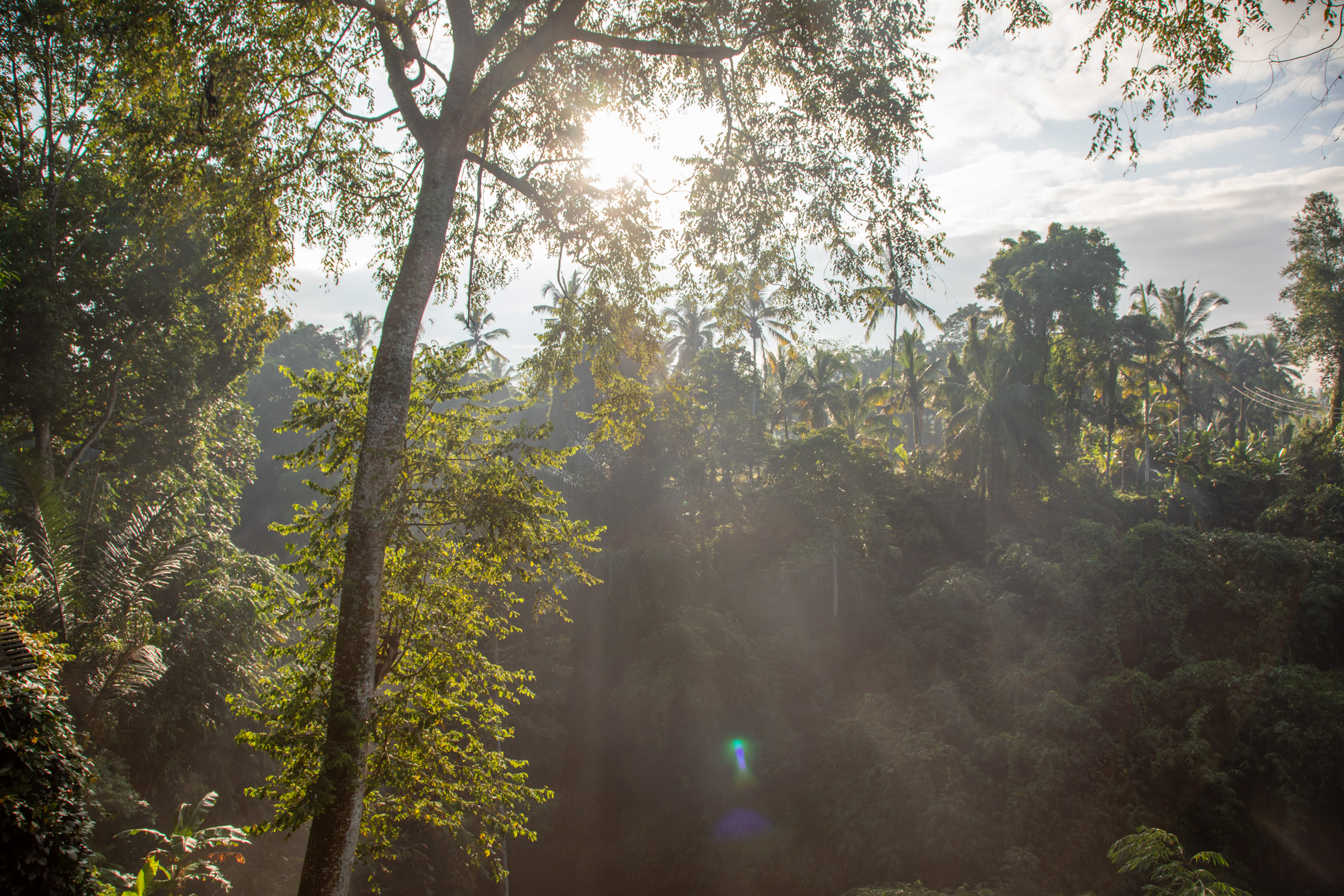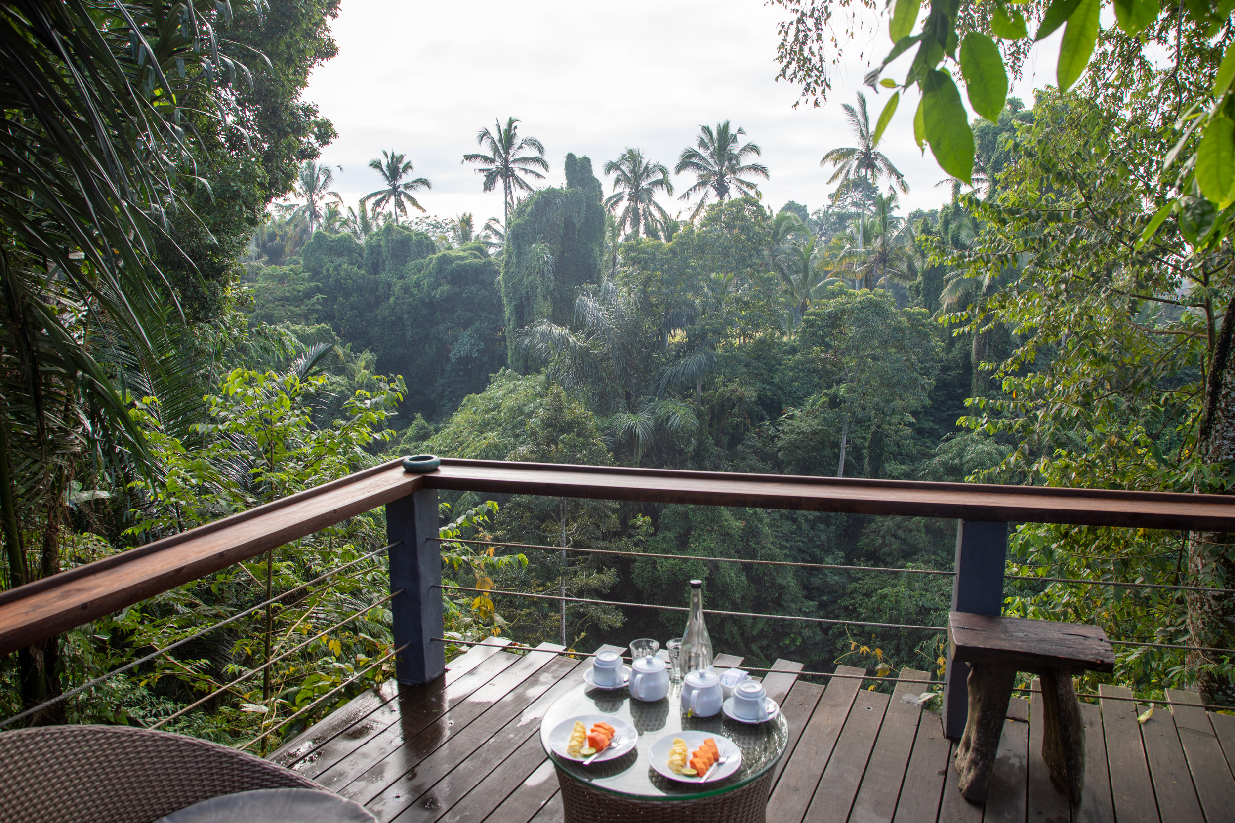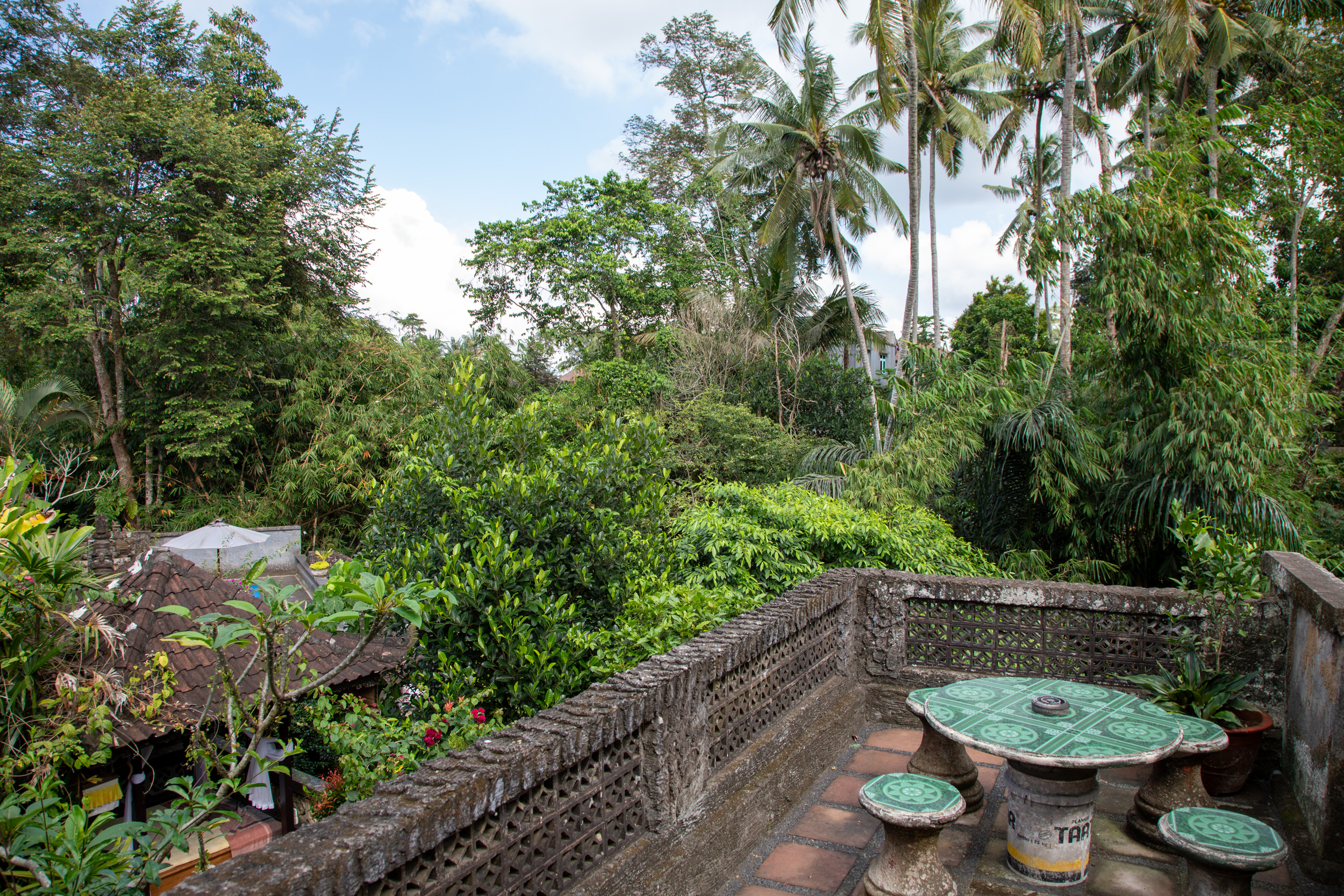 Malgré que l'on ait visité Ubud en plein mois d'Aout, c'est à dire en pleine saison sèche, on n'aura pas eu beaucoup de chance avec le temps. On a eu du soleil le matin mais rapidement pendant l'après midi les nuages arrivaient et parfois on a eu de grosses averses. Les balinais nous ont dit que ce n'est pas normal que le temps soit aussi humide en Aout. En tout cas, on a passé notre dernière journée à contourner la pluie. Le matin, nous avons pu profiter d'un petit déjeuner avec vue sur la jungle depuis notre hotel.