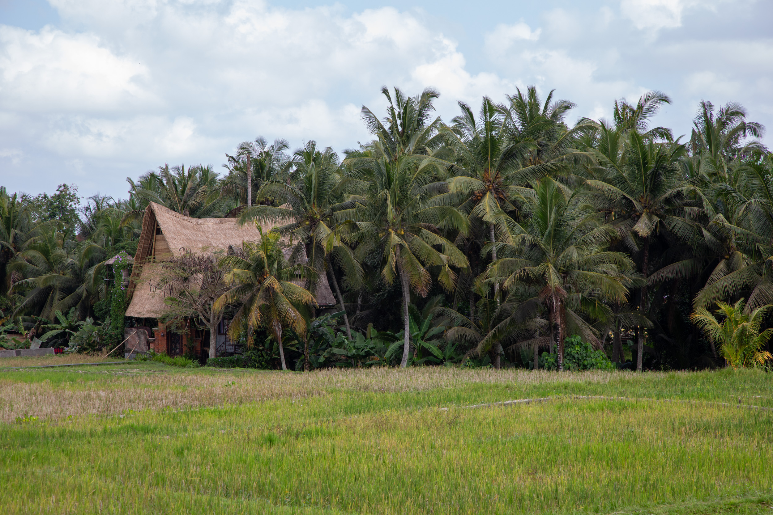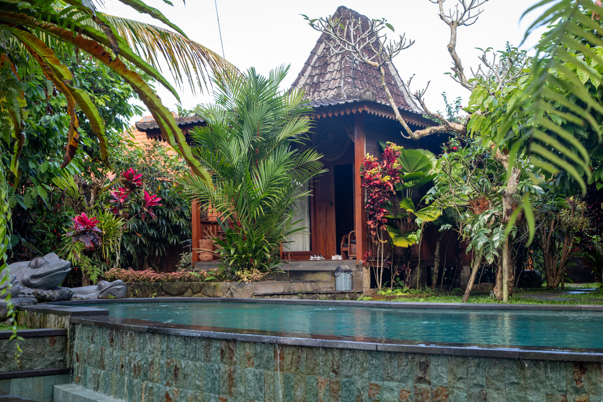 La sortie de l’aéroport de Denpasar est assez confuse, on réserve en avance un taxi pour Ubud depuis l’application Gojek, le Uber local qui fonctionne vraiment très bien. Il faut réserver sur le téléphone puis se rendre au point de rendez-vous à la sortie de l’aéroport, on donne le numéro de réservation et on attend notre tour. Le trafic est vraiment incroyable à Bali, pour parcourir les 40km qui séparent l’aéroport de Denpasar à Ubud, il faut plus d’une heure et demi alors qu’il est déjà tard en soirée ! Lorsque l’on arrive à notre hébergement, il est 22h, et les restaurants sont déjà fermés. Heureusement, l’application Gojek permet aussi la livraison à domicile. Notre hébergement est situé à la sortie d’Ubud, autour des plantations de riz, dans un endroit très calme, la vue depuis notre chambre indépendante donne sur des bananiers, il y a une cuisine extérieure et sur la terrasse, un pavillon avec un matelas, on peut dormir dehors si on n’a pas peur des insectes. Après ce long voyage jusqu’à notre destination, on se couche rapidement pour démarrer notre découverte de Bali le lendemain.