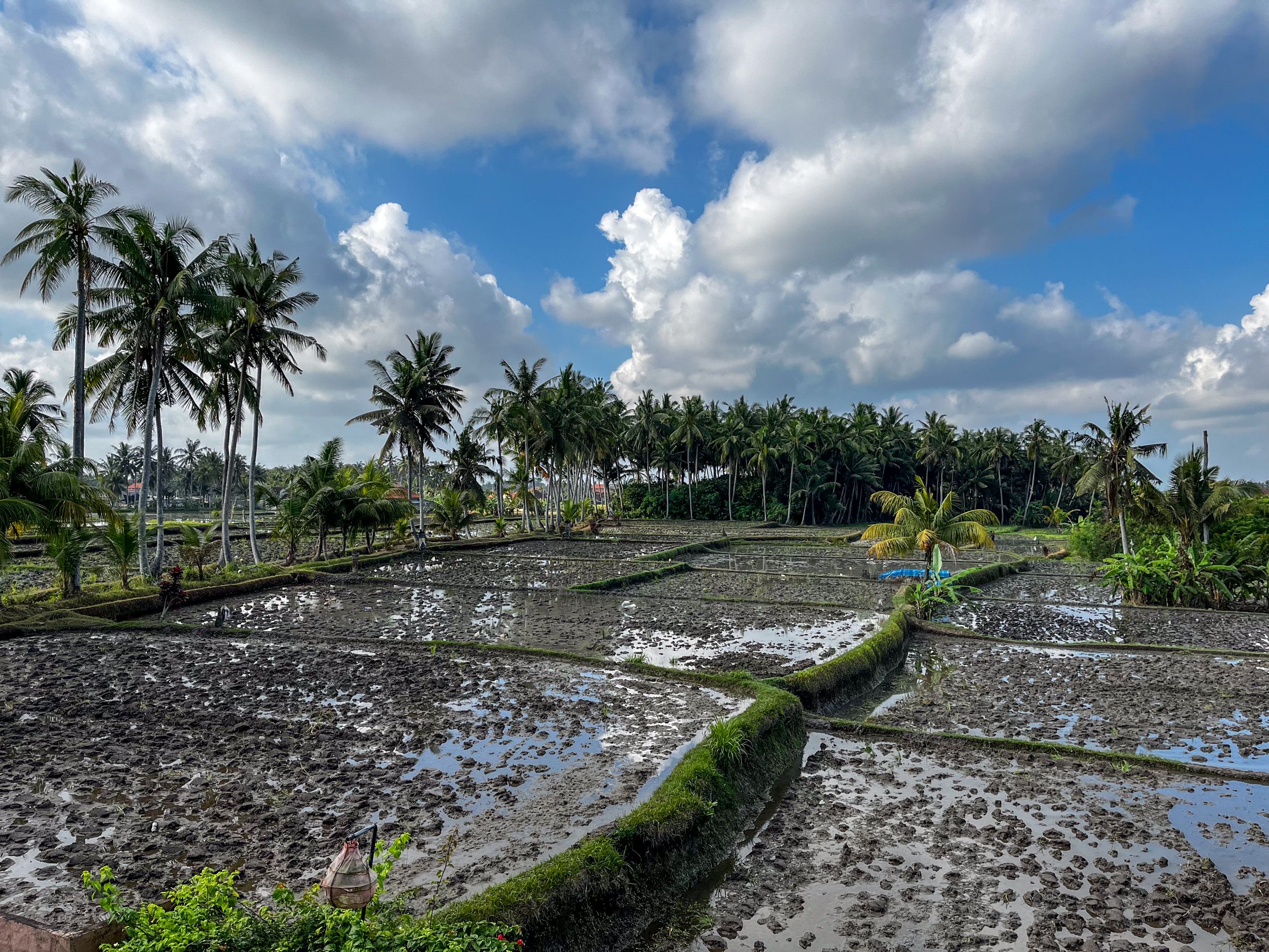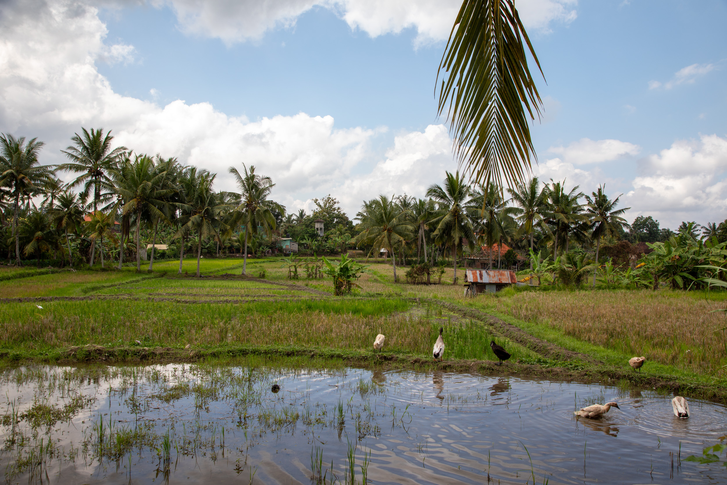 On préfère s’écarter du bruit des voitures en accédant à une zone de plantation de rizière qui se trouve à quelques dizaines de mètres du brouhaha du centre ville. Incroyable, quel changement. On marche maintenant sur un chemin planté de palmiers qui traverse les champs, l’endroit est vraiment bucolique.