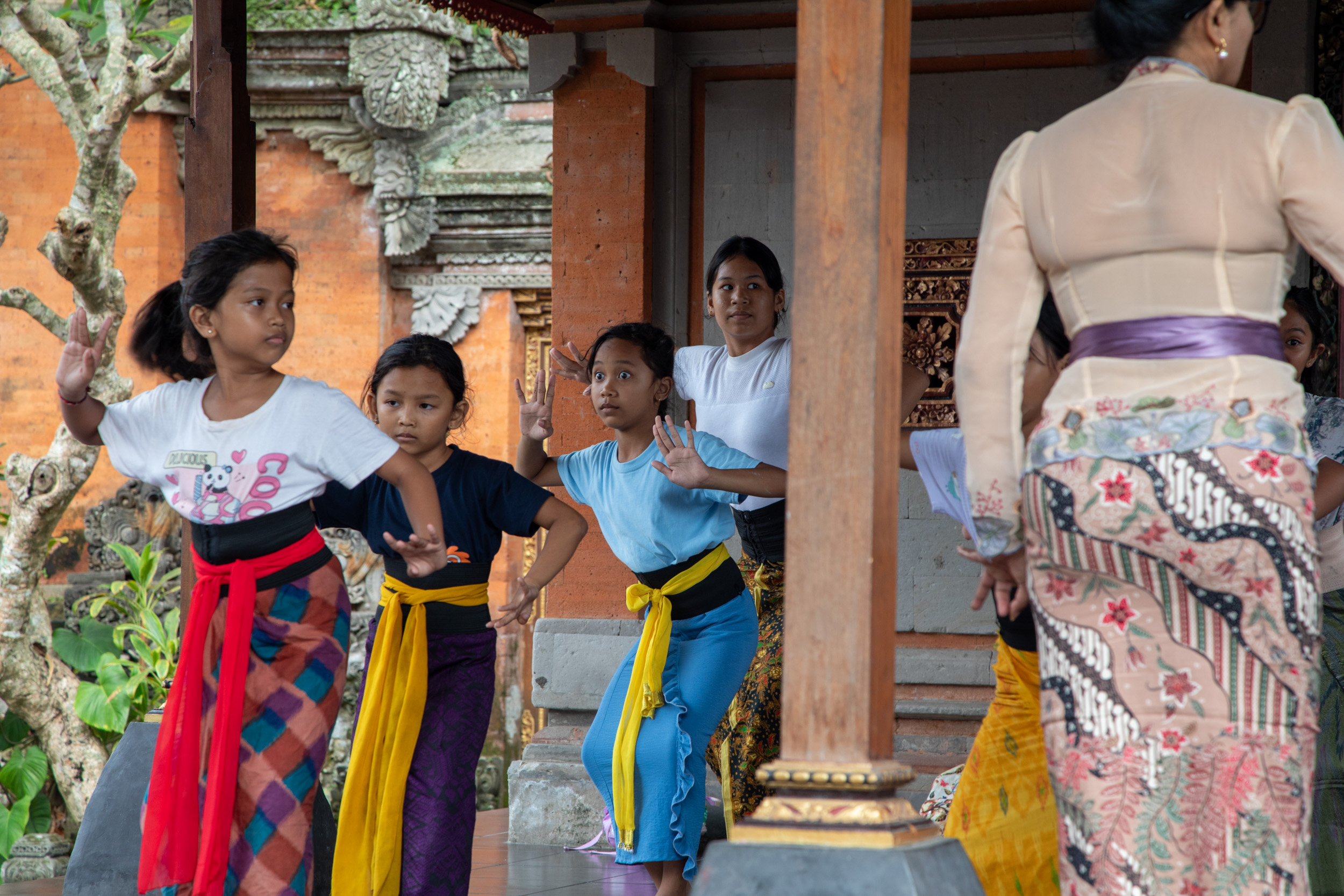 Dans le temple, il y a un pavillon où des enfants sont en train d'apprendre des danses balinaises. L'expression faciales des danseuses est fascinante avec leurs yeux qui bougent d'un côté à l'autre au rythme de la musique.