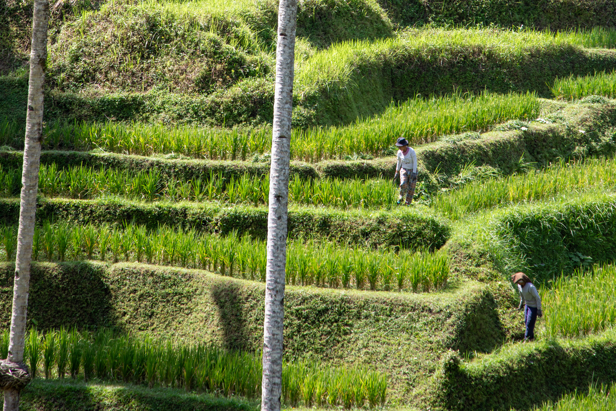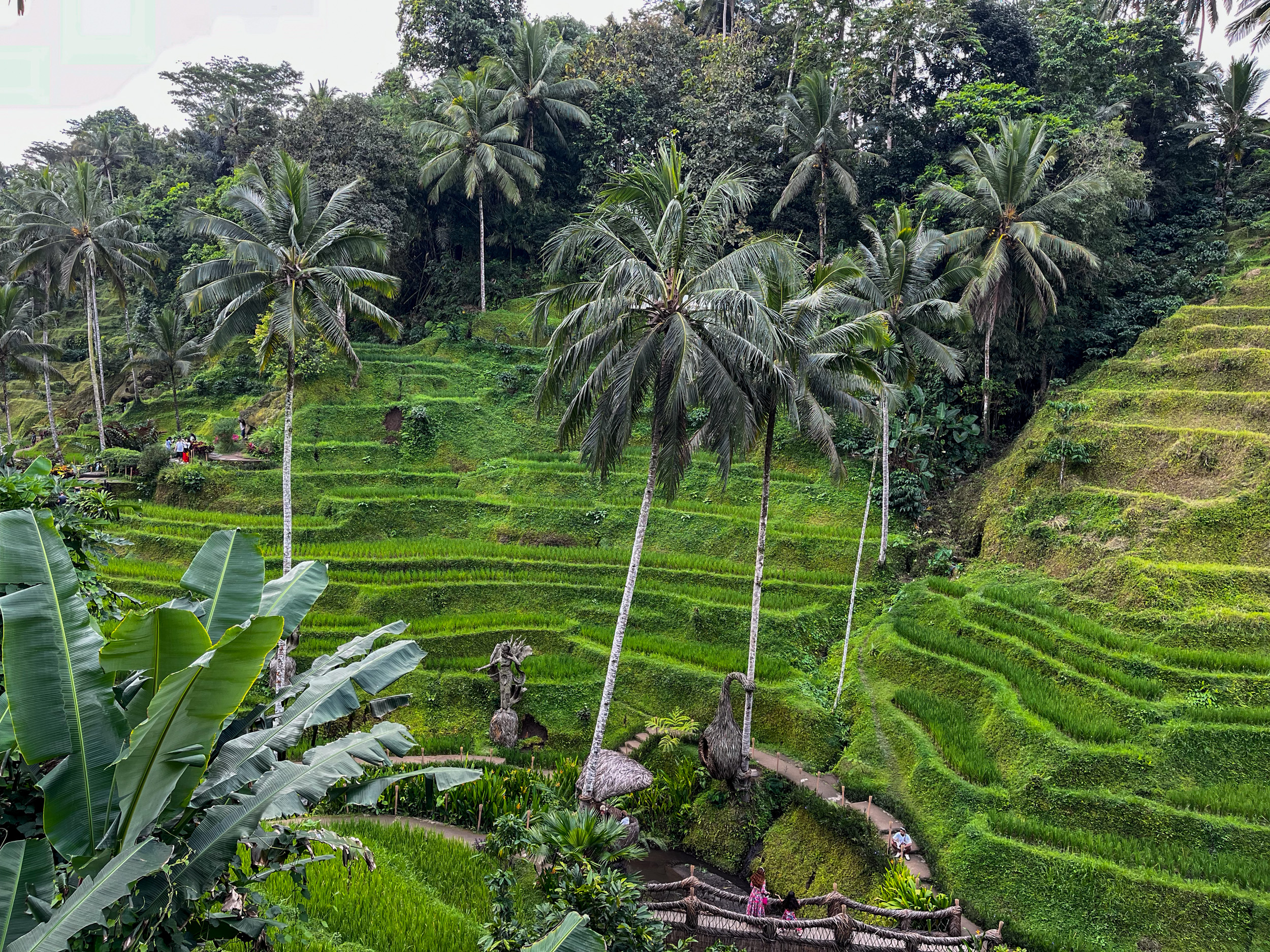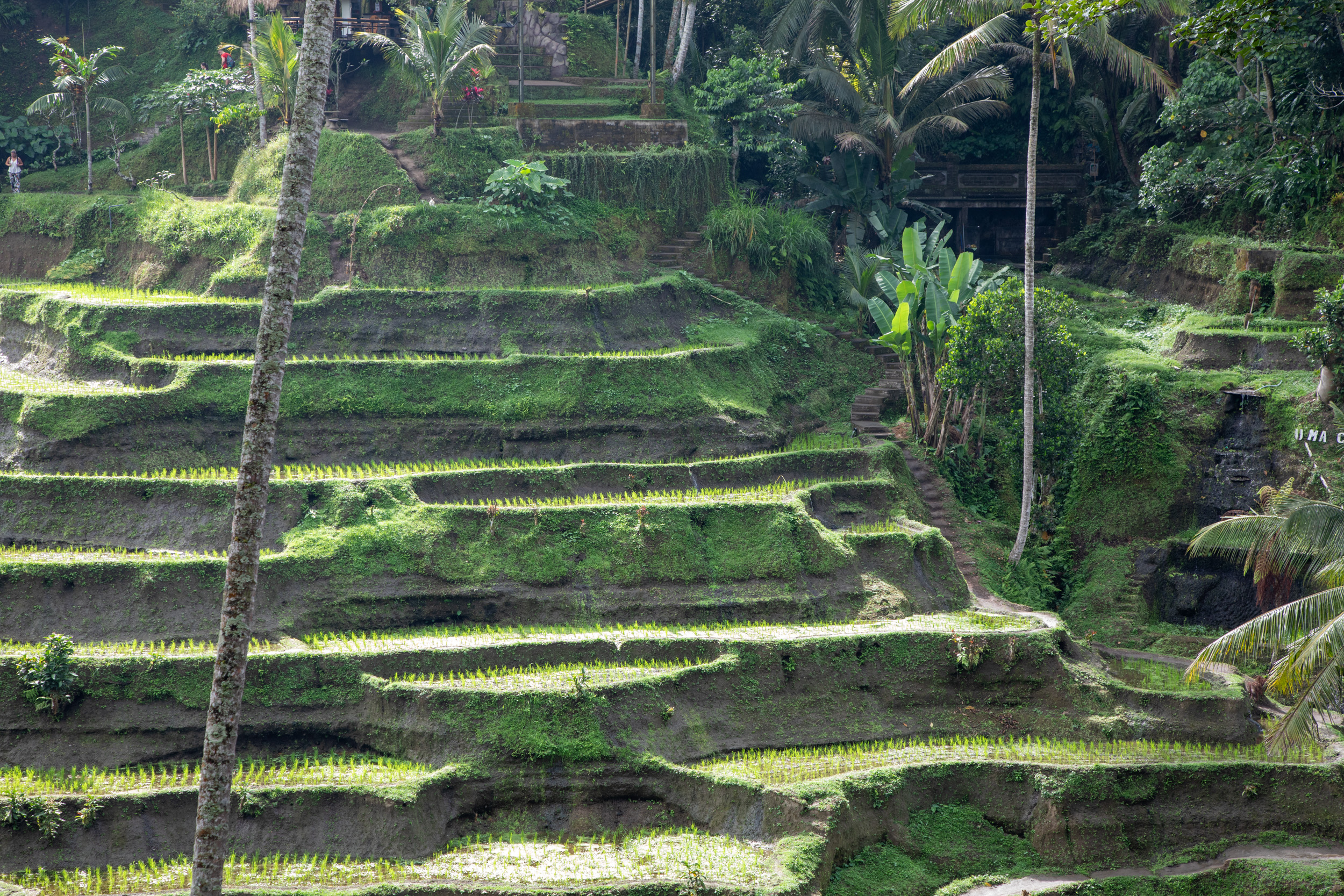 Pour le deuxième jour à Ubud, on décide de découvrir les rizières de Tegalang au Nord Est de la ville. On a loué un scooter pour circuler de manière autonome entre les différents lieux. C’est très facile de conduire à Bali, la vitesse est plutôt faible mais il y a beaucoup de trafic. On part assez tôt en matinée pour essayer d’arriver avant la foule. Il faut savoir que les rizières sont devenues une forme de business assez étonnant à Bali. Dans la région de Tegalang, il y a une succession de zones où les rizières en terrasse sont vraiment très belles. L’accès pour y pénétrer est payant et des attractions ont été rajoutées afin de pouvoir maximiser les dépenses des touristes lors de leur visite. Il ne faut pas s’attendre à une découverte d’un paysage de rizières comme on peut le voir en Chine dans le Yunnan ou le Guangxi, ici tout est fait pour que l’expérience soit fun et que les touristes y trouvent ce qu’ils ont besoin, avec restaurants, cafés, activités et même piscines. C’est un peu comme une sorte de resort je dirai. Le taxi nous dépose d’abord aux rizières de Ceking, mais il y en a plusieurs, on ne sait pas si c’est bien ou pas. Le ticket d’entrée n’est pas cher, puis on peut descendre et se promener, les rizières sont entretenues, c’est joli, il y a même des lapins qui se promènent sur le chemin.