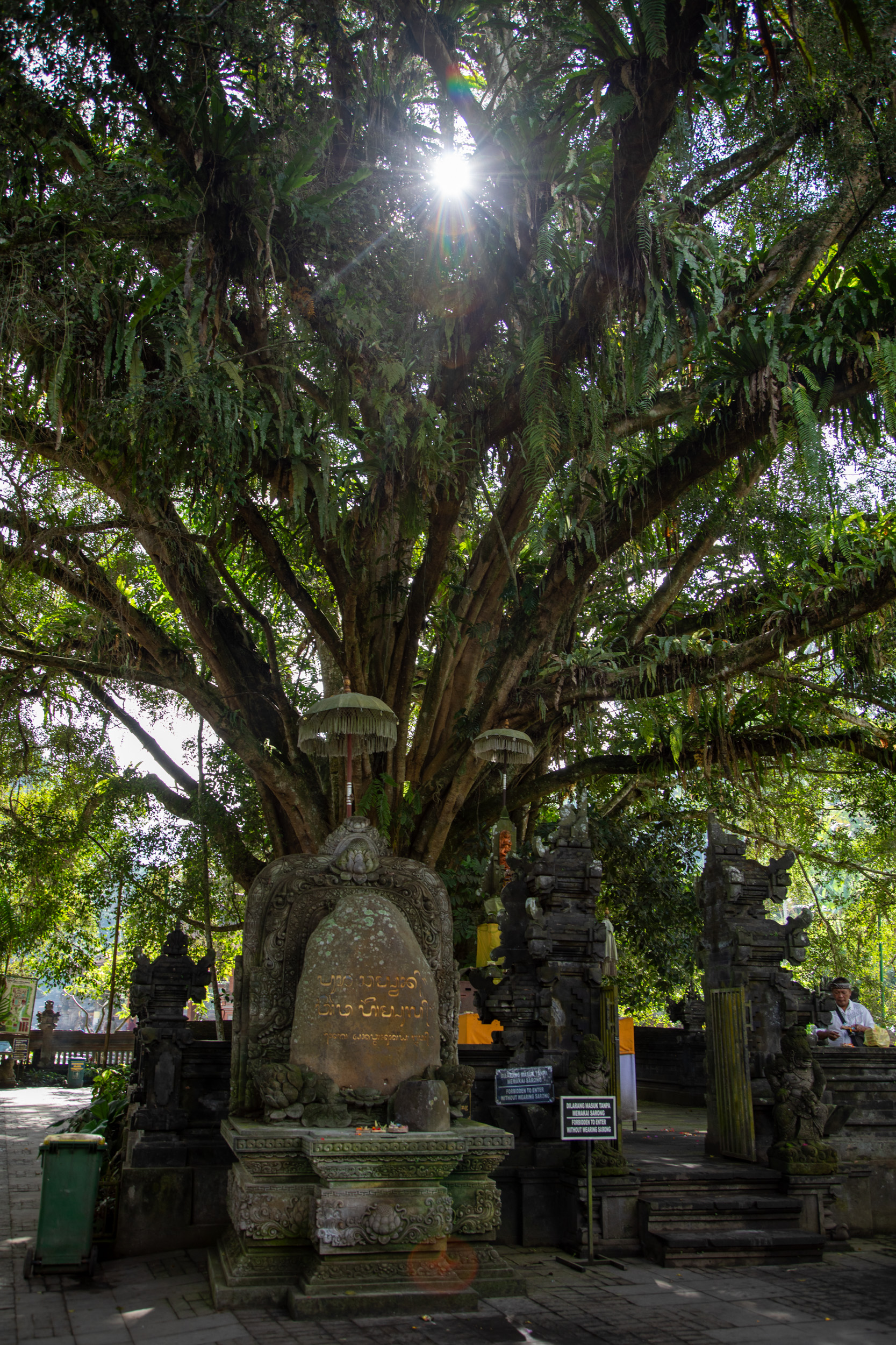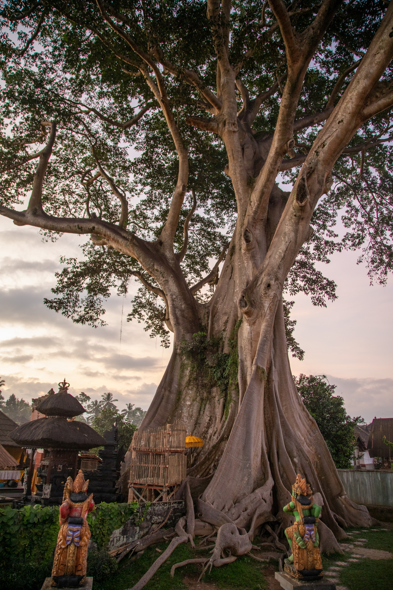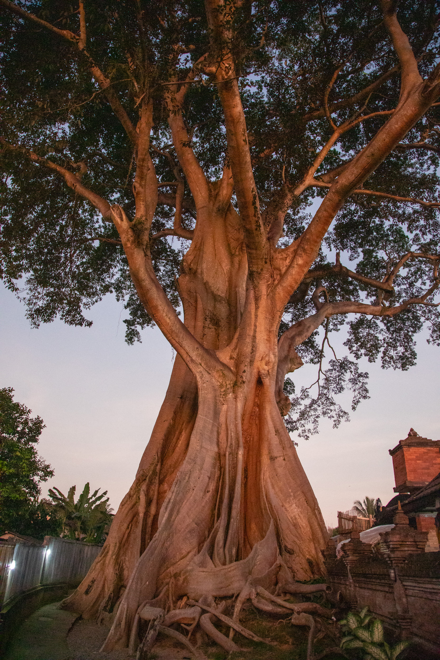 En fin de journée, on reprend les scooter pour traverser Ubud d’Est en Ouest pour aller découvrir un endroit mystique. Un vieil arbre sacré, un banyan, aux dimensions hors du commun avec un temple attenant. On arrive juste avant la tombée de la nuit et on est seul sur le site. C’est un endroit très envoutant, cet arbre multi centenaire est un site religieux hindou mais ses formes voluptueuses attirent maintenant aussi les touristes.