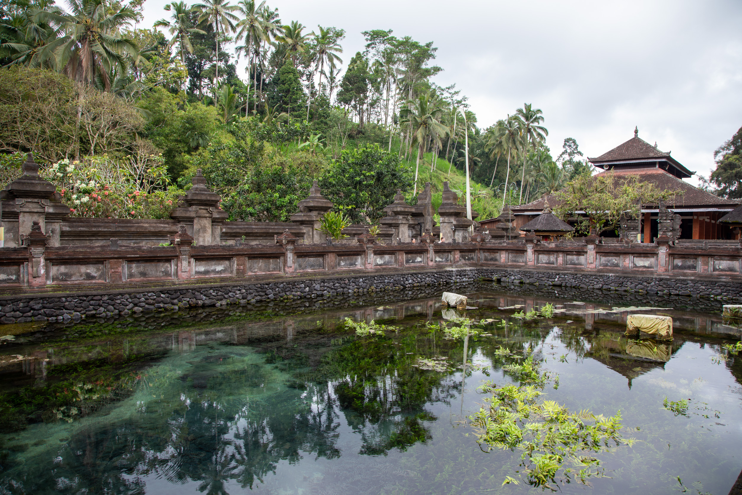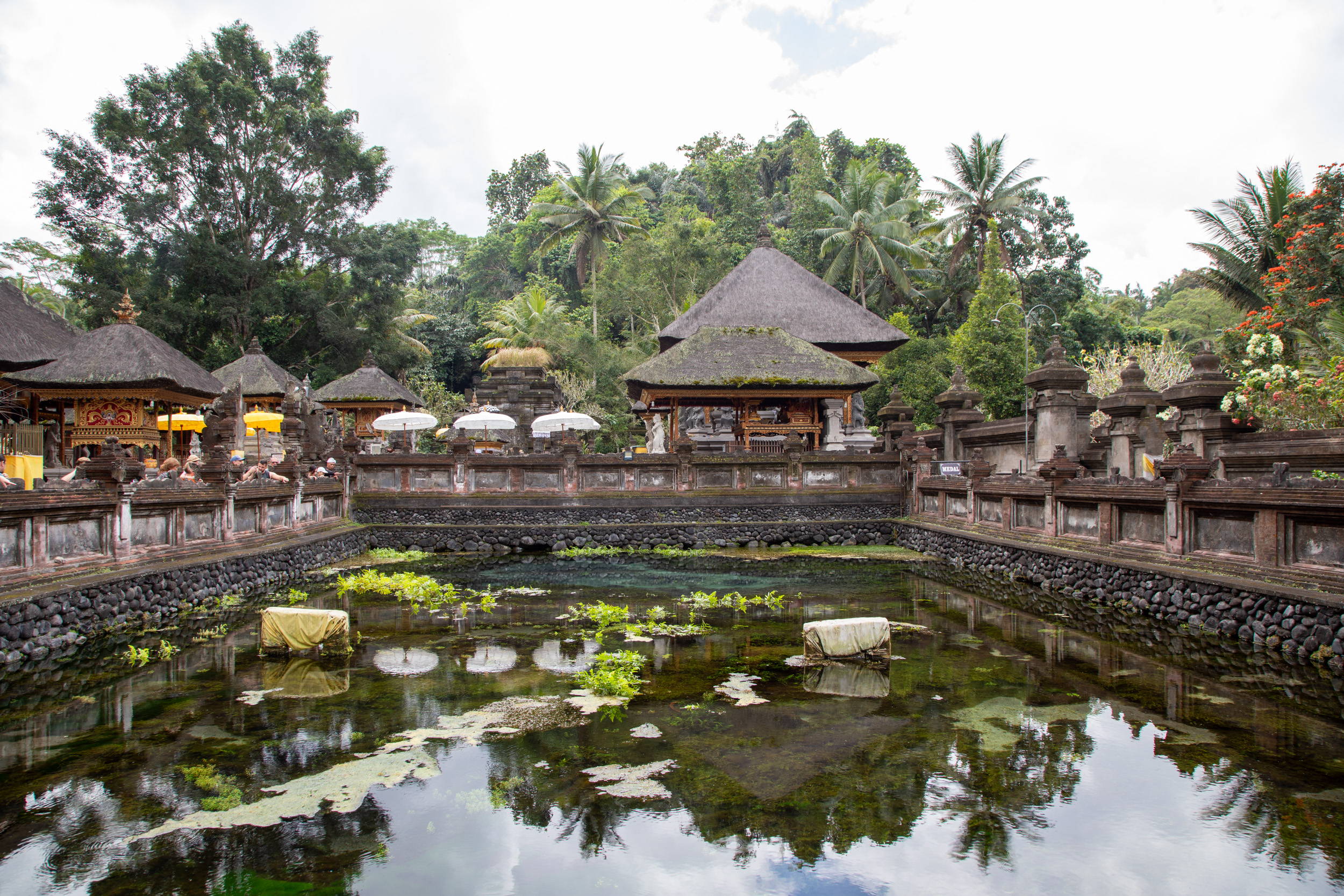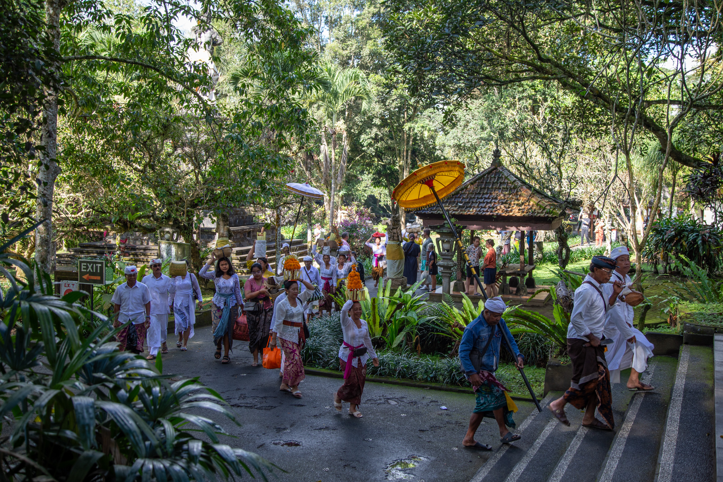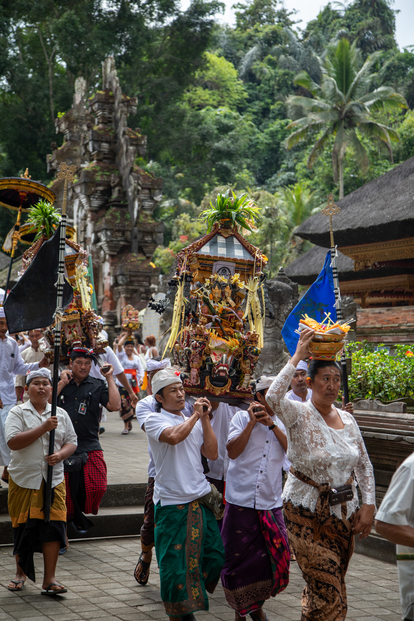 On continue notre découverte de la spiritualité hindoue balinaise, nous nous levons assez tôt pour aller rejoindre le temple de Pura Tirta Empul. Ce temple est réputé pour ses bains pour les rituels de purification. On arrive et il y a déjà beaucoup d’animation avec des processions.