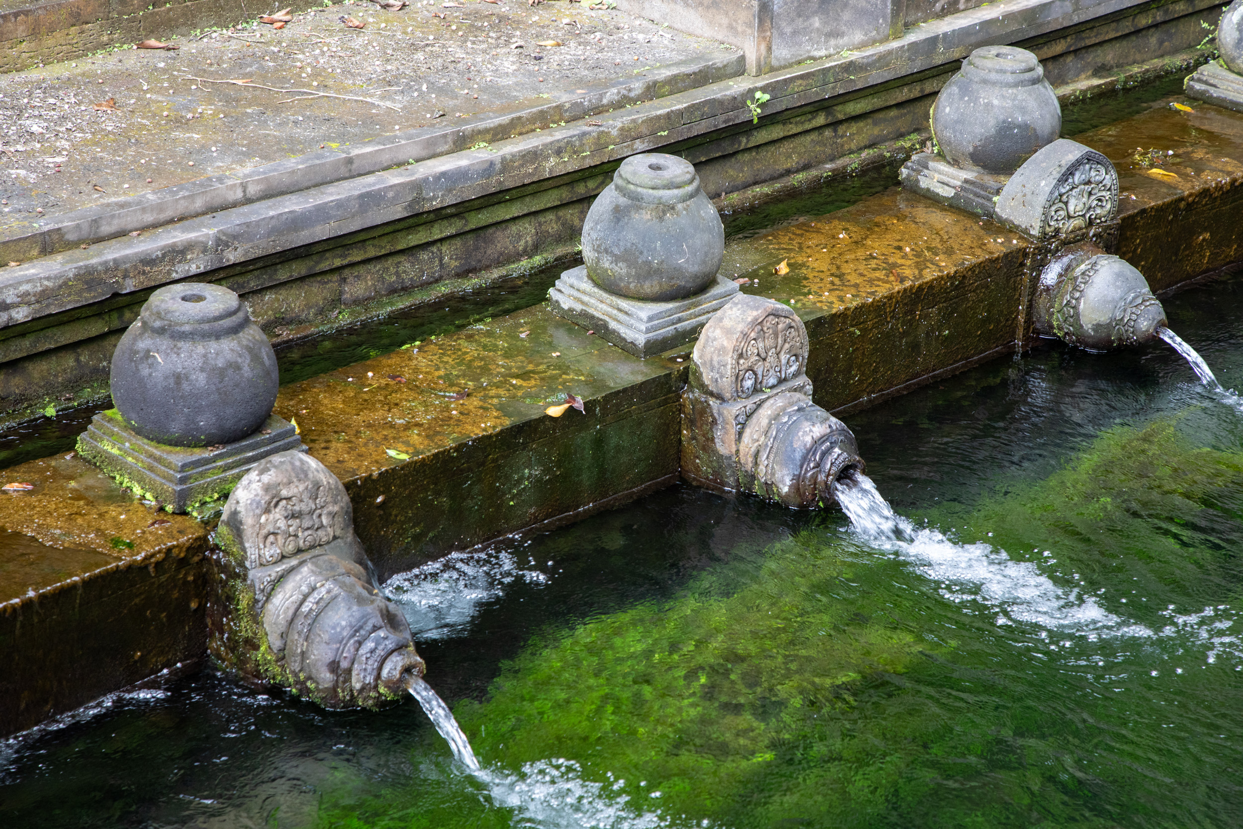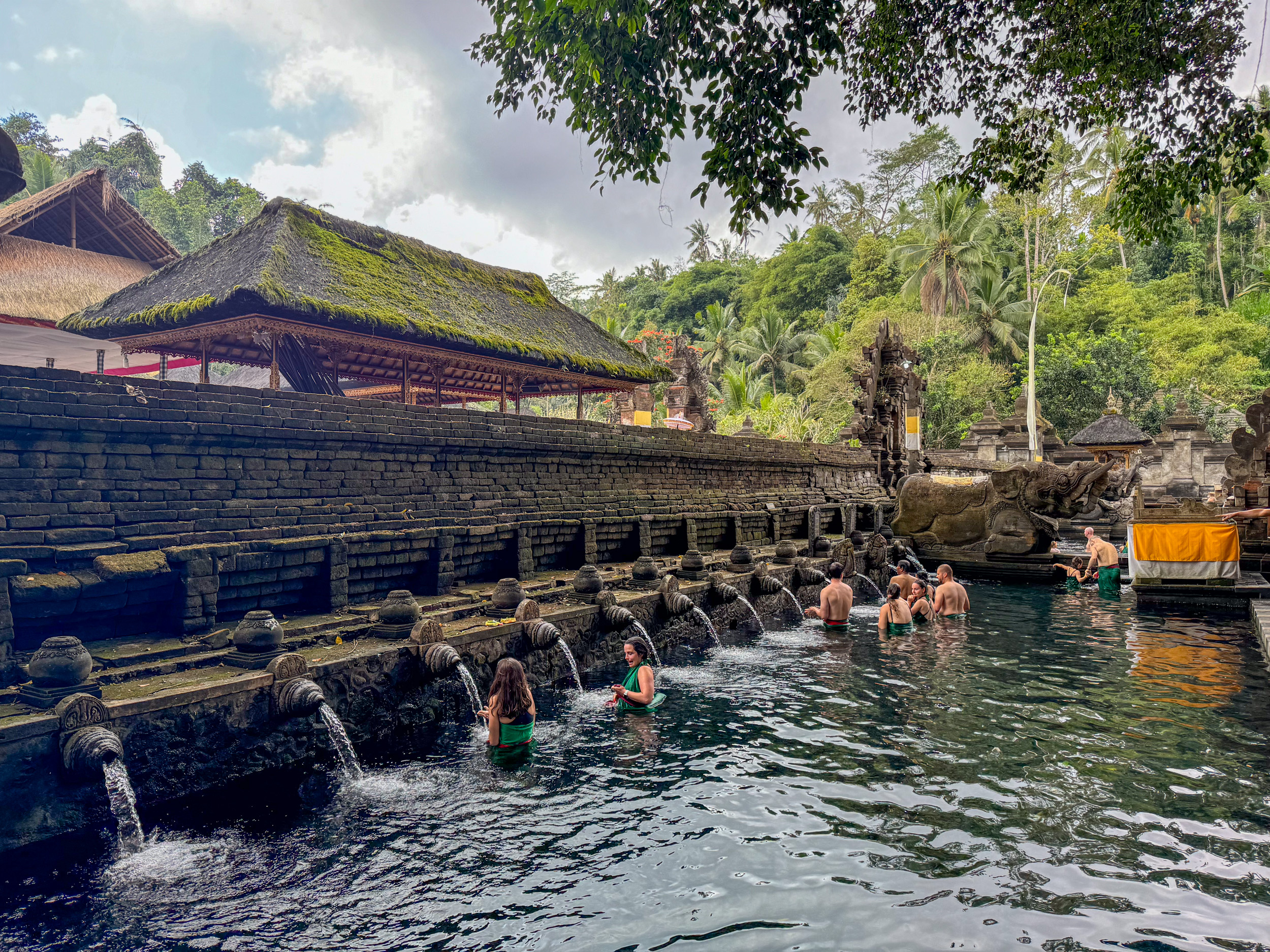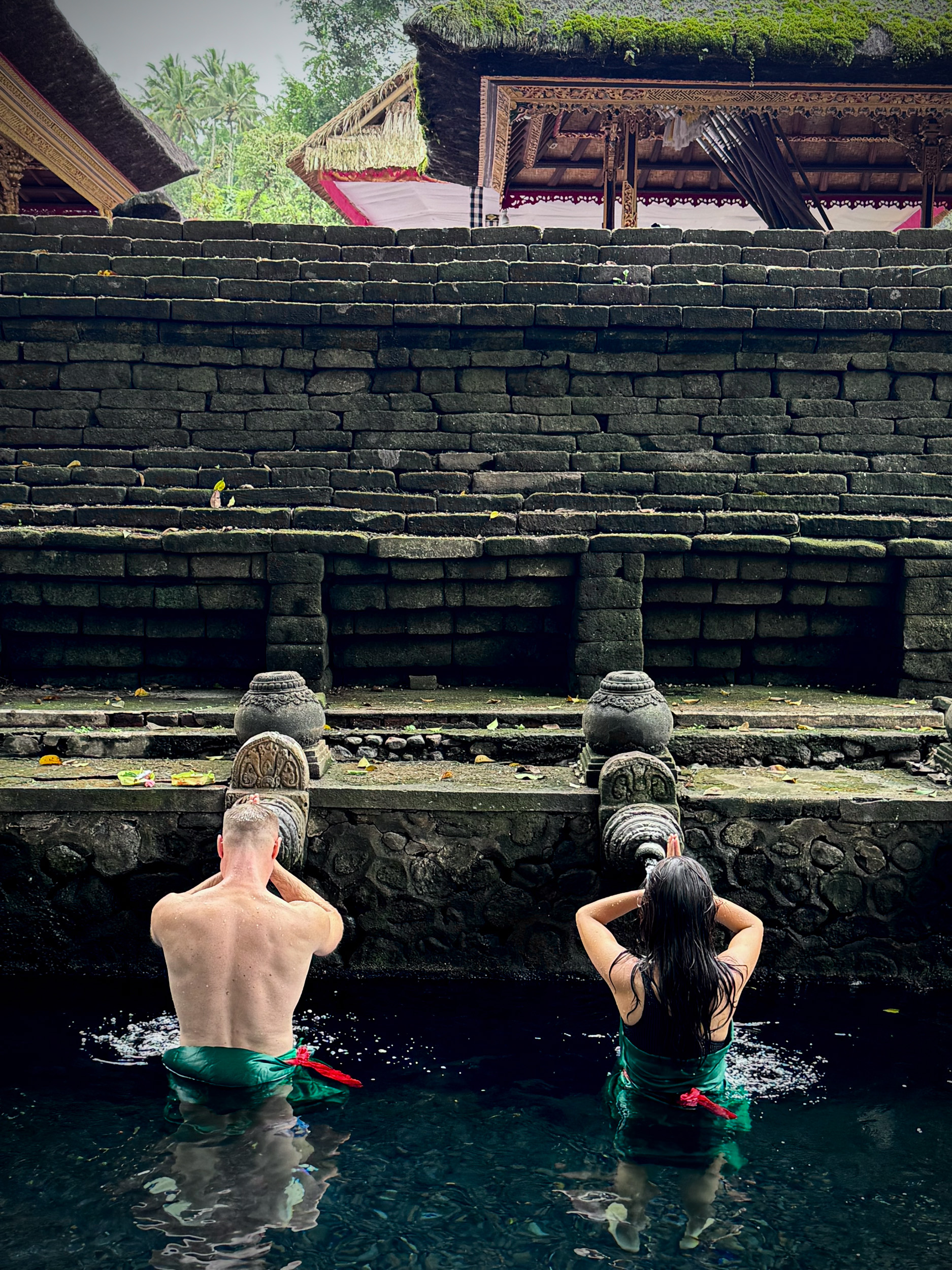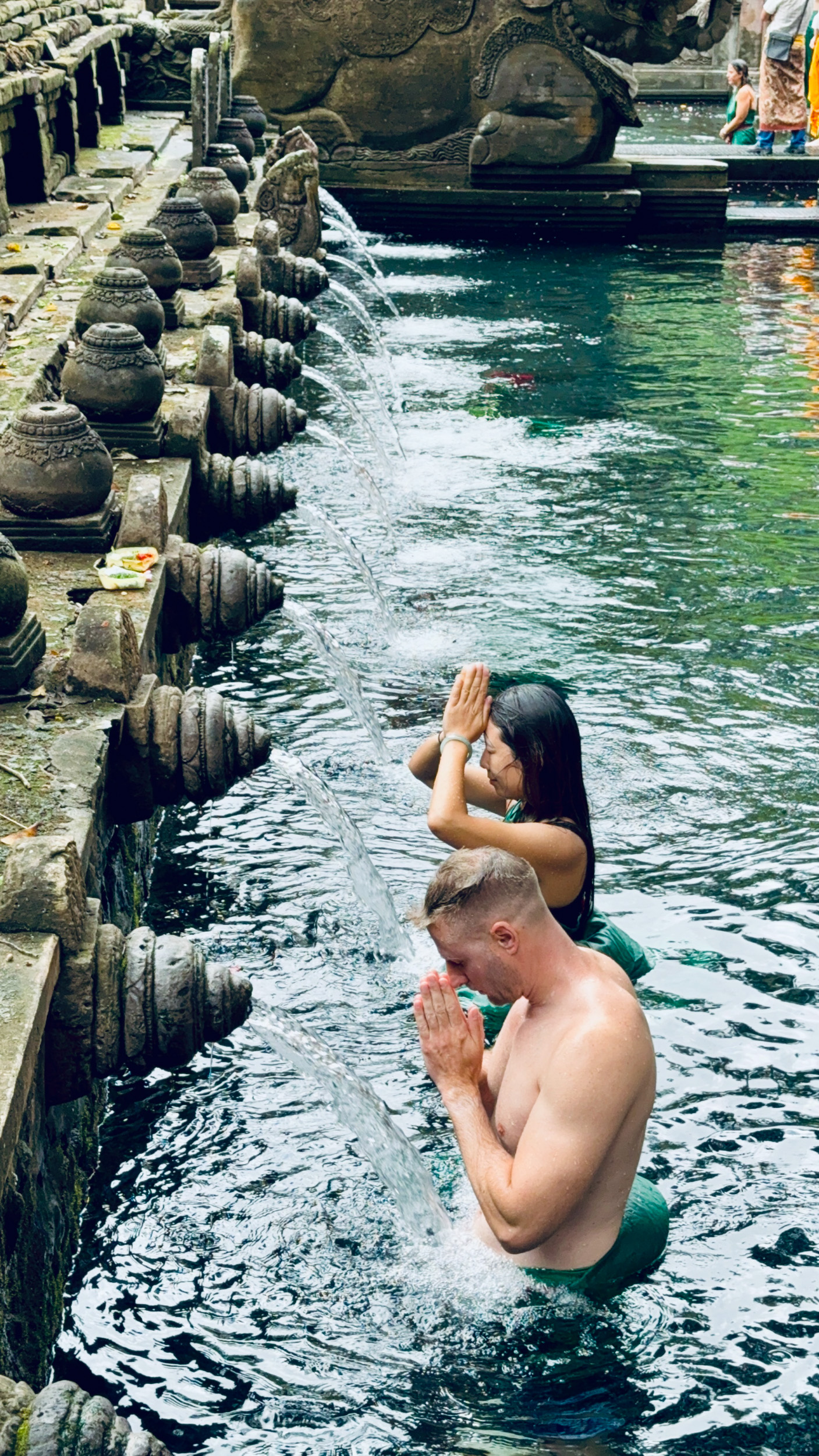 On suit le mouvement, il est possible pour les touristes non hindous d’effectuer aussi le rituel. Pour cela, il faut changer de sarong dans les vestiaires puis s’approcher des bains.